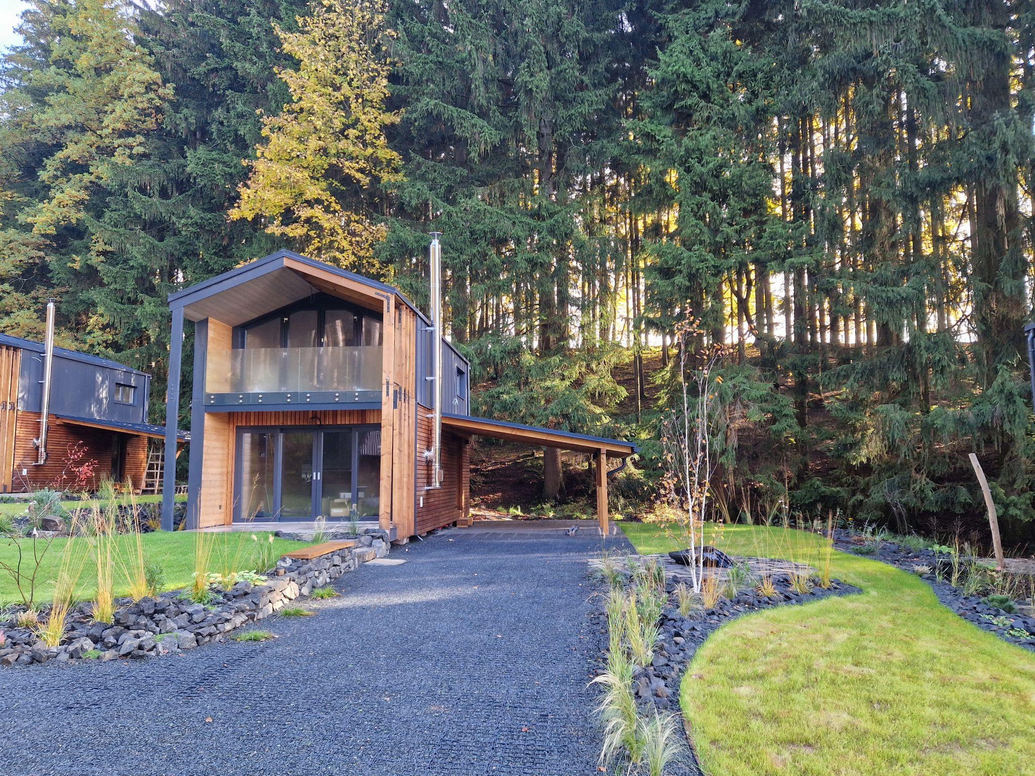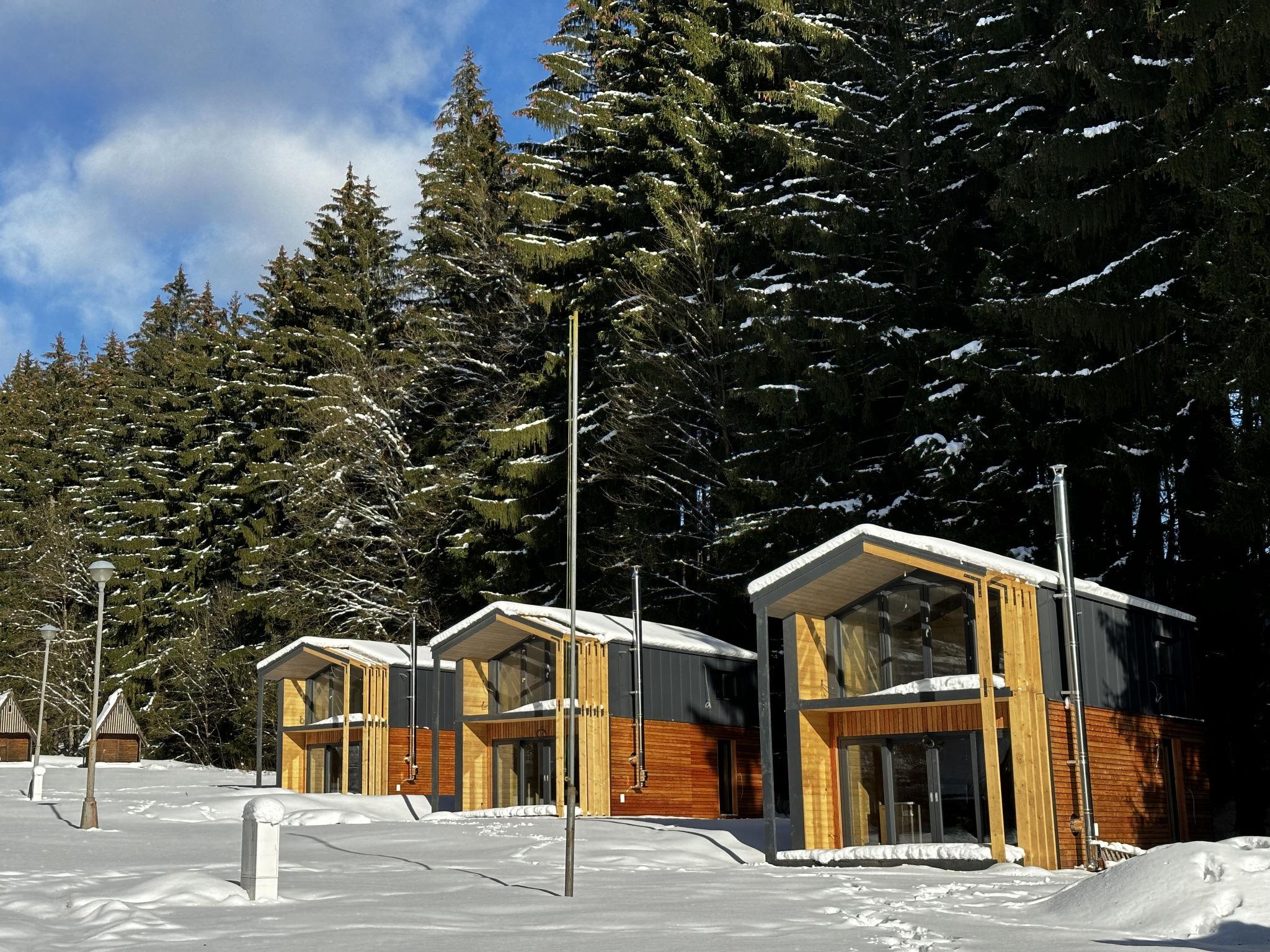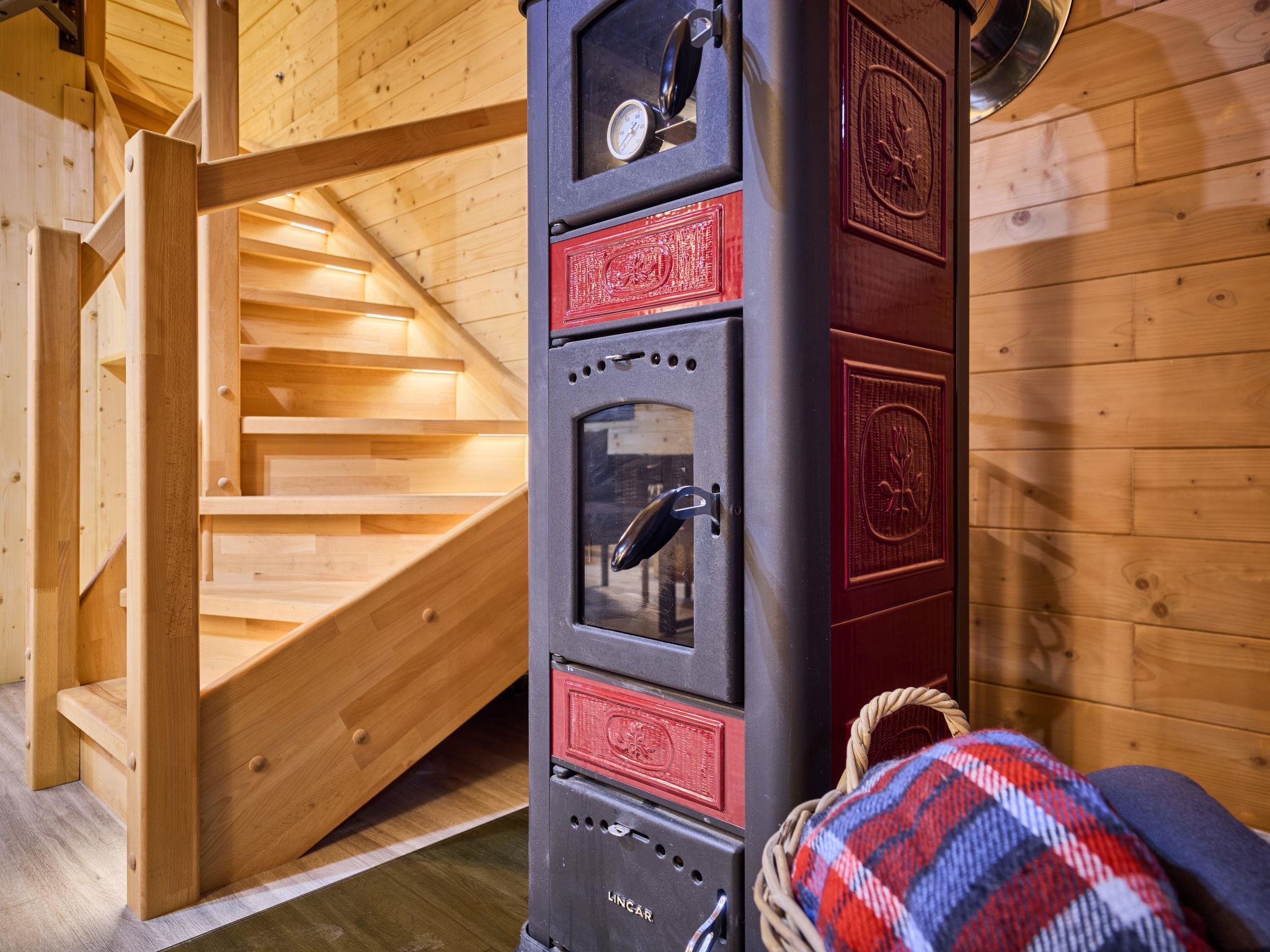"Luxe Timber Lodge & Relaxing Bath", 3-room chalet. Very beautiful and tasteful furnishings: living/dining room with 1 sofabed, Scandinavian wood stove, dining table and TV. Kitchenette (2 hot plates, oven, dishwasher, toaster, kettle, microwave, electric coffee machine, Capsules for coffee machine (Tchibo)). Bath/WC. Electric heating, wood heating, floor heating. Upper floor: 1 room with 1 double bed. 1 room with 2 beds. Exit to the balcony. Balcony. Balcony furniture, barbecue. Facilities: Internet (WiFi, free). Please note: suitable for families. Non-smoking house. Built-in bluetooth audio system and central touch control of lighting and temperature conveniently from the living room.