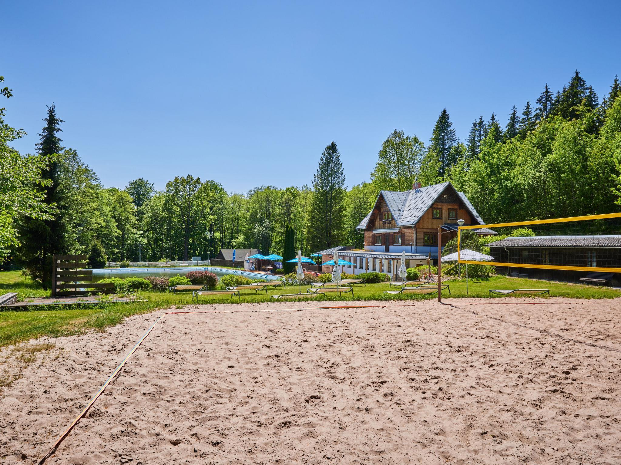 Very beautiful chalet "Luxe Timber Lodge & Relaxing Bath", 2 storeys, detached, built in 2023. 7 houses in the resort. Outside the resort, in a quiet, sunny position, 5 m from the edge of the forest, 2 km from the skiing area. For shared use: natural state property, lawn for sunbathing, swimming pool (seasonal availability: 26.Jun. - 03.Sep.). Shower/WC in the pool area, table tennis, boccia, badminton, beach volleyball, barbecue, fireplace. Private: patio, fireplace. In the complex: WiFi, billiard table, storage room for bicycles, sun terrace, storage room for skis. Roofed, parking at the house. E-charging station. Grocery 1.5 km, shopping centre 6 km, restaurant 5.5 km, bus stop "Mladé Buky" 1.5 km, railway station "Mladé Buky" 1.5 km, indoor swimming pool 10 km. Golf course (18 hole) 4 km, riding stable 3.5 km, walking paths from the house, cycle lane 50 m, ski rental 2.5 km, ski bus stop 50 m, ski school 2.5 km, children's ski school 2.5 km, sled run 2 km, cross country ski track 500 m, children's playground 50 m. Nearby attractions: zábavní park Balduv svet, 2.5 km, Rozhledna Eliška, tvrz Stachelberg 9 km, Stezka Korunami stromu Janské Lázne 10 km, Lanovka na Snežku, Pec pod Snežkou 18 km, Zoo Dvur Králové, Adršpach 28 km, Vyhlídkové lety Vrchlabí, Kuks 30 km. Well-known ski regions can easily be reached: Mladé Buky 2 km, Janské Lázne 9 km, Cerný Dul, Pec-Cerná hora 15 km. Hiking paths: Krkonošský národní park.