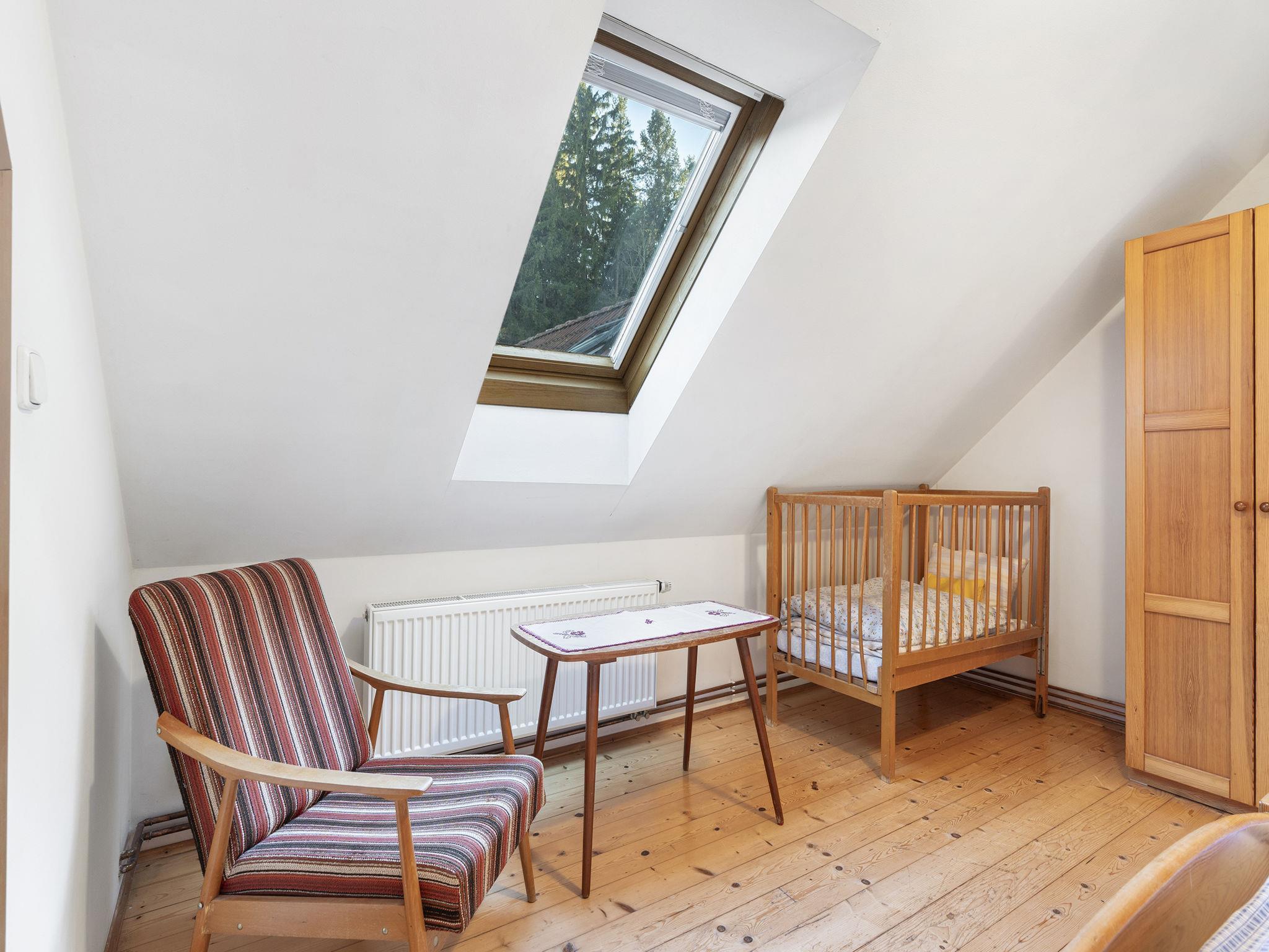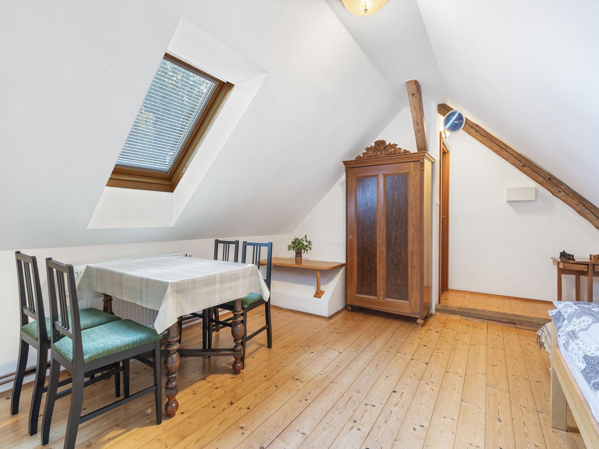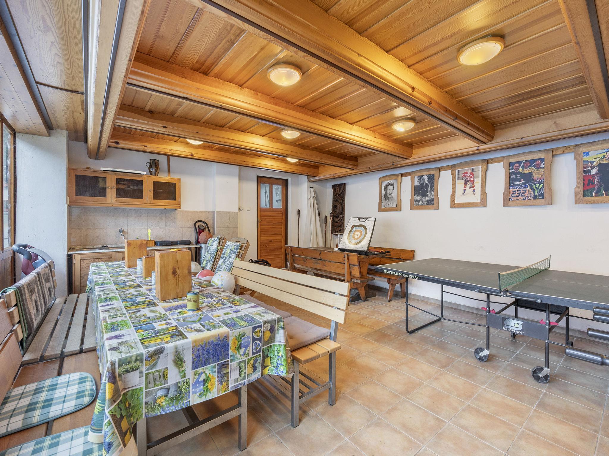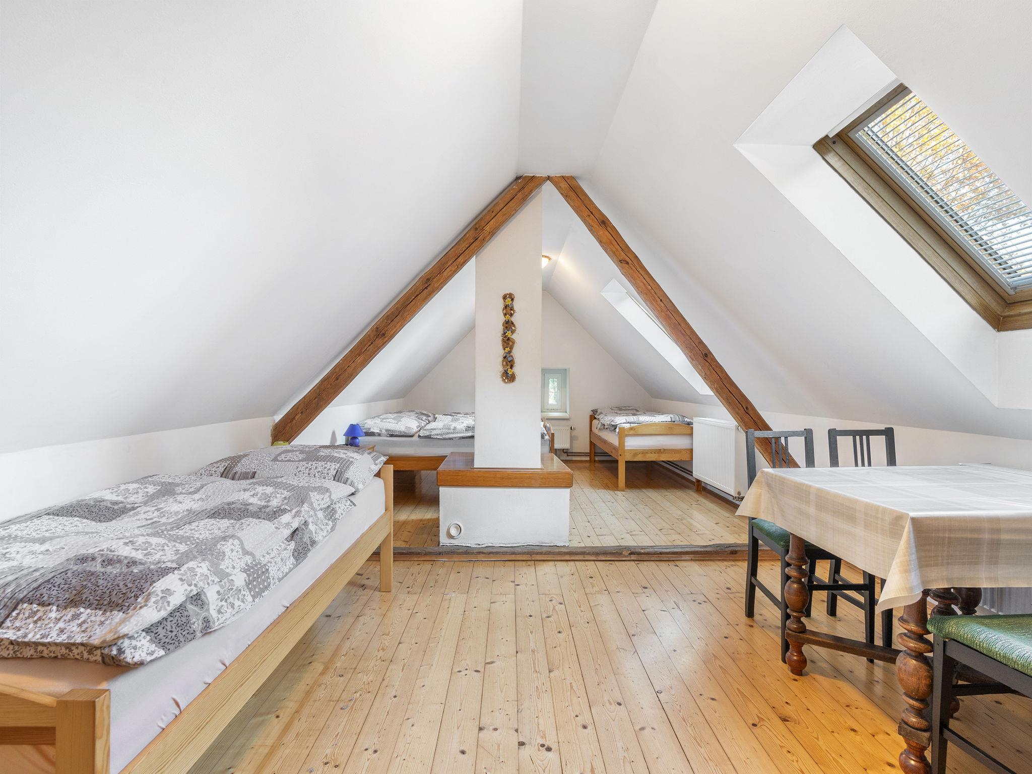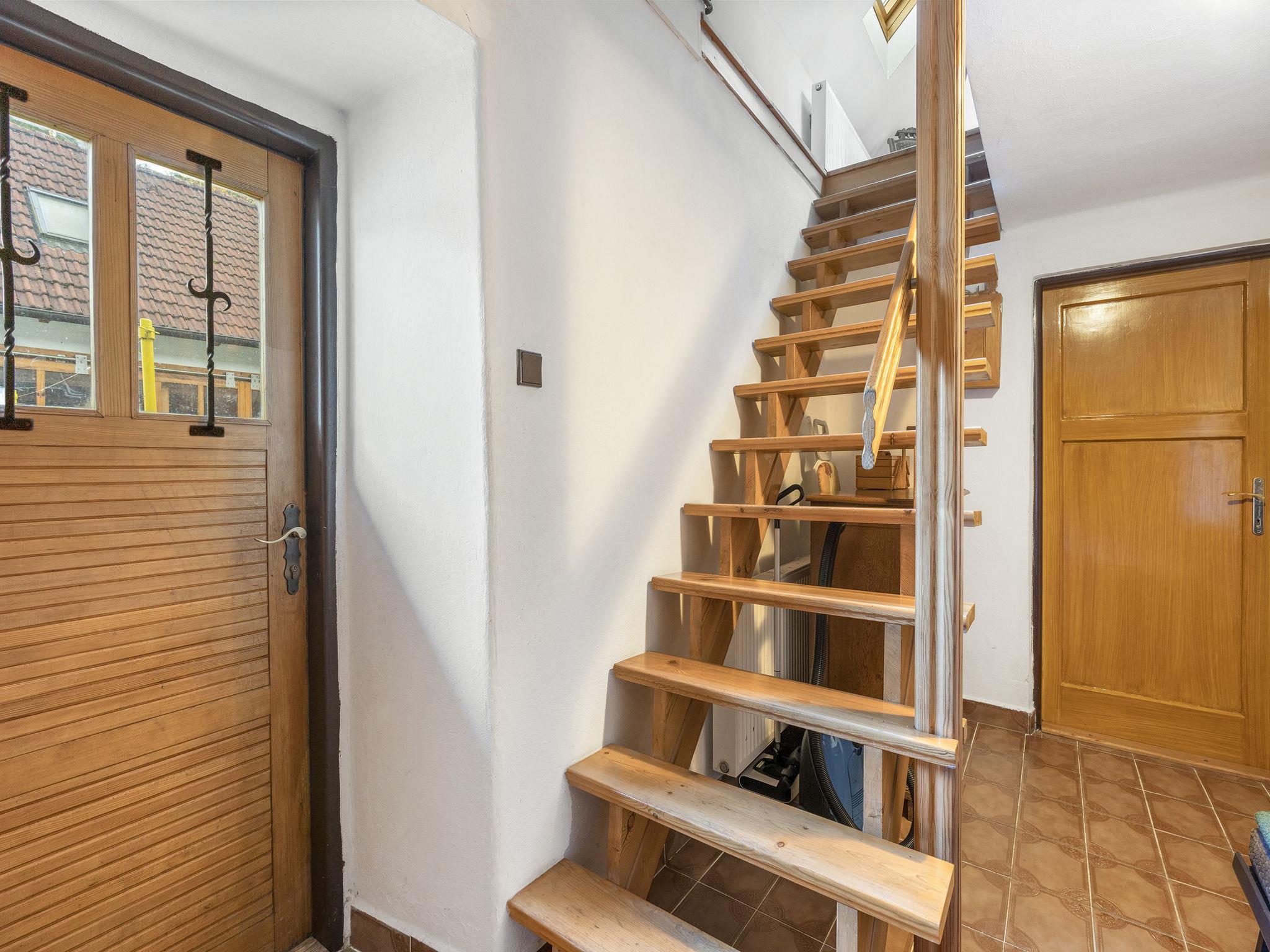 "Polžov", 5-room house 129 m2 on 2 levels. Spacious, cosy furnishings: living room with 1 sofabed, Scandinavian wood stove, satellite TV, radio and CD-player. 1 room with 2 beds. Playroom. Kitchen (4 hot plates, oven, dishwasher, kettle, microwave, electric coffee machine). Shower/WC. Upper floor: 1 room with sloping ceilings with 1 double bed. 1 room with sloping ceilings with 2 beds and 1 double bed. Shower/WC. Electric heating, wood heating. Terrace. Terrace furniture. Facilities: washing machine. Internet (WiFi, free). Suitable for families. Maximum 2 pets/ dogs allowed. Playroom is a house with its own entrance through the yard with the table tennis, table football, seating and toilet.