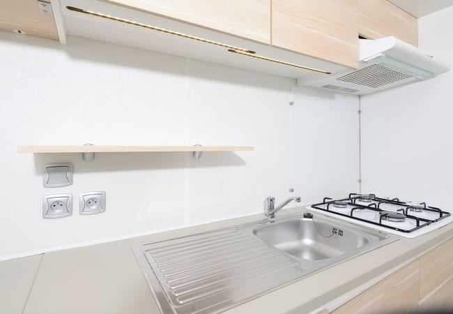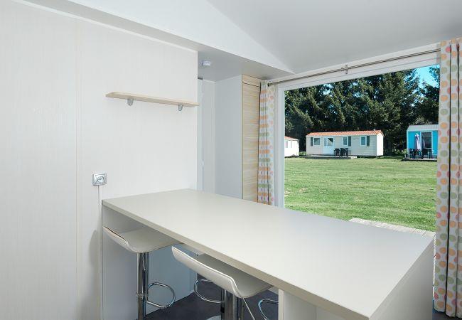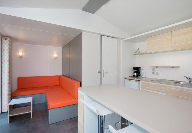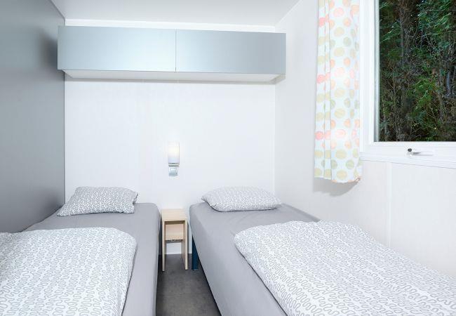 This modern mobile home is equipped with all conveniences and offers plenty of comfort for a relaxing holiday. With an area of 32 m², there is enough space for four adults and two children. The mobile home has two bedrooms: one with a lovely double bed and one with two single beds. For the children, there is additional sleeping space in the living room.