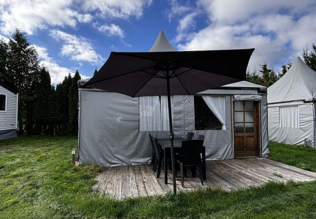 Inside the tent you will find everything you need for a carefree holiday. The atmospherically furnished kitchen is equipped with a refrigerator, gas stove, kettle, coffee maker, crockery, cutlery and a pan set..