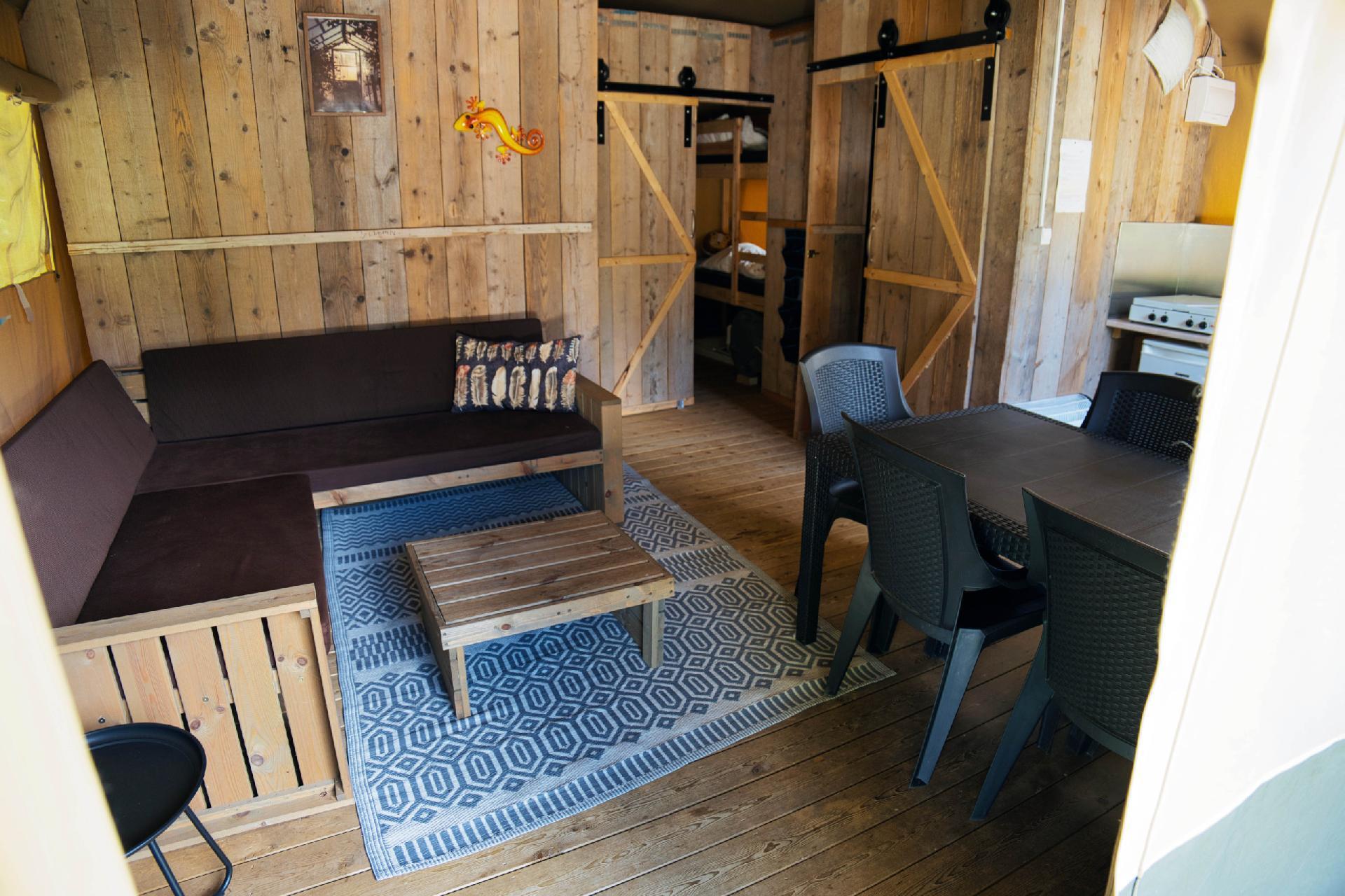 Every safari tent is situated on a wooden platform of 45 m² and features an atmospheric living space with a seating area and dining table. You have access to your own kitchen and a private bathroom with shower, toilet and washbasin. The tent has two bedrooms: one with a comfortable double boxspring bed and one with two bunk beds, ideal for families or small groups. Outside, a spacious terrace with a picnic table awaits, where you can enjoy the surroundings late into the evening.
