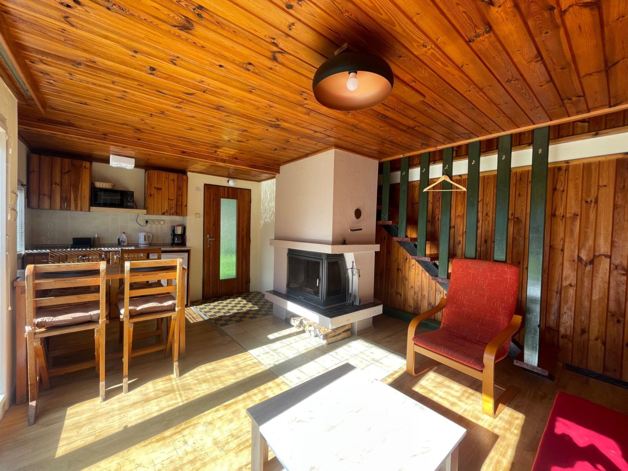 2-room house 41 m2 on 2 levels. Simple and beautiful furnishings: living/dining room 22 m2 with 1 sofabed, open-hearth fireplace and satellite TV (flat screen), radio. Exit to the terrace. Kitchenette (2 hot plates, toaster, kettle, electric coffee machine). Shower/WC. Electric heating. Upper floor: gallery 8 m2, with sloping ceilings with 1 bed. 1 double bedroom 8 m2, with sloping ceilings. Parking (fenced). Please note: suitable for families. Maximum 1 small pet/ dog allowed. TV only CS, AT. Instead of an enclosed bedroom, some sleeping areas are located in an open-plan area (gallery, alcove, etc.).