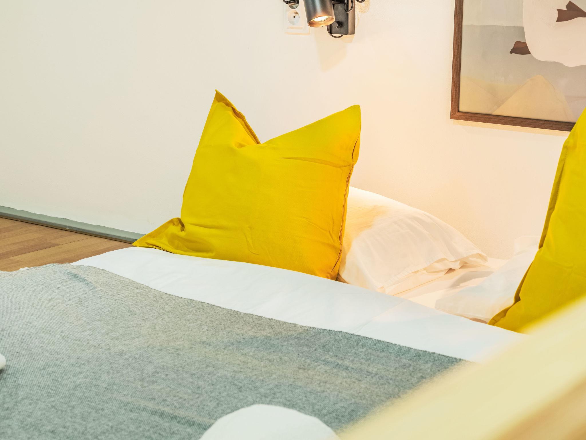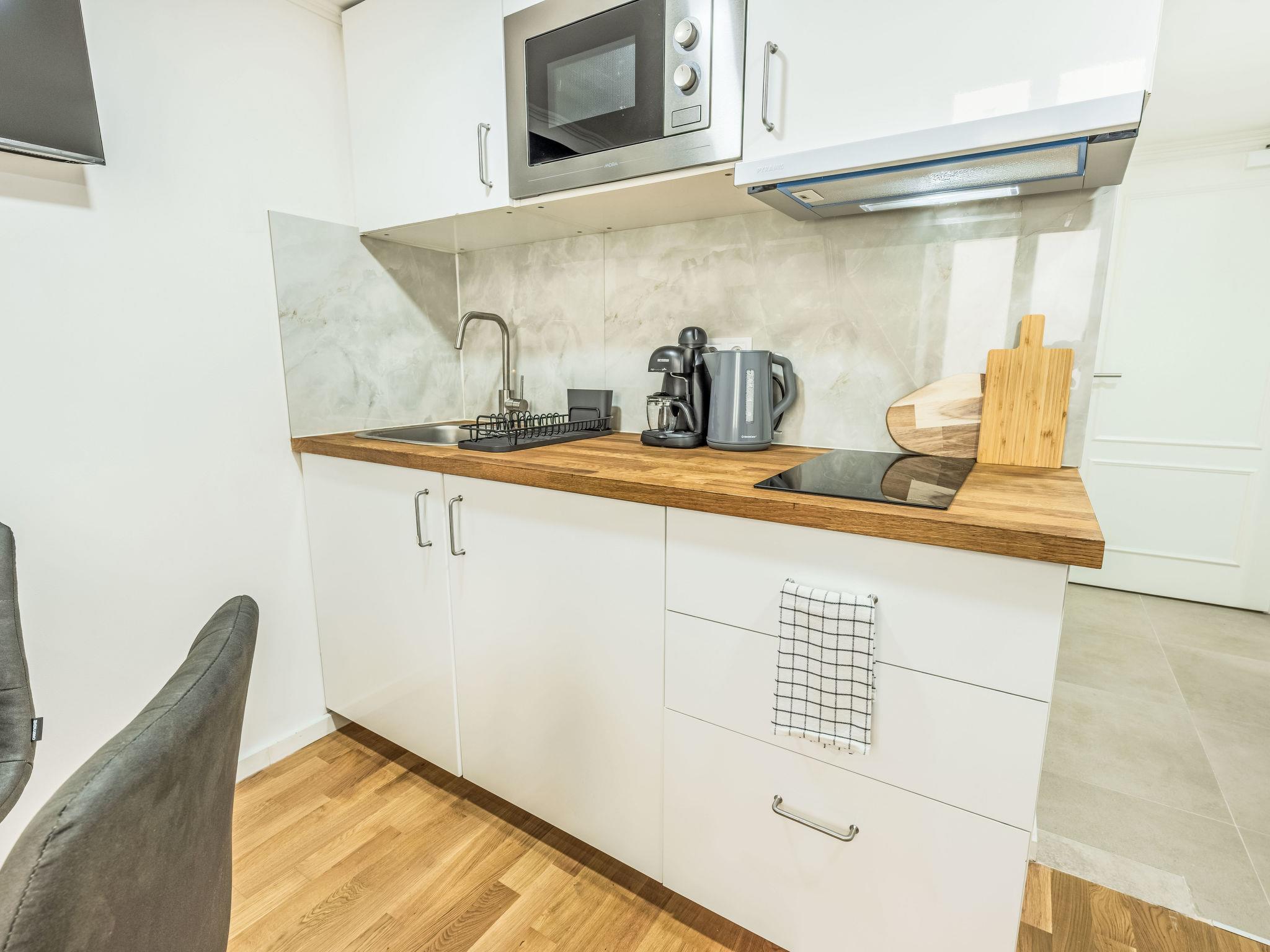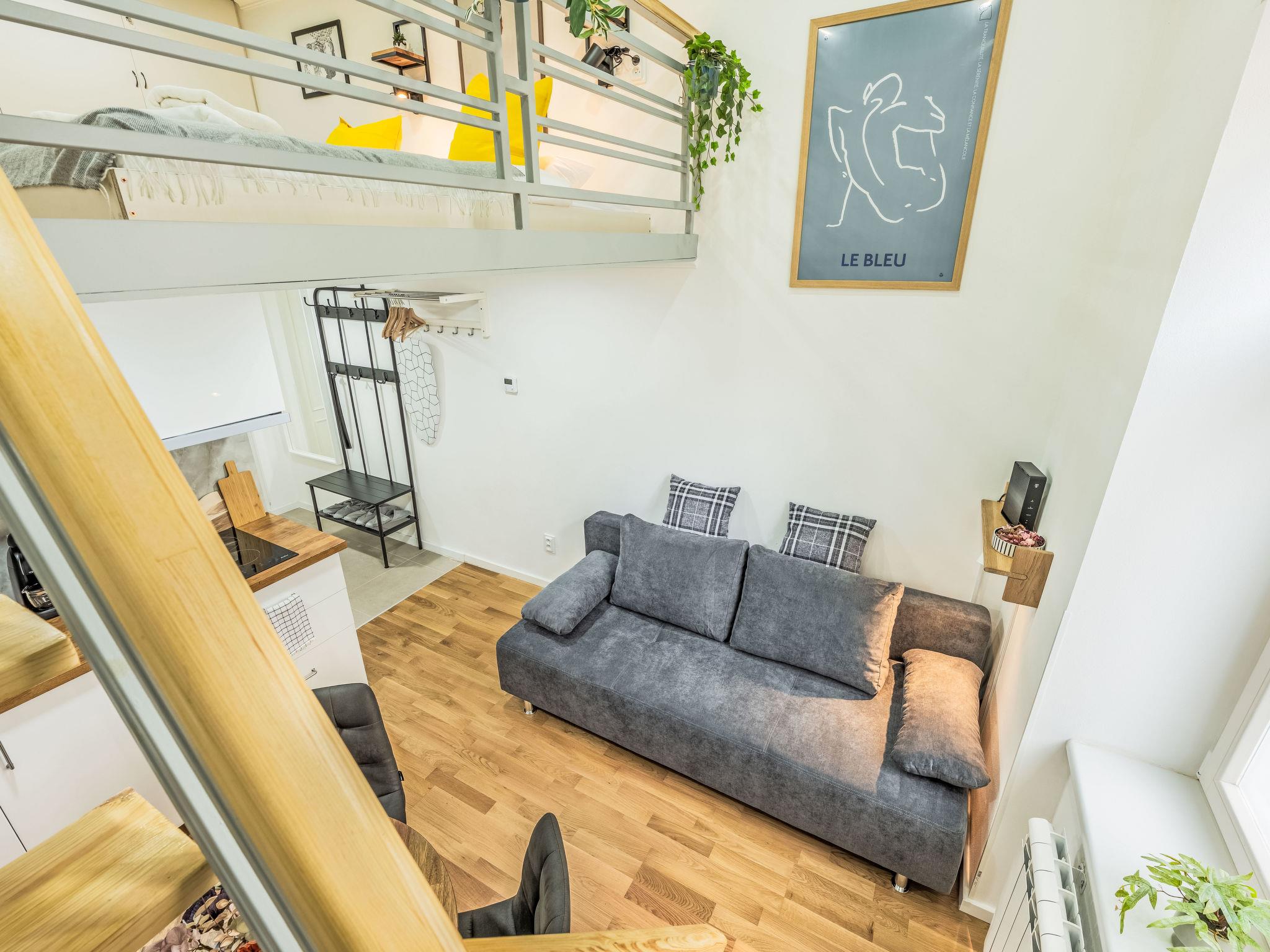 2-room apartment 30 m2 on 3rd floor. Bright, fully renovated, very beautiful and modern furnishings: entrance hall. Living/dining room with 1 double sofabed (150 cm, length 200 cm), dining table and TV. Kitchenette (2 induction hot plates, toaster, kettle, microwave, freezer, electric coffee machine). Shower/WC. Upper floor: (steep stair) open gallery with 1 bed (100 cm, length 200 cm), 1 double bed (160 cm, length 200 cm). Facilities: washing machine, baby cot, hair dryer. Internet (WiFi, free). Please note: suitable for families apartment courtyard side. Non-smokers only. Maximum 1 pet/ dog allowed. Smoke alarm, fire extinguisher. Instead of an enclosed bedroom, some sleeping areas are located in an open-plan area (gallery, alcove, etc.).