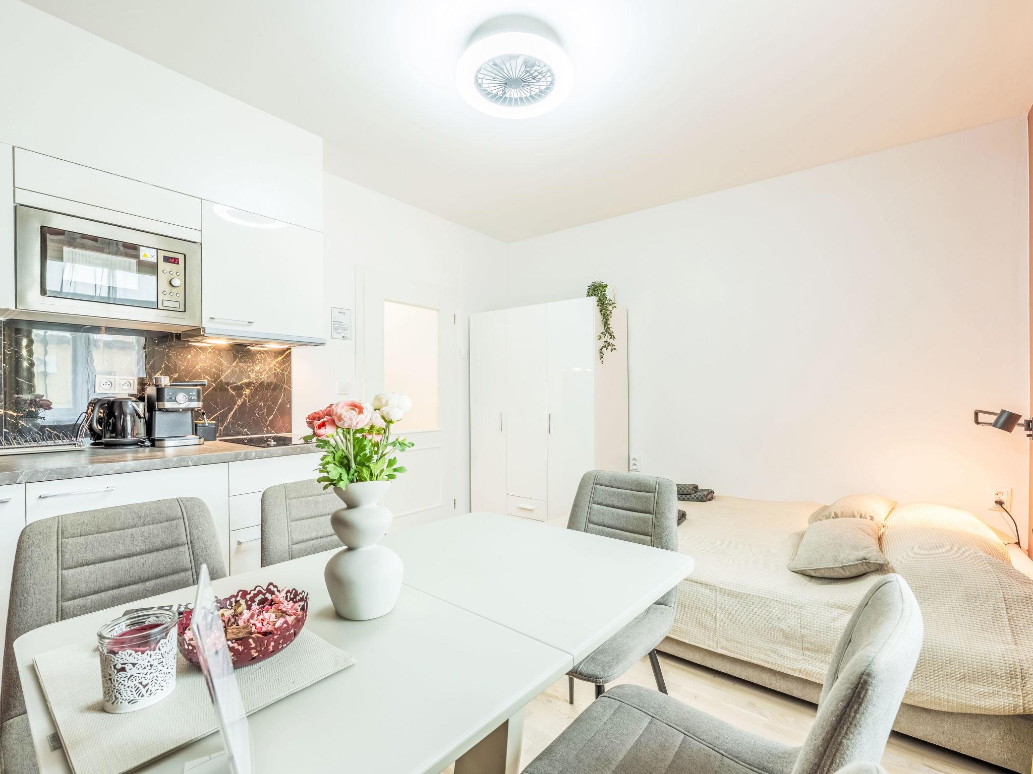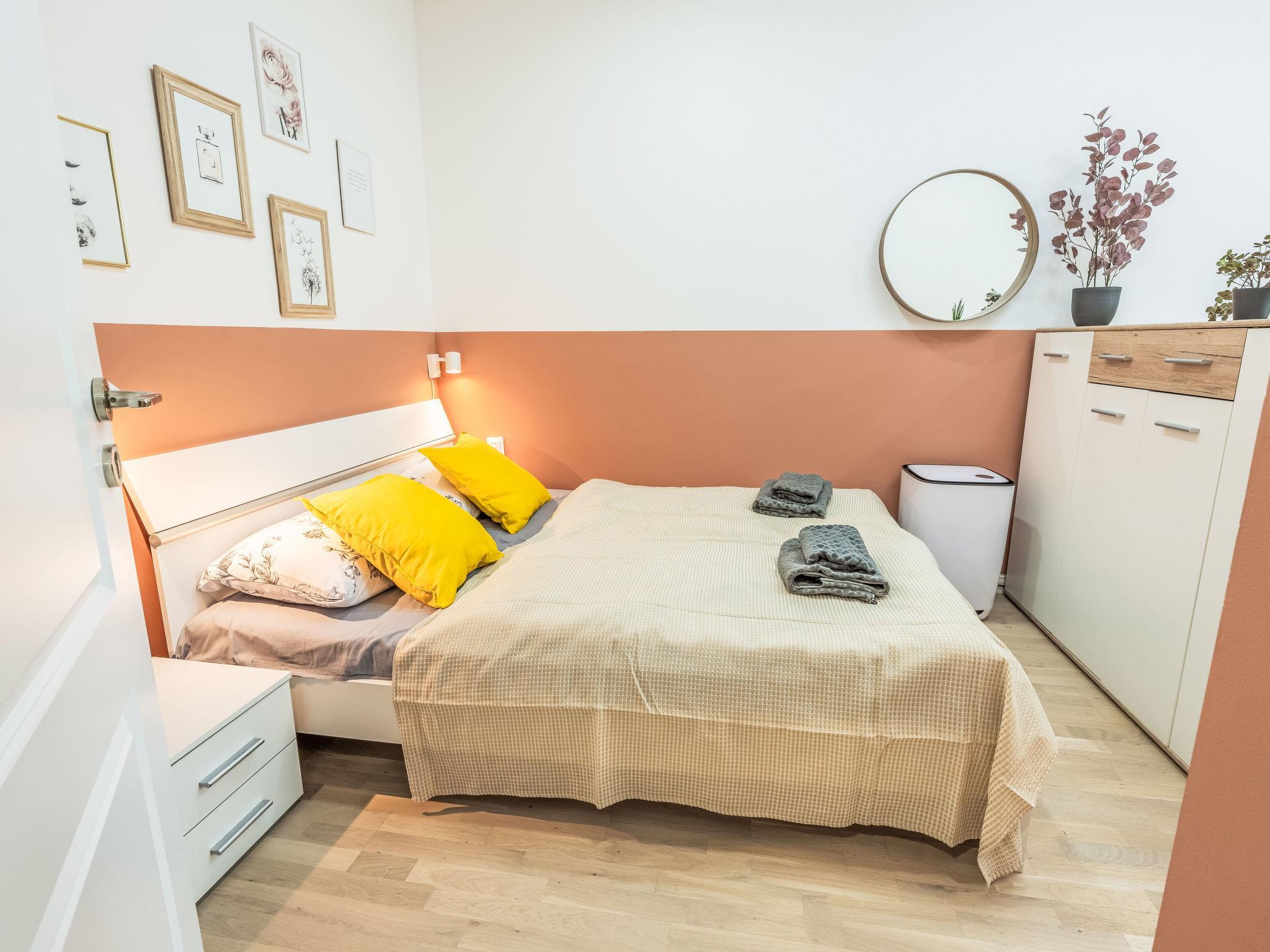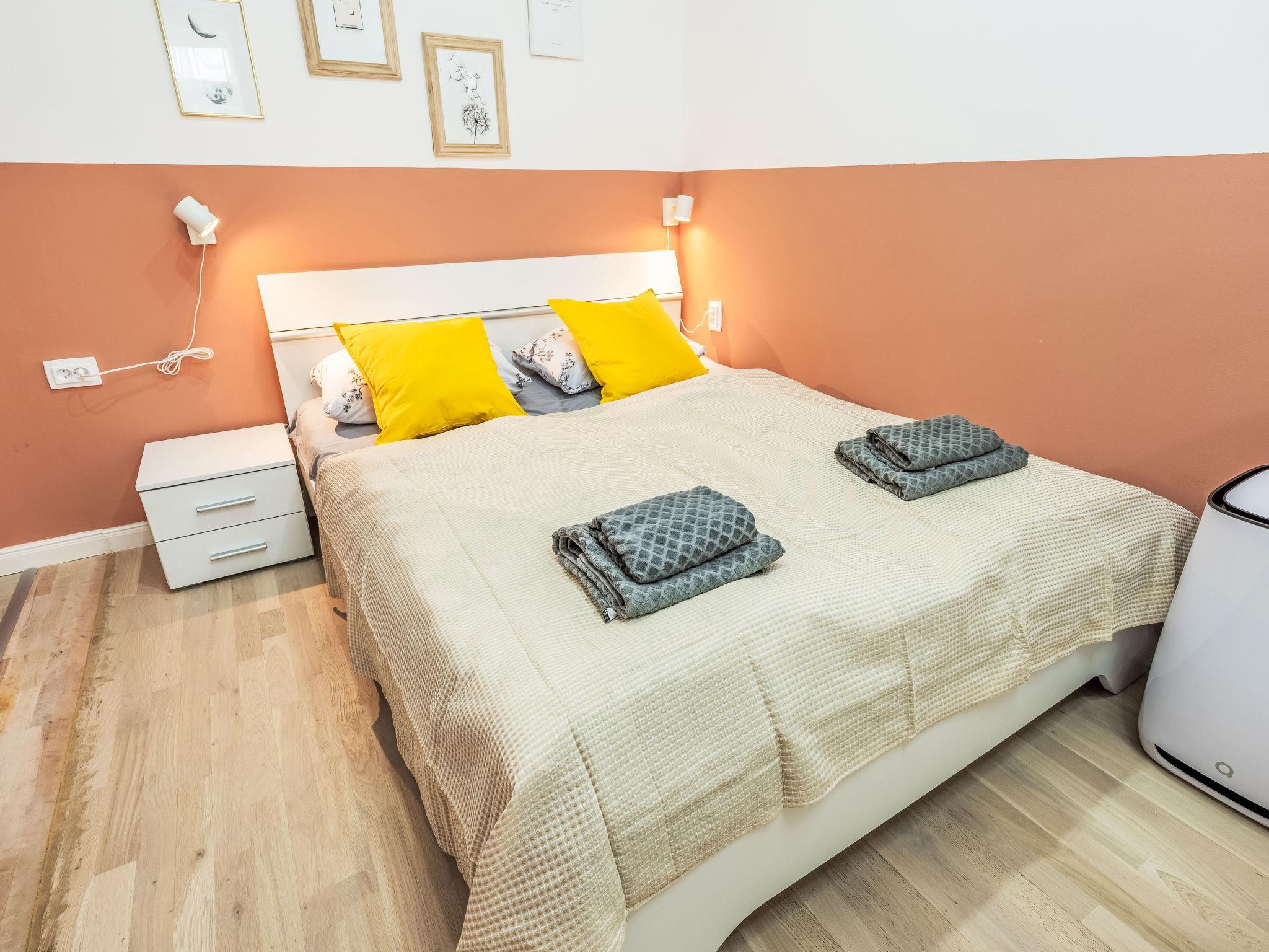 2-room apartment 39 m2 on 4th floor. Bright, fully renovated, very beautiful and modern furnishings: entrance hall. Living/dining room with 1 double bed, dining table and TV. 1 room with 2 double beds. Kitchenette (2 induction hot plates, toaster, kettle, microwave, freezer, electric coffee machine). Shower/WC. Facilities: washing machine, baby cot, hair dryer. Internet (WiFi, free). Please note: suitable for families apartment courtyard side. Non-smokers only. Maximum 1 pet/ dog allowed. Smoke alarm.