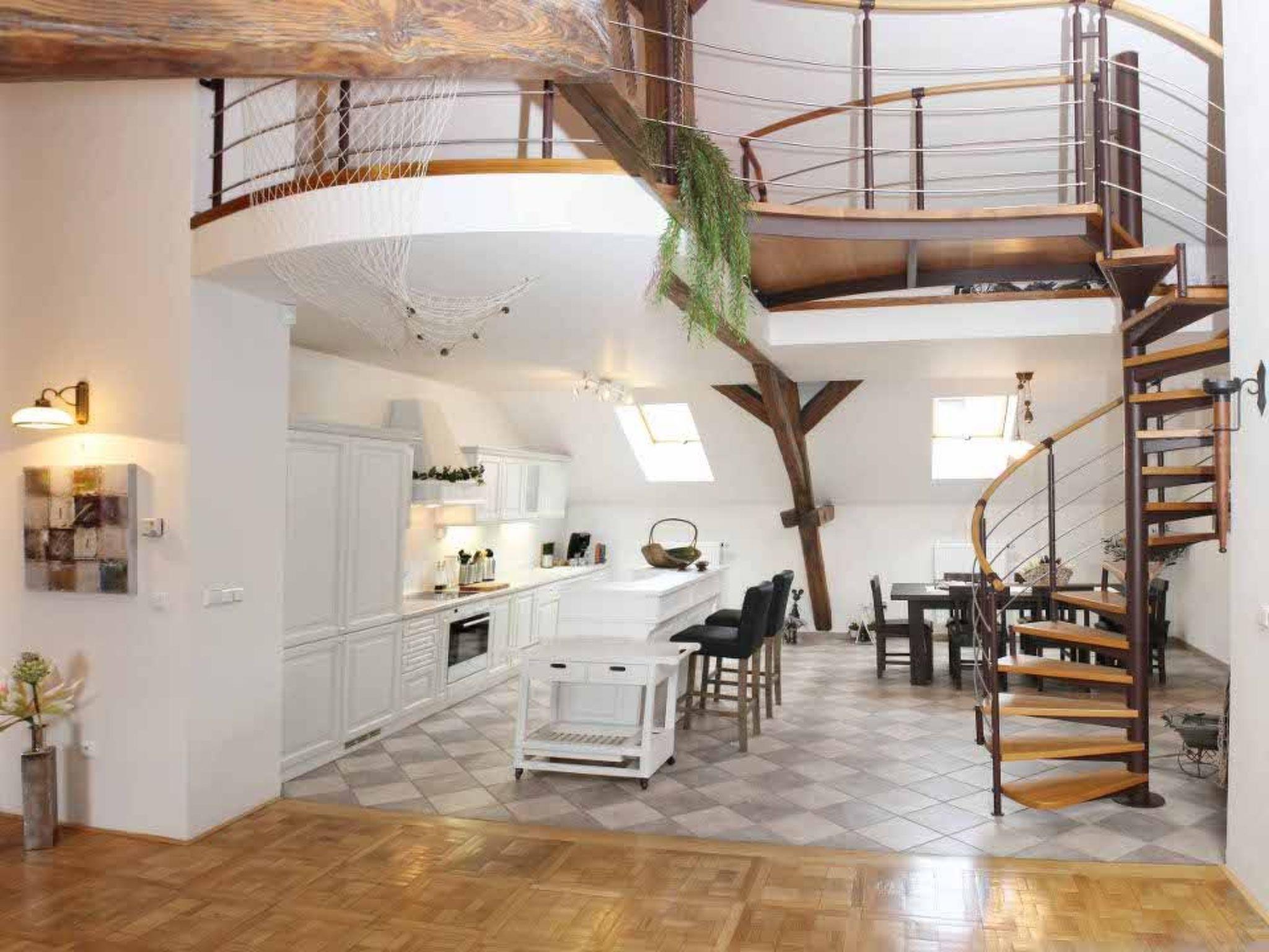 Layout: This is one of the largest flats in Prague, offering 240 m2 over two levels. On the main level are the first bedroom and en-suite bathroom, the second bedroom, the large living room, dining room and kitchen. The third bedroom is on the upper level and has its own bathroom with shower and WC. Finally, there is another separate WC at the entrance to the flat.