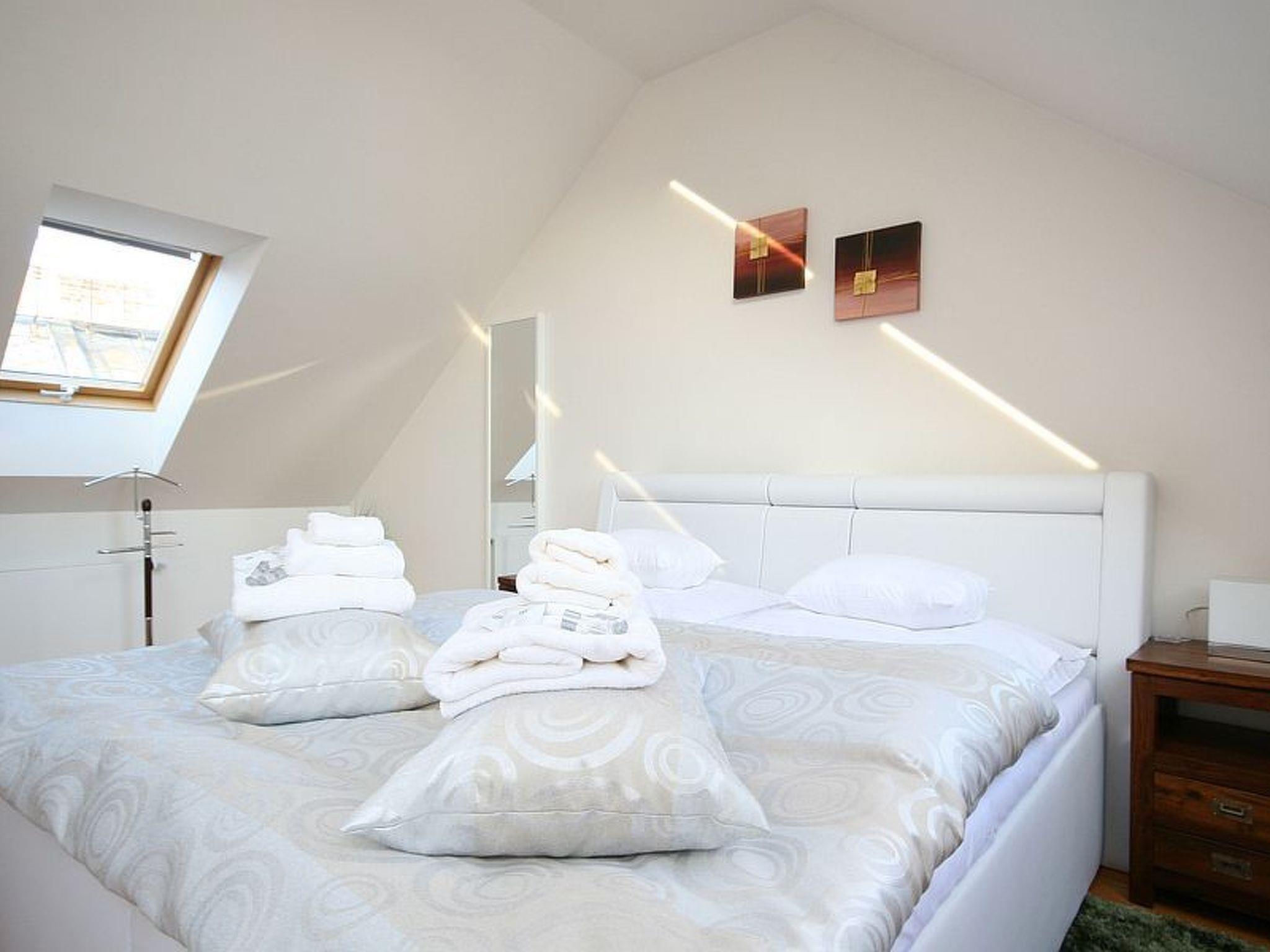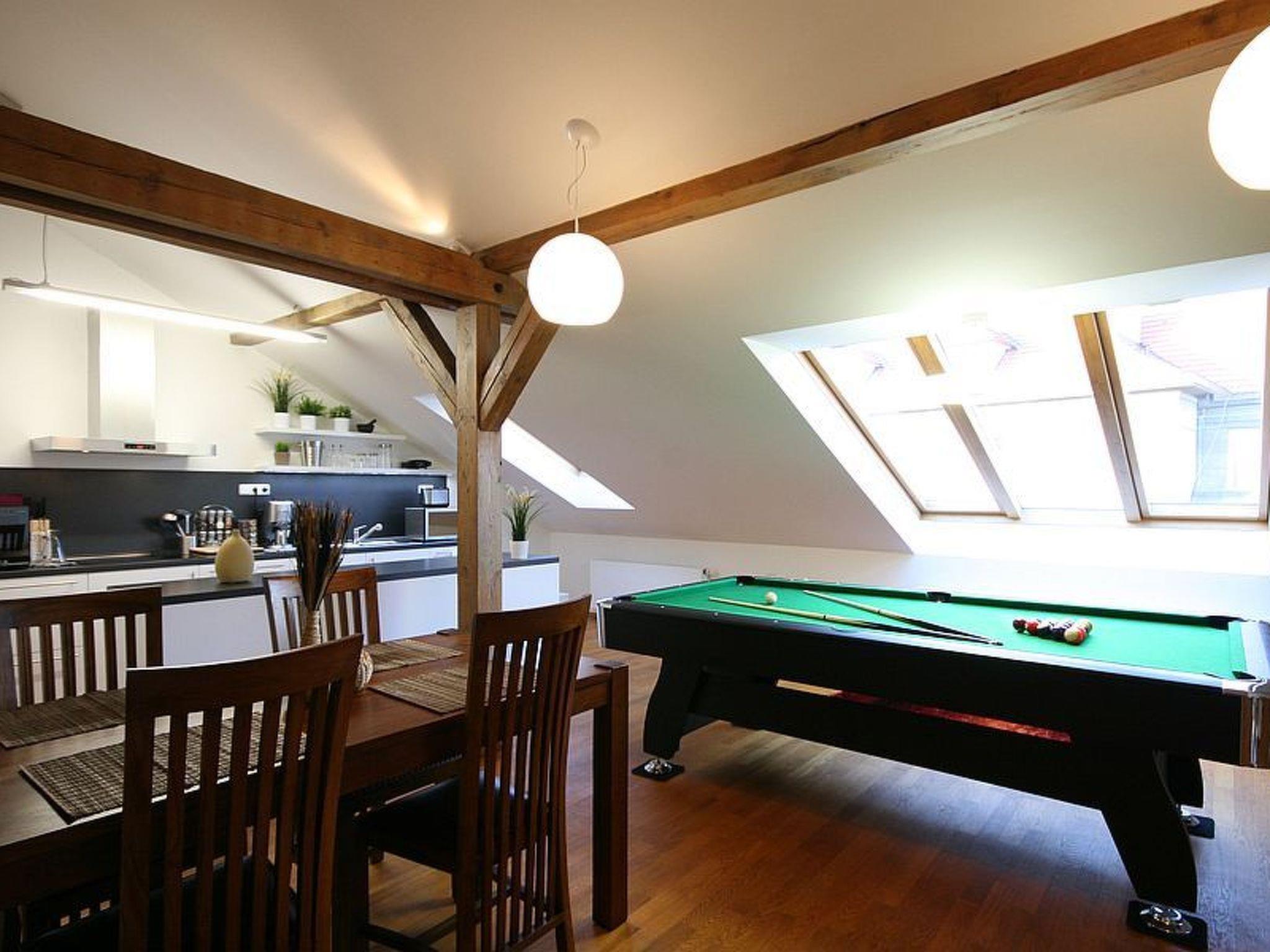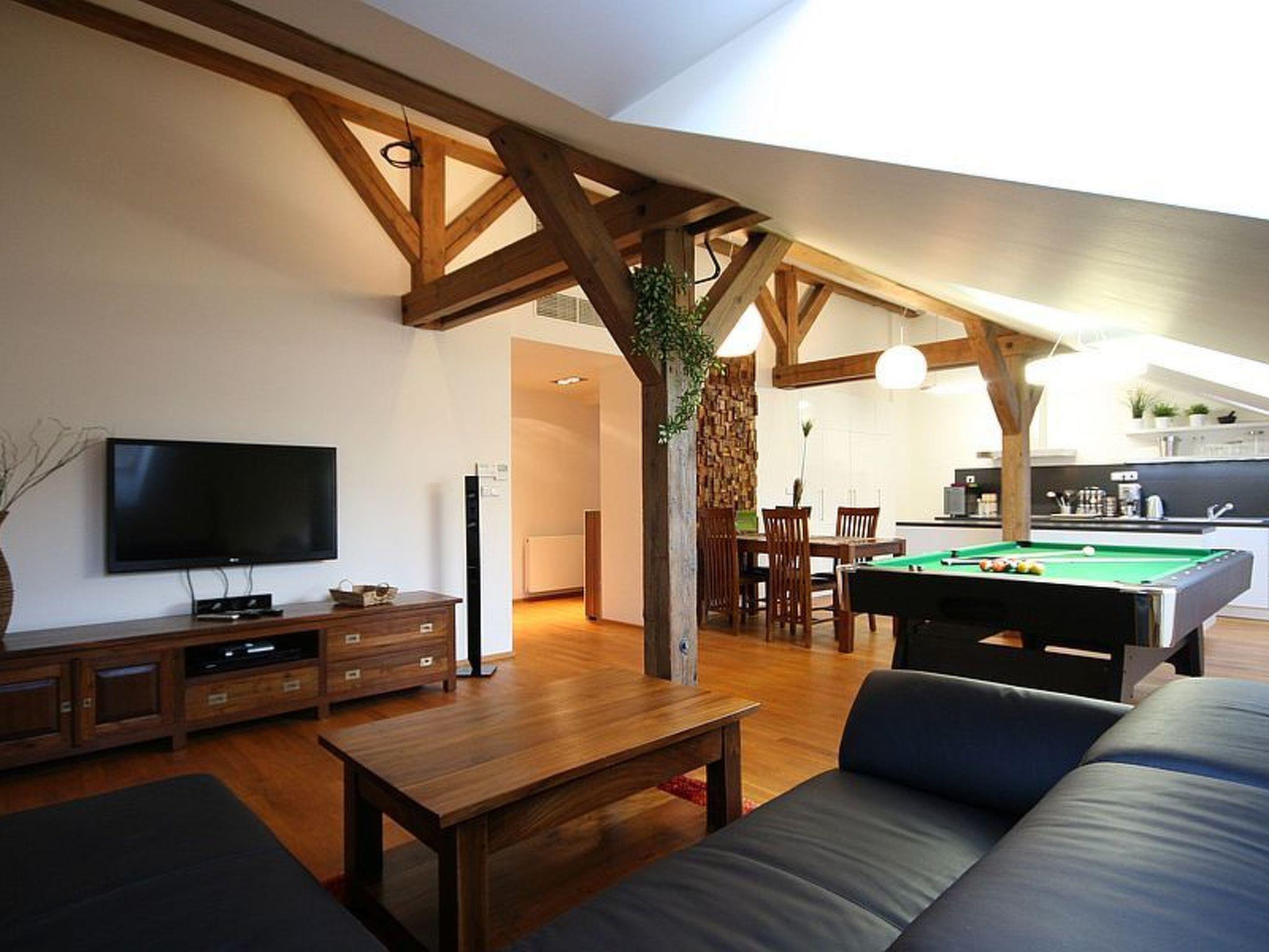 The attic apartment carefully and tastefully furnished to a high standard, over the rooftops of Prague, was luxuriously renovated in 2013. Its ca. 147m² can accommodate four people. It has two bedrooms each with a double bed 180cm wide and a bathroom with a bath, shower and WC, as well as a guest WC. The generous living and dining room with a very modern, fully-equipped kitchen is just as impressive, with a preserved beam structure. You can find a leather sofa here for relaxing, and a flatscreen TV, as well as a pool table for more sociable evenings. The whole apartment has air conditioning and every room has heating. Wireless Internet access, a washing machine and dryer are available.