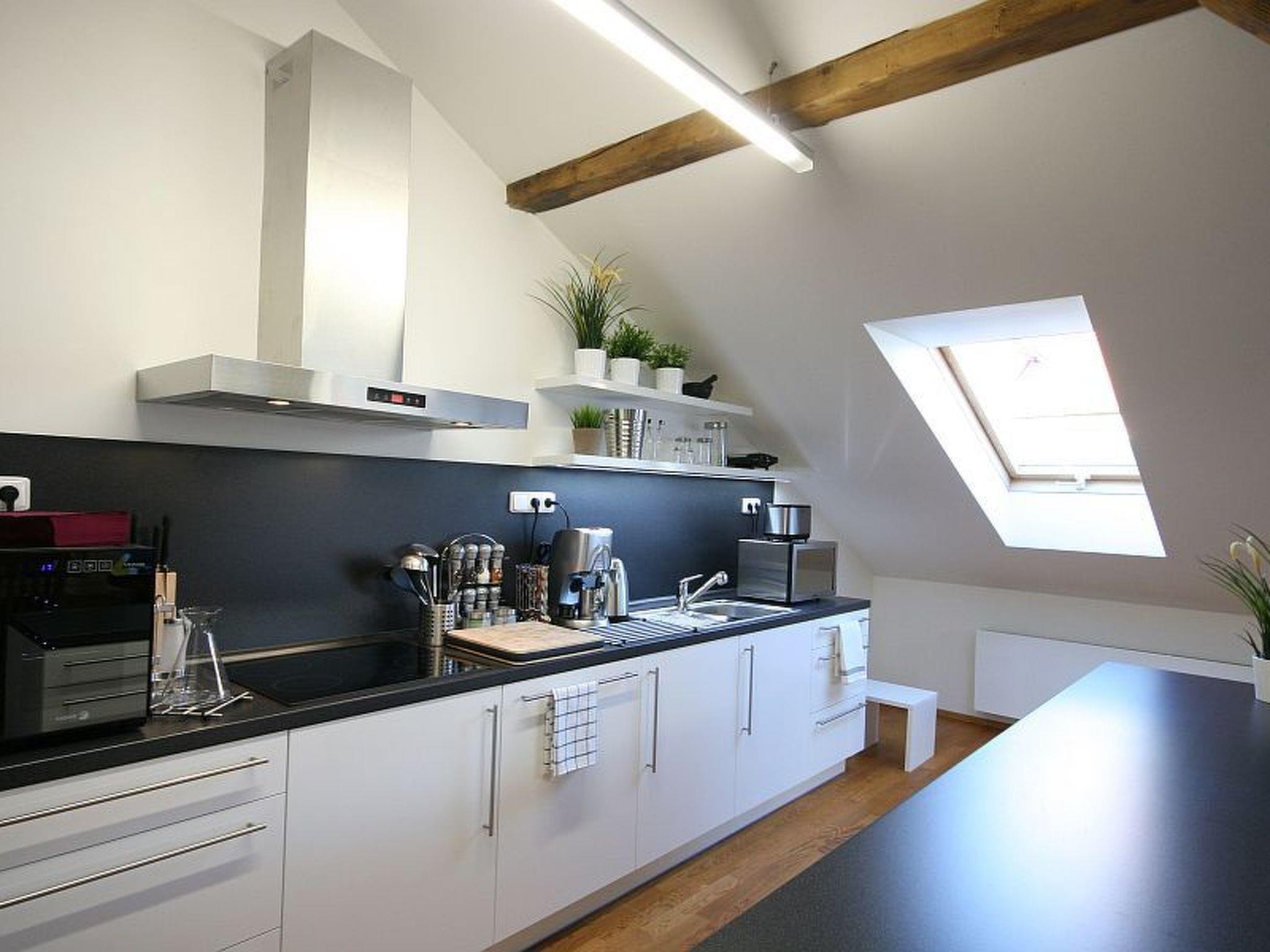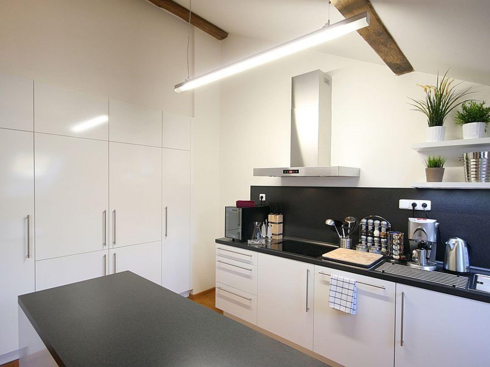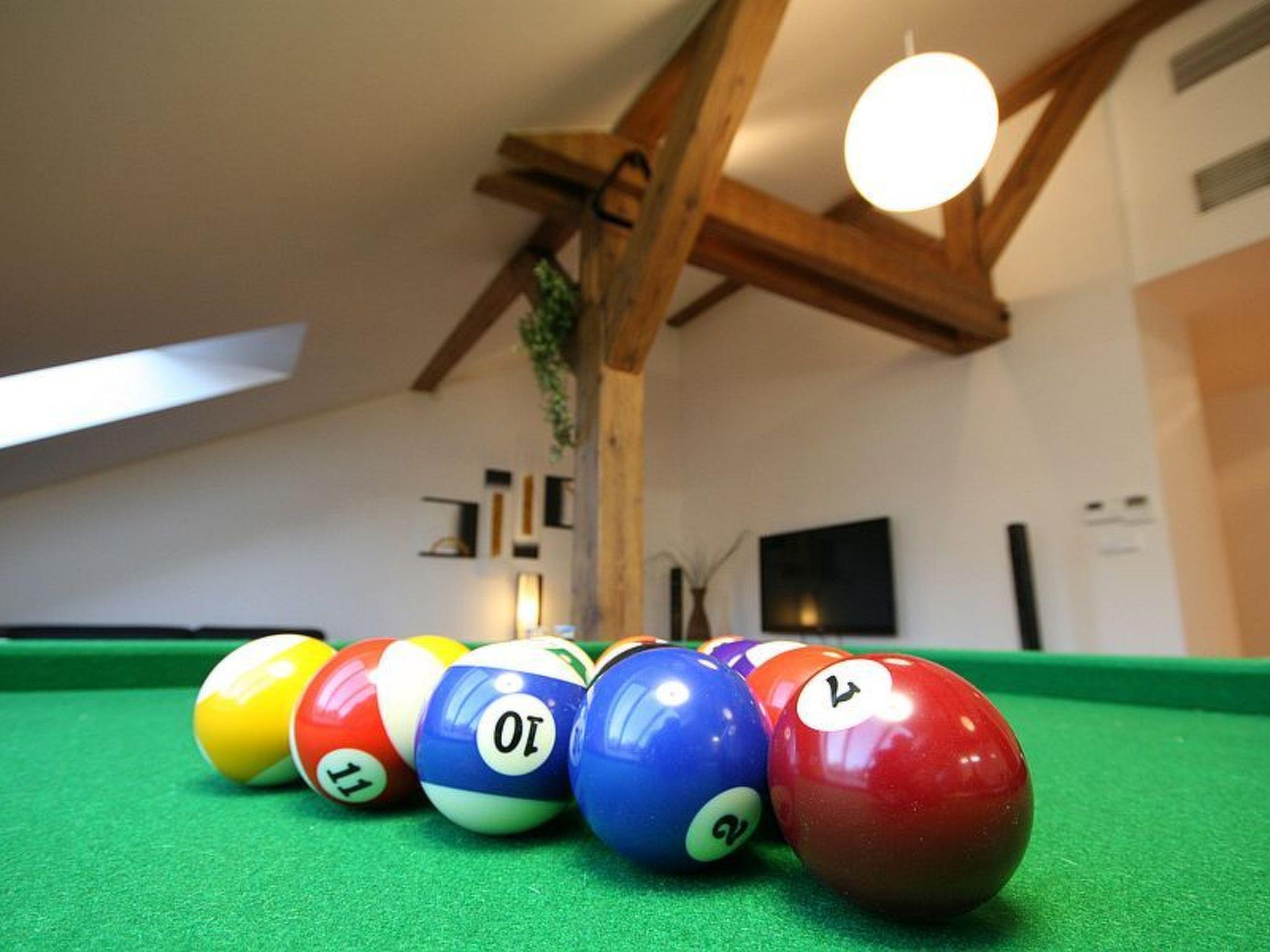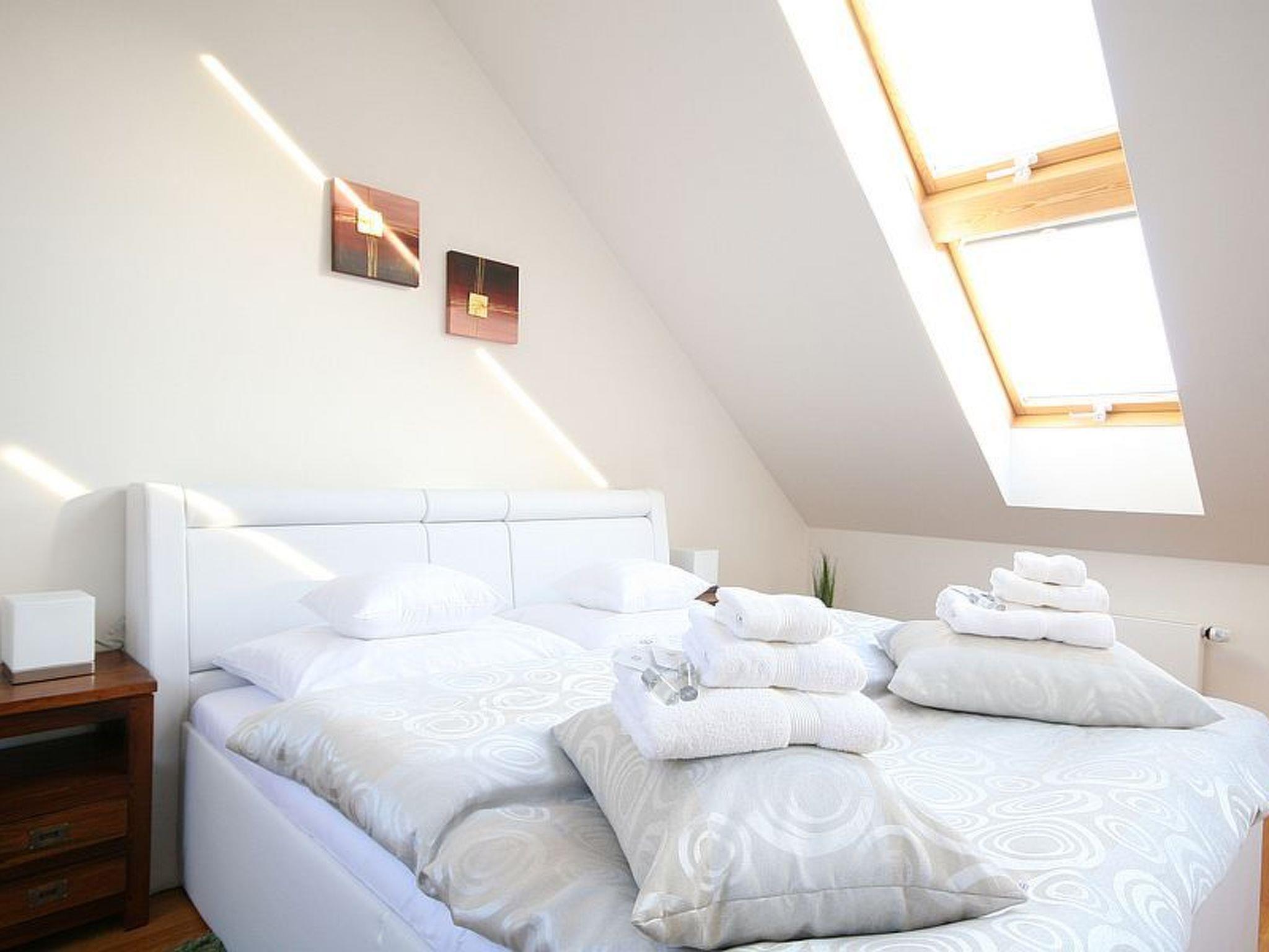 The attic apartment carefully and tastefully furnished to a high standard, over the rooftops of Prague, was luxuriously renovated in 2013. Its ca. 147m² can accommodate four people. It has two bedrooms each with a double bed 180cm wide and a bathroom with a bath, shower and WC, as well as a guest WC. The generous living and dining room with a very modern, fully-equipped kitchen is just as impressive, with a preserved beam structure. You can find a leather sofa here for relaxing, and a flatscreen TV, as well as a pool table for more sociable evenings. The whole apartment has air conditioning and every room has heating. Wireless Internet access, a washing machine and dryer are available.