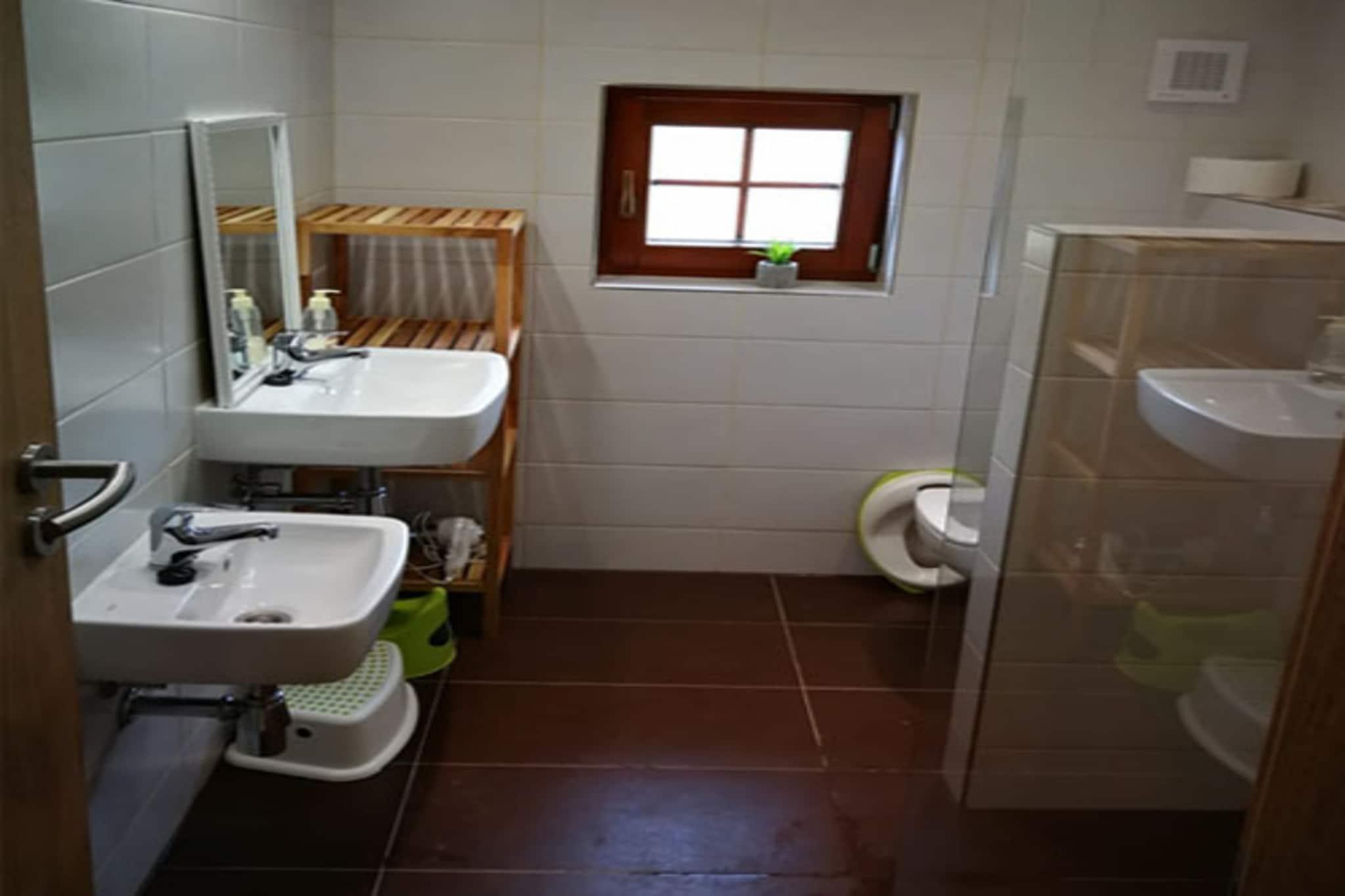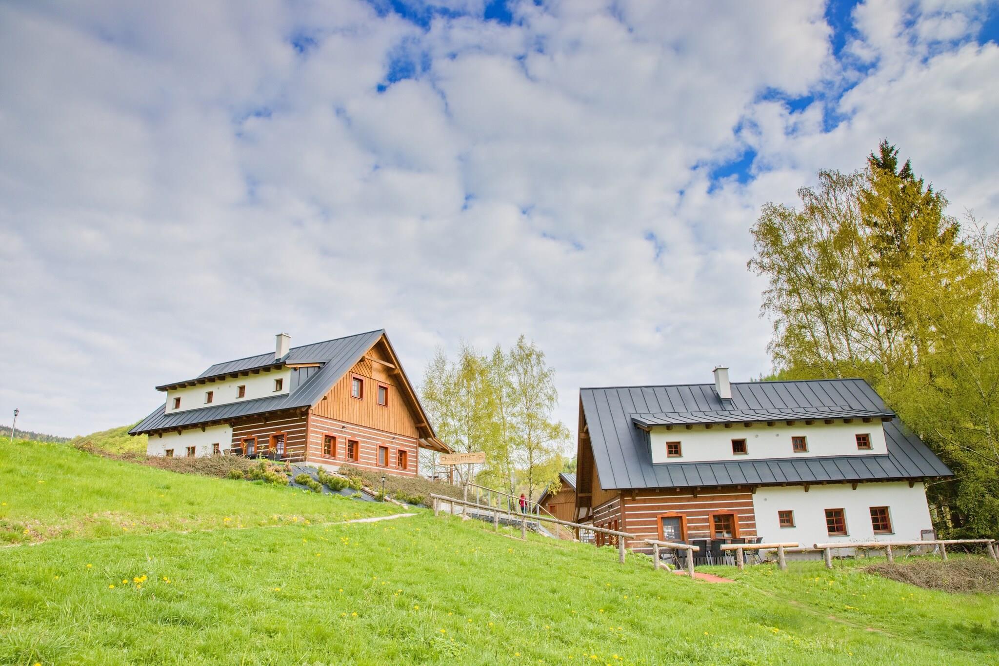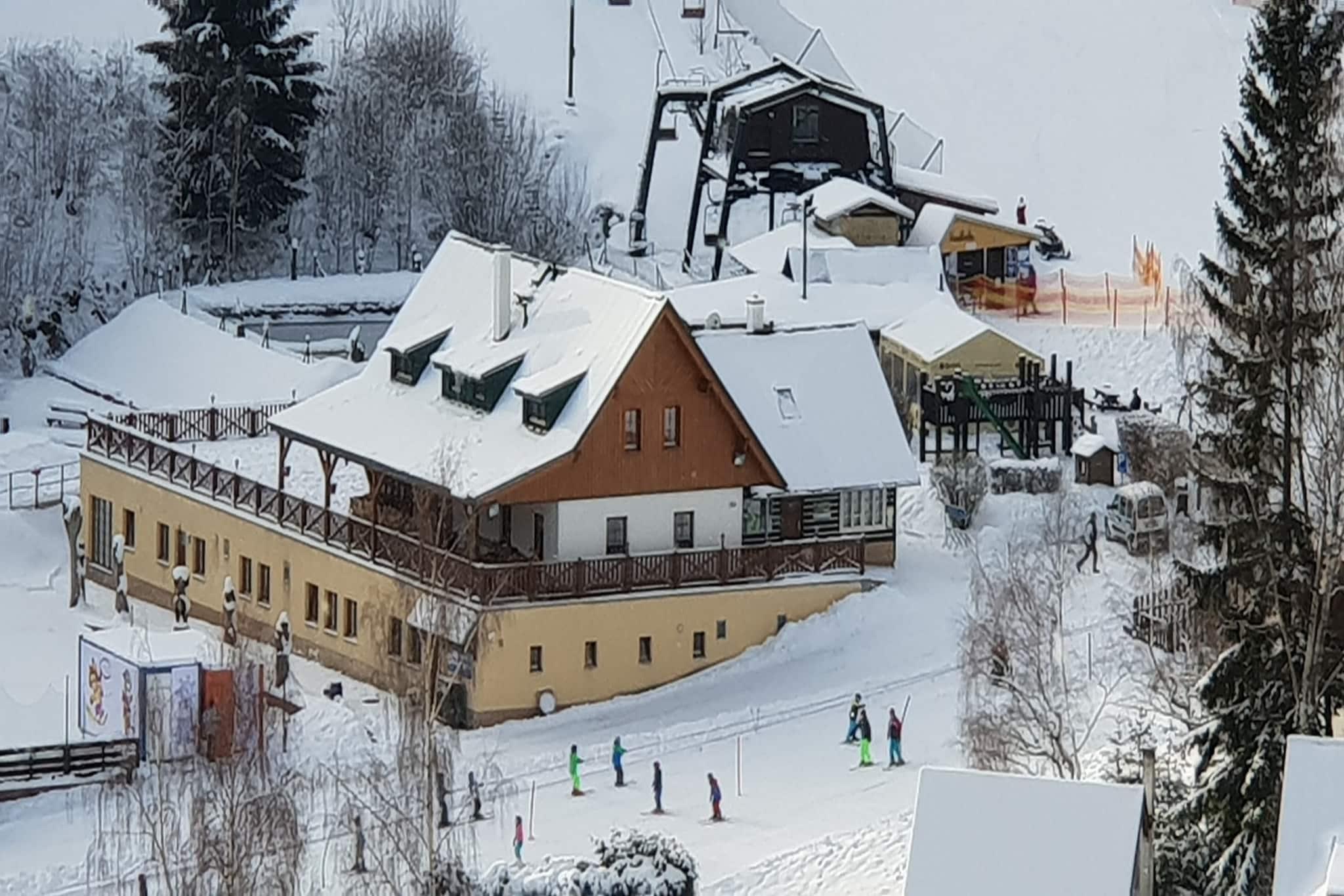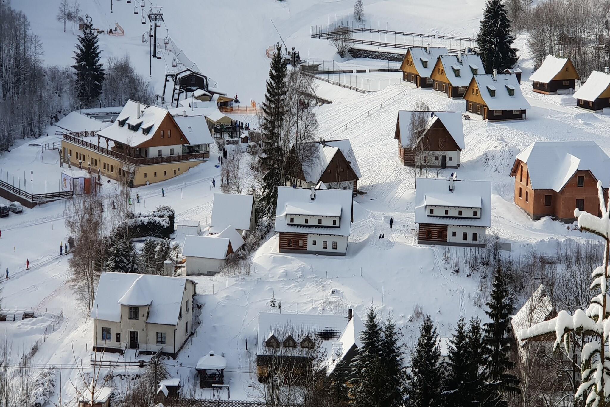 Omgivet af uberørt natur og skov tilbyder dette kompleks af fire nybyggede feriehuse et fredeligt tilflugtssted i den charmerende dal Prkenný Dul, nær byen Žaclér. Hvert rummelige hus på 200 m² kan rumme op til 14 personer, med tre lejligheder med to soveværelser og private sanitære faciliteter. Boligerne inkluderer også et hyggeligt fællesrum med pejs, satellit-tv og internet, hvilket sikrer komfort og afslapning for alle gæster. De veludstyrede køkkener omfatter keramiske komfurer, køleskabe, mikrobølgeovne, ovne og opvaskemaskiner, så gæsterne kan nyde praktisk tilberedning af måltider. Beliggenheden tilbyder gæster året rundt nydelse. Om vinteren tilbyder den nærliggende Family Ski Park Žaclér, kun 70 meter væk, tre pister, en skilift til børn og skiudlejning, hvilket gør den perfekt for familier. Gæster kan også få adgang til Bret Sports Wellness Complex for yderligere skifaciliteter, eller besøge andre nærliggende skisportssteder såsom Janské Lázne, Pec pod Snežkou og Mladé Buky. For ikke-skiløbere byder området på vandreture, sightseeing og udflugter til lokale attraktioner såsom Adršpach-klippeformationerne og Dvur Králové. Byen Žaclér byder på restauranter, butikker og skiudlejning, alt sammen inden for 1 km. I varmere vejr kan gæsterne slappe af udendørs i haven, nyde terrassen med havemøbler eller tage en dukkert i den fælles opvarmede swimmingpool. Familier kan slappe af i legepladsen, og tennisentusiaster vil sætte pris på banen på stedet.