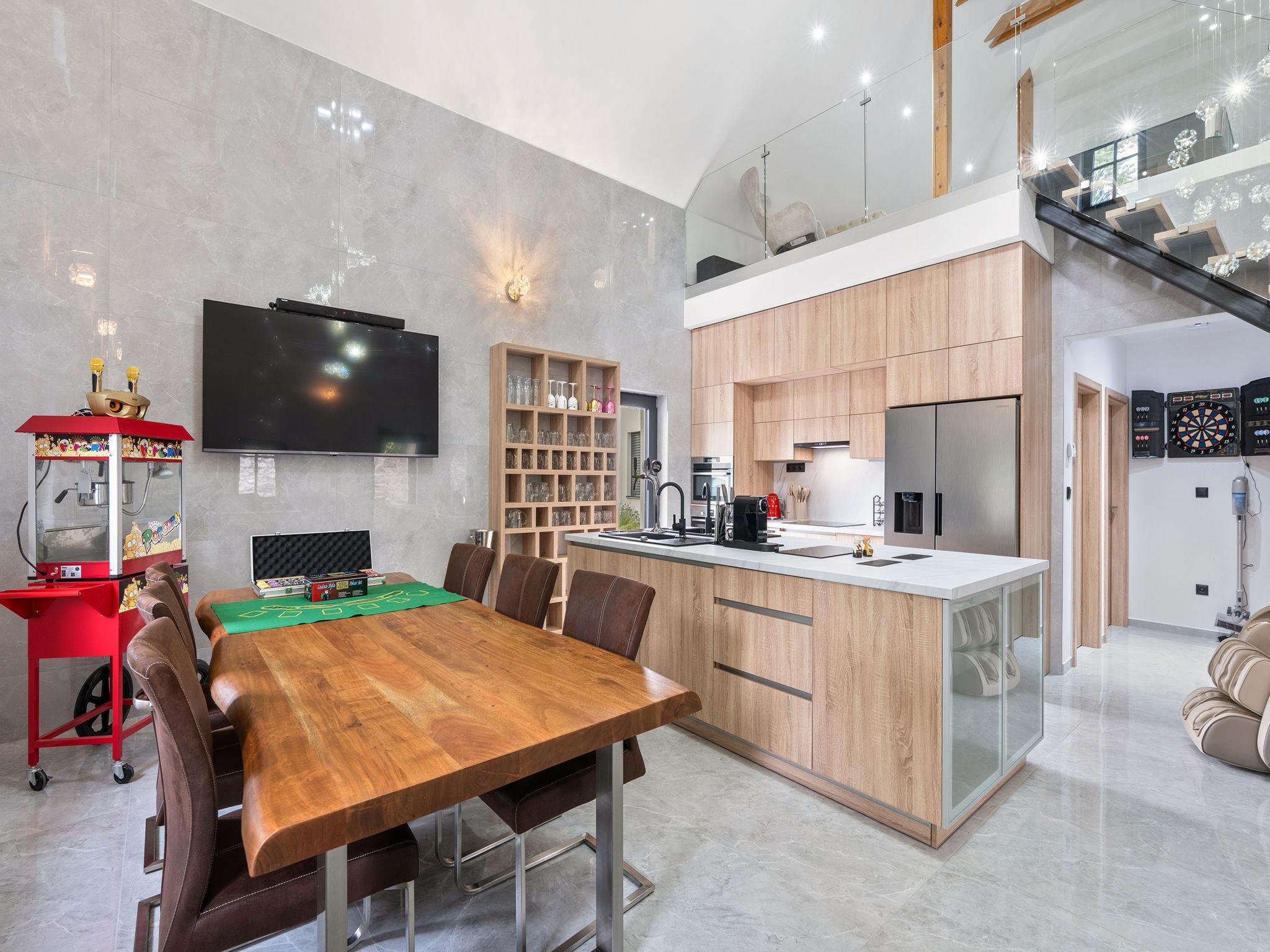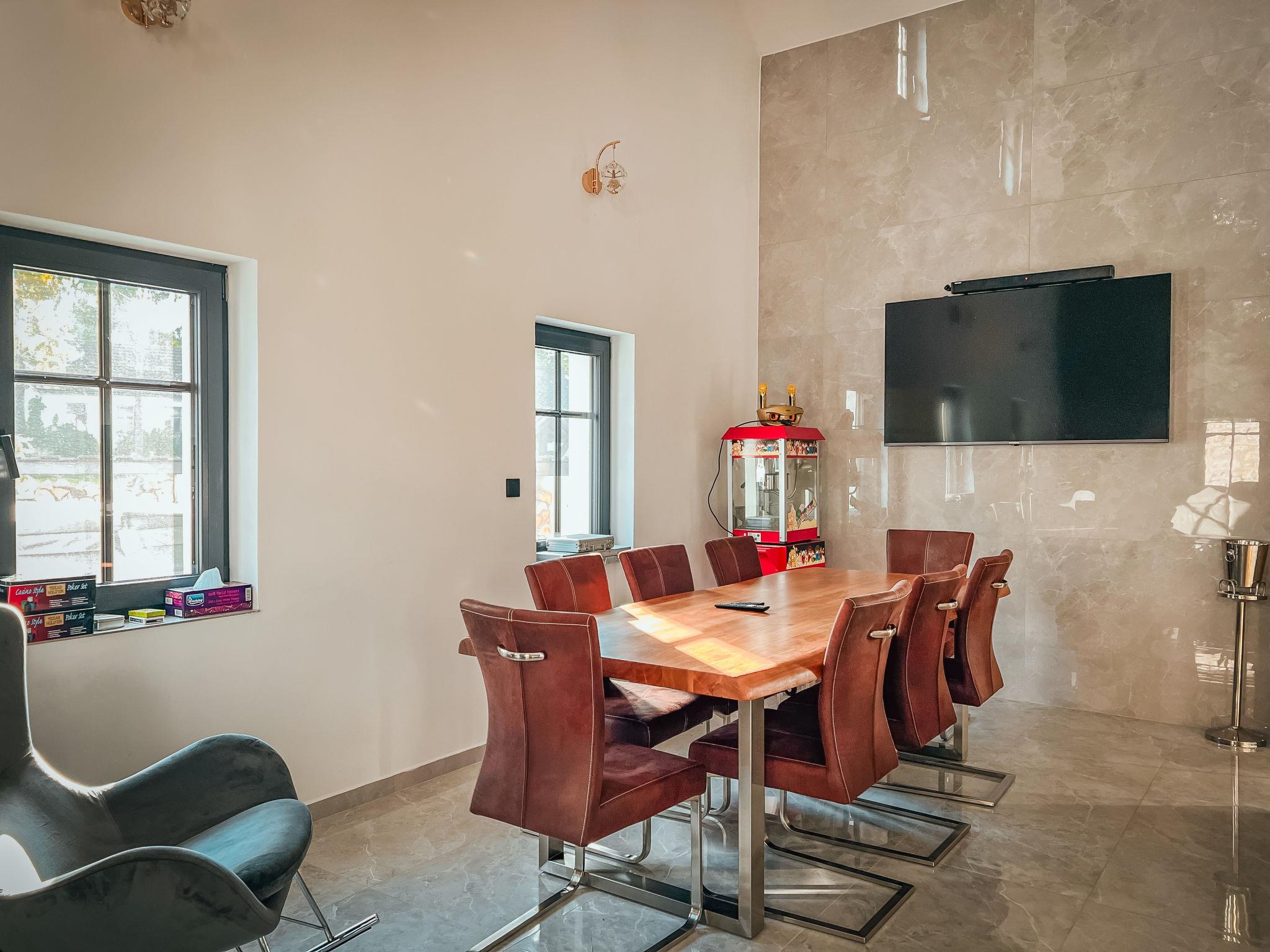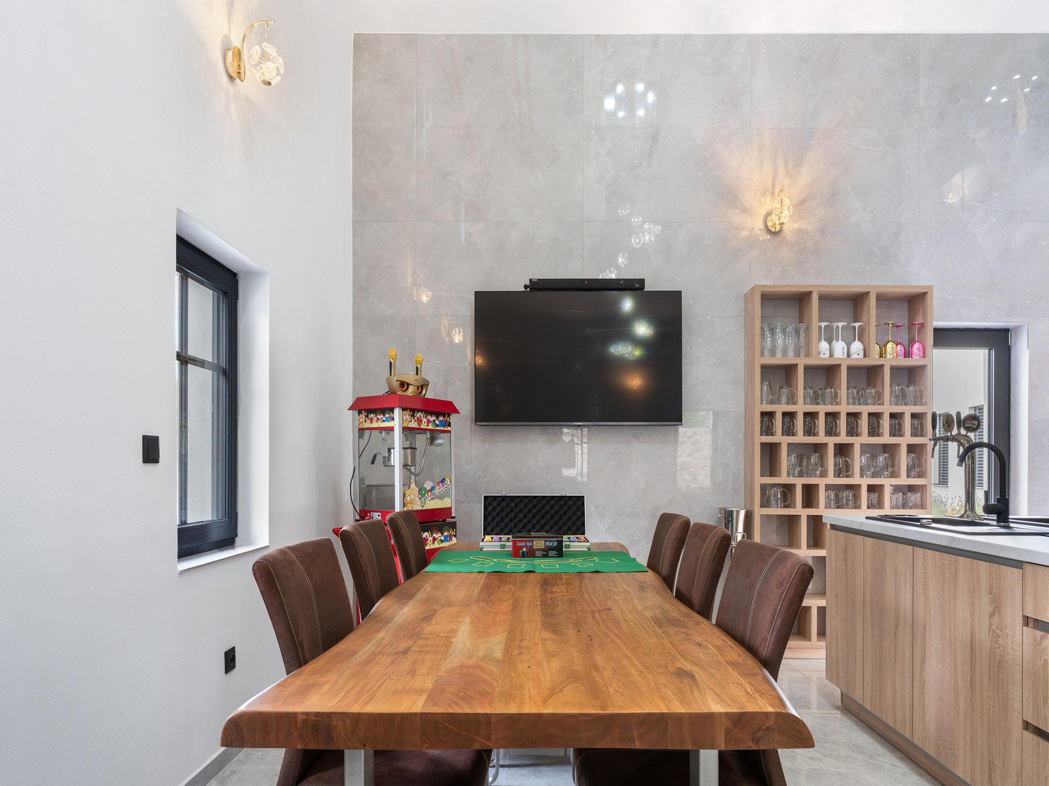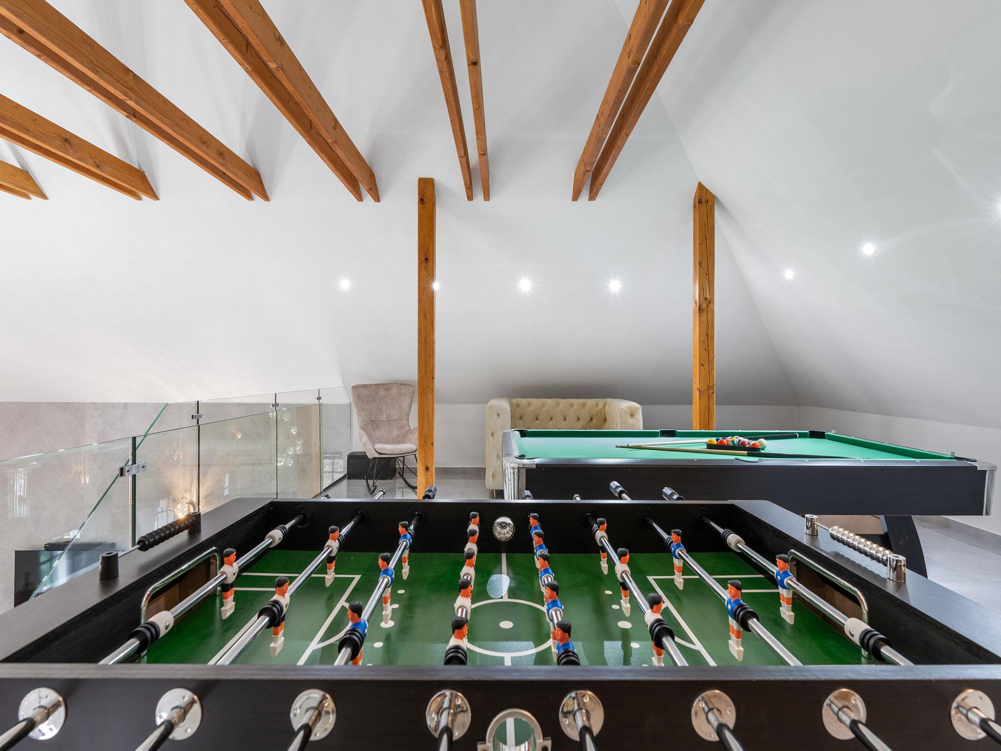 "Party & Friends Villa", 6-room house 180 m2 on 2 levels. Modern and luxurious furnishings: open living room with 1 double sofabed, open-hearth fireplace and TV. 1 room with 1 double bed (180 cm), shower/WC and TV. 1 room with 1 bed and 1 double bed (180 cm), shower/WC. Open kitchen (oven, dishwasher, 4 induction hot plates, toaster, kettle, microwave, electric coffee machine, Capsules for coffee machine (Nesperesso)) with dining table. Upper floor: 1 room with 1 double bed (180 cm), shower/WC. Playroom with 1 bed and TV. Hydro massage bath (private). Large terrace 40 m2. Terrace furniture, barbecue (portable). Facilities: washing machine, dryer. Internet (WiFi, free). E-charging station. Please note: non-smoking house. Maximum 2 pets/ dogs allowed. Open kitchen with central counter. Two sinks, integrated wireless phone charging. Built-in double tap. Massage chair, wall-mounted electronic dartboard. Fully equipped kitchen with high standards. American refrigerator with ice maker, oven, 3x dishwasher, 2x induction hob. Massive teak mango dining table for 10 people. The property offers a games room with billiards, table football, casino blackjack screen, chips, cards, electronic darts. Technical room (second refrigerator, large sink). All windows equipped with insect screens.