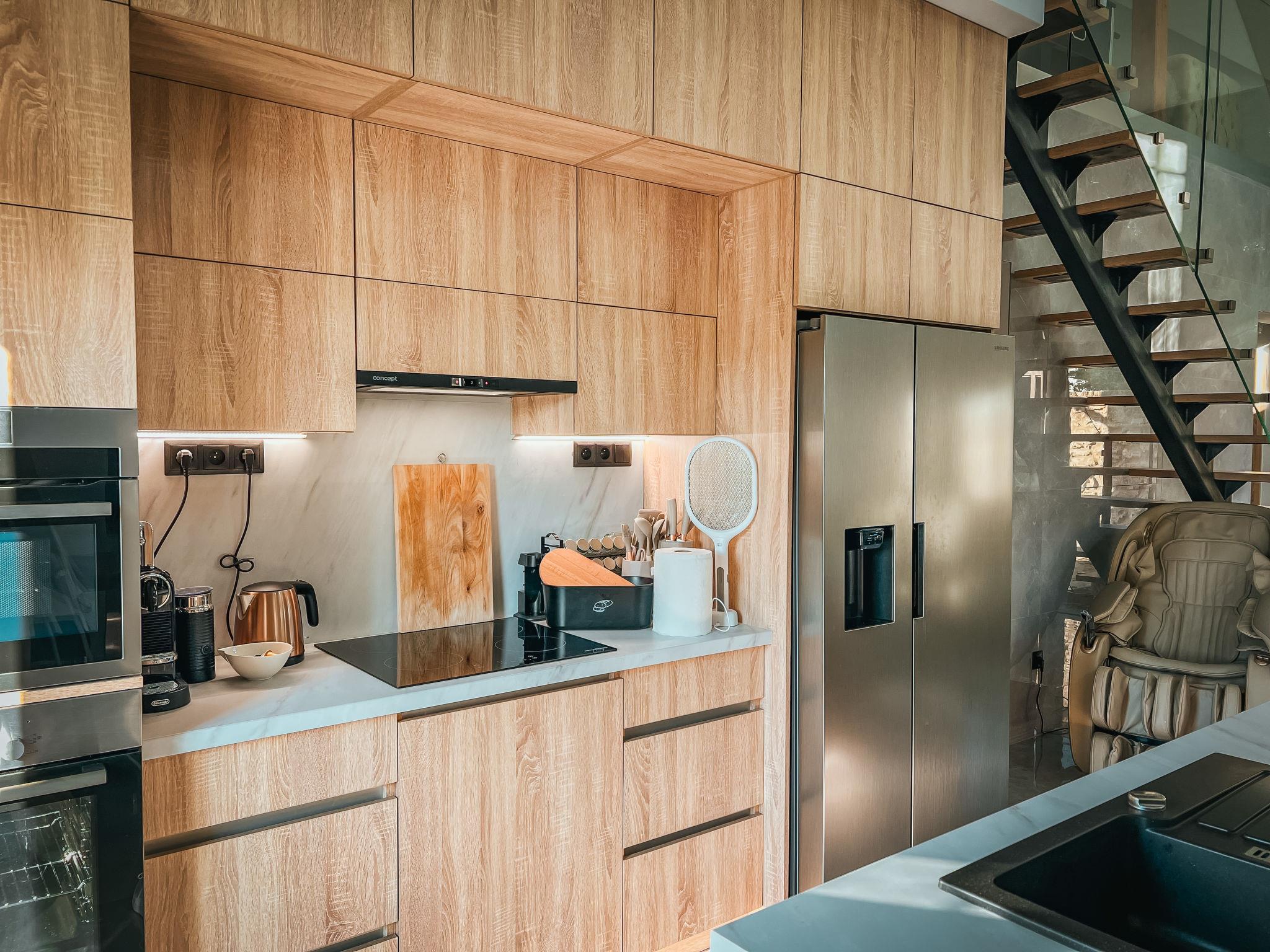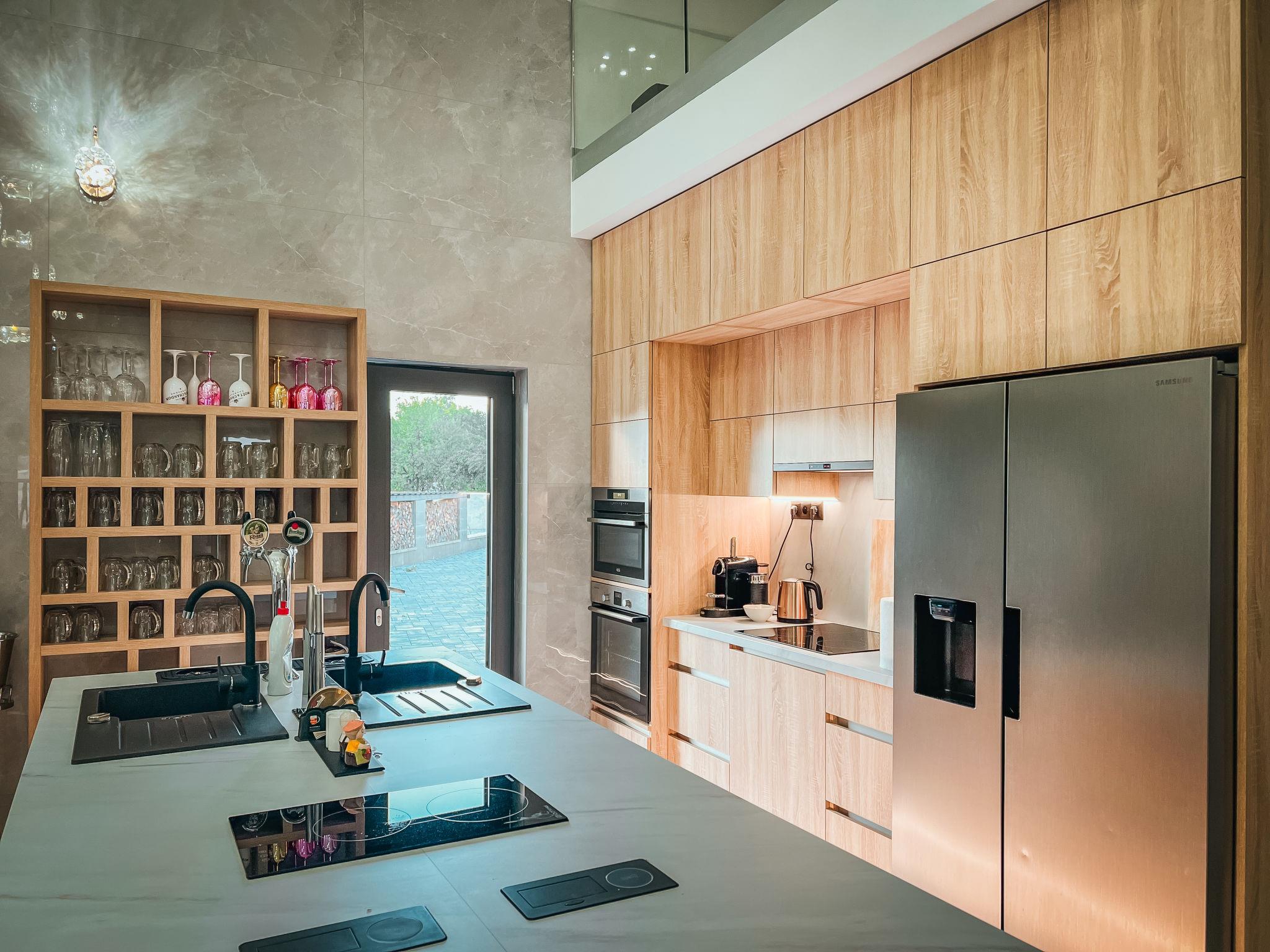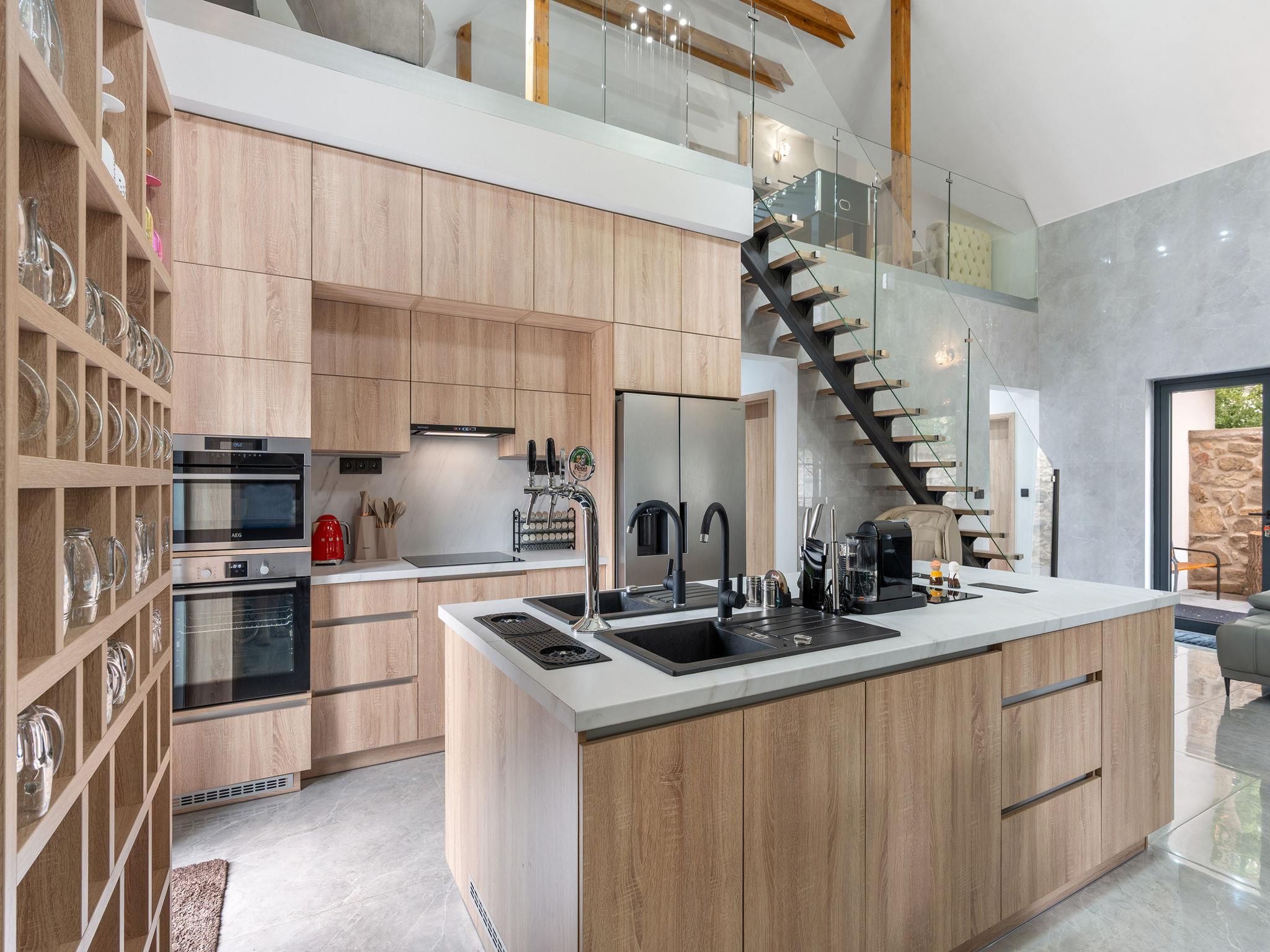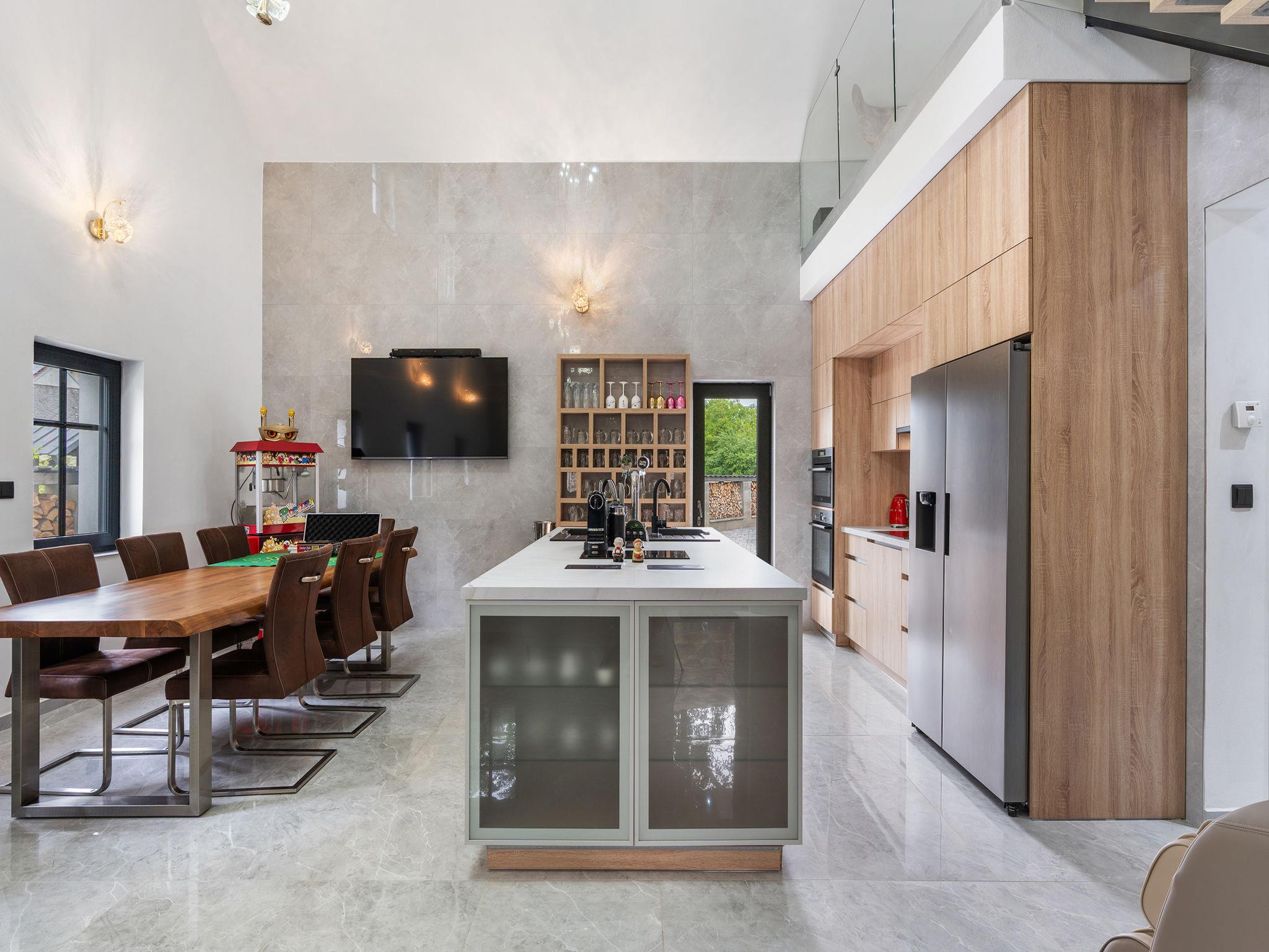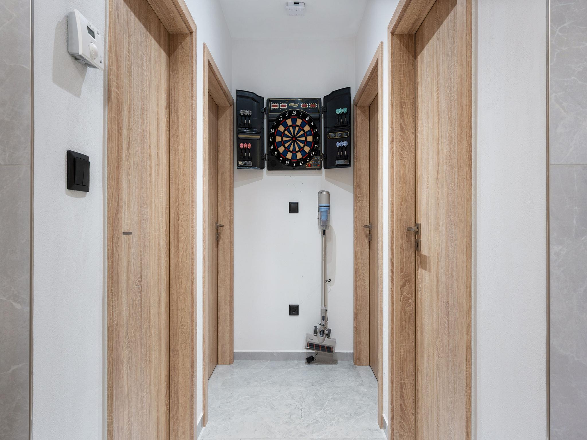 "Party & Friends Villa", 6-room house 180 m2 on 2 levels. Modern and luxurious furnishings: open living room with 1 double sofabed, open-hearth fireplace and TV. 1 room with 1 double bed (180 cm), shower/WC and TV. 1 room with 1 bed and 1 double bed (180 cm), shower/WC. Open kitchen (oven, dishwasher, 4 induction hot plates, toaster, kettle, microwave, electric coffee machine, Capsules for coffee machine (Nesperesso)) with dining table. Upper floor: 1 room with 1 double bed (180 cm), shower/WC. Playroom with 1 bed and TV. Hydro massage bath (private). Large terrace 40 m2. Terrace furniture, barbecue (portable). Facilities: washing machine, dryer. Internet (WiFi, free). E-charging station. Please note: non-smoking house. Maximum 2 pets/ dogs allowed. Open kitchen with central counter. Two sinks, integrated wireless phone charging. Built-in double tap. Massage chair, wall-mounted electronic dartboard. Fully equipped kitchen with high standards. American refrigerator with ice maker, oven, 3x dishwasher, 2x induction hob. Massive teak mango dining table for 10 people. The property offers a games room with billiards, table football, casino blackjack screen, chips, cards, electronic darts. Technical room (second refrigerator, large sink). All windows equipped with insect screens.