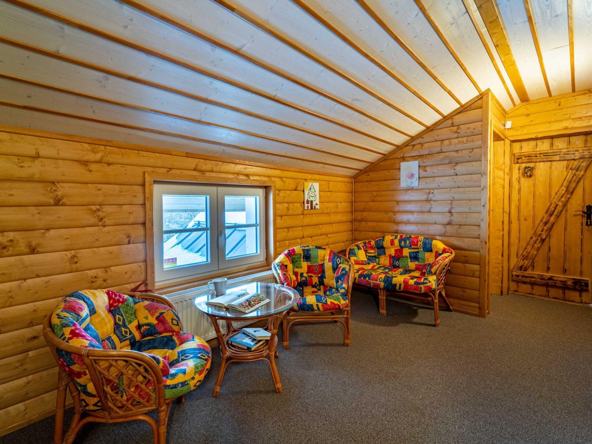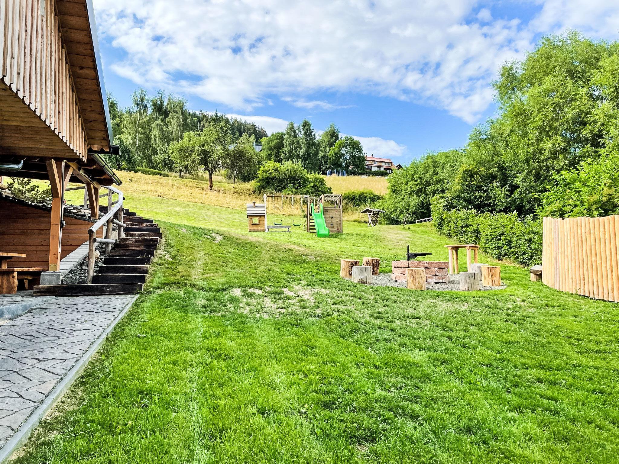 8-room chalet on 2 levels. Very beautiful and luxurious furnishings: 2 rooms, each room with 2 x 2 bunk beds, 1 double bed, shower/WC and TV. Playroom. Kitchen-/living room (dishwasher, 4 ceramic glass hob hotplates, kettle, microwave) with dining table and TV. Sauna. Upper floor: 3 rooms, each room with 4 beds, dining table, kitchen corner, shower/WC and TV. Large living room with TV. Large garden. Barbecue, sitting area. Beautiful view of the countryside. Facilities: children's high chair, baby cot. Internet (WiFi, free). Please note: non-smoking house. Maximum 1 pet/ dog allowed. Fire extinguisher. Beer tap available. 55