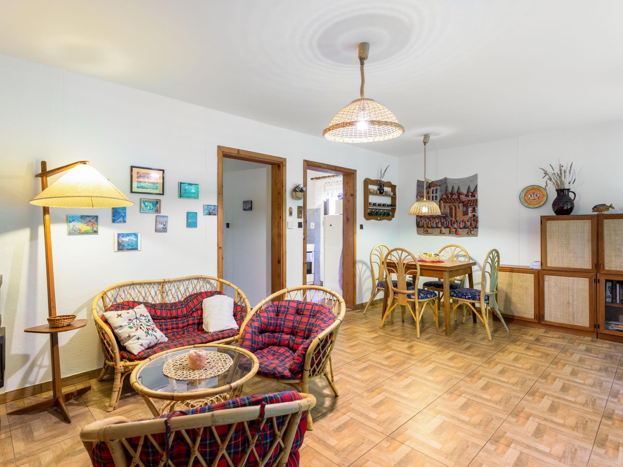 3-room bungalow 90 m2. Spacious and bright, comfortable furnishings: living room with 1 double sofabed, Scandinavian wood stove, satellite TV and cable TV (flat screen). 1 room with 1 double bed. 1 room with 2 beds. Kitchen (oven, 4 ceramic glass hob hotplates, kettle, microwave, freezer, electric coffee machine) with dining table. Shower, sep. WC. Electric heating, wood heating, boiler (120 litres). Patio 5 m2. Terrace furniture, barbecue. Beautiful view of the lake. Facilities: baby cot. Internet (WiFi, free). Suitable for families. Maximum 2 pets/ dogs allowed.