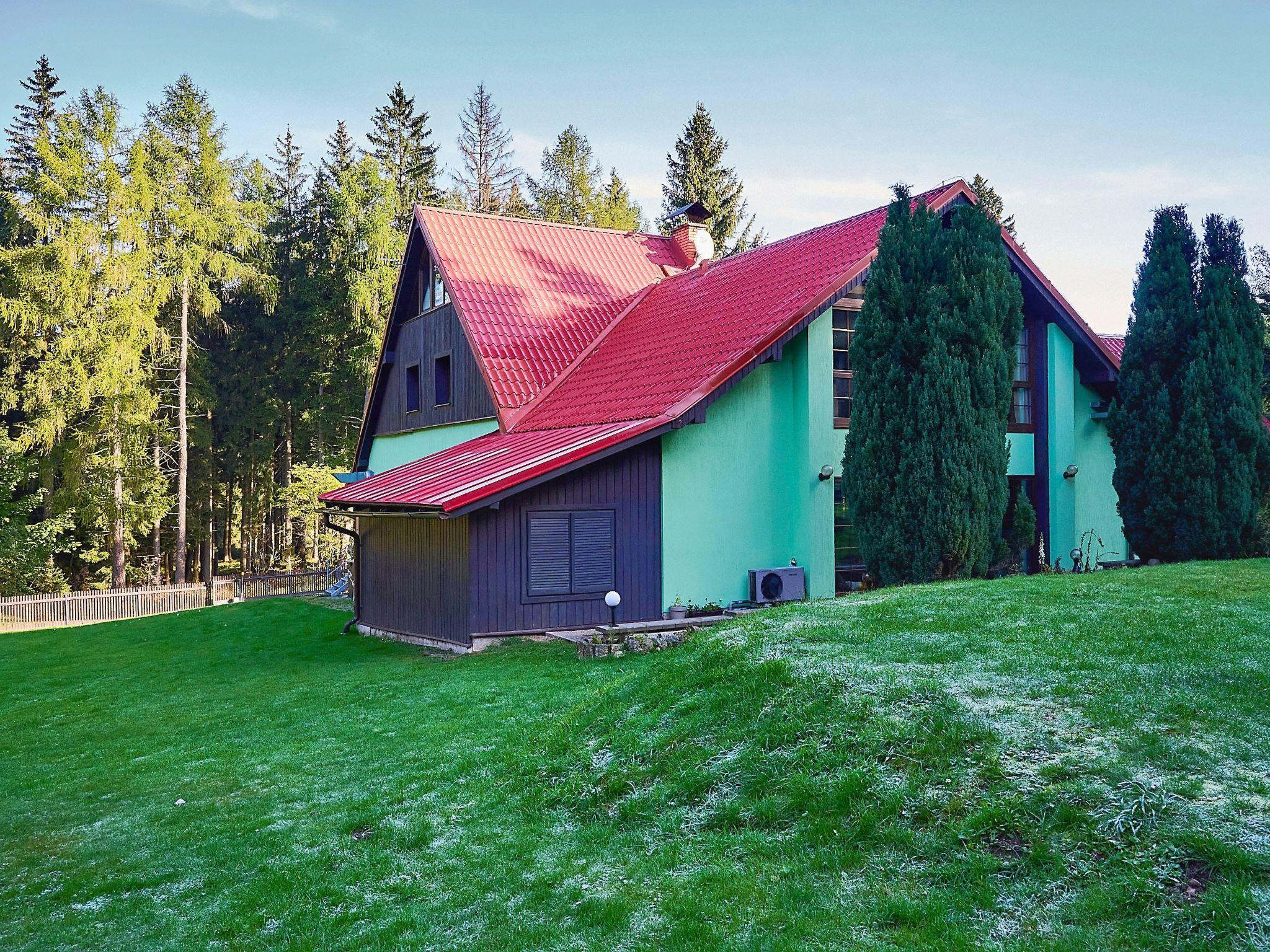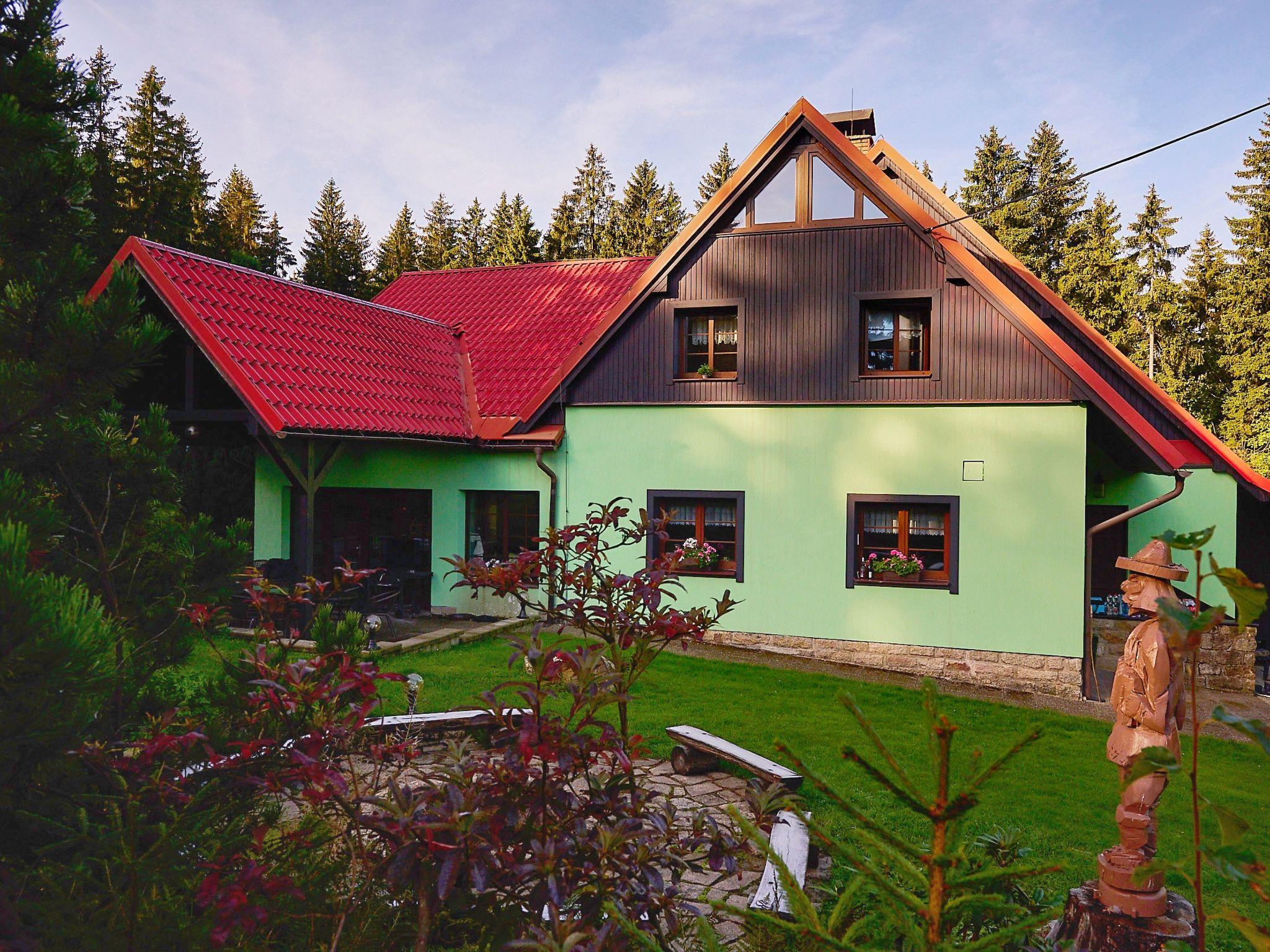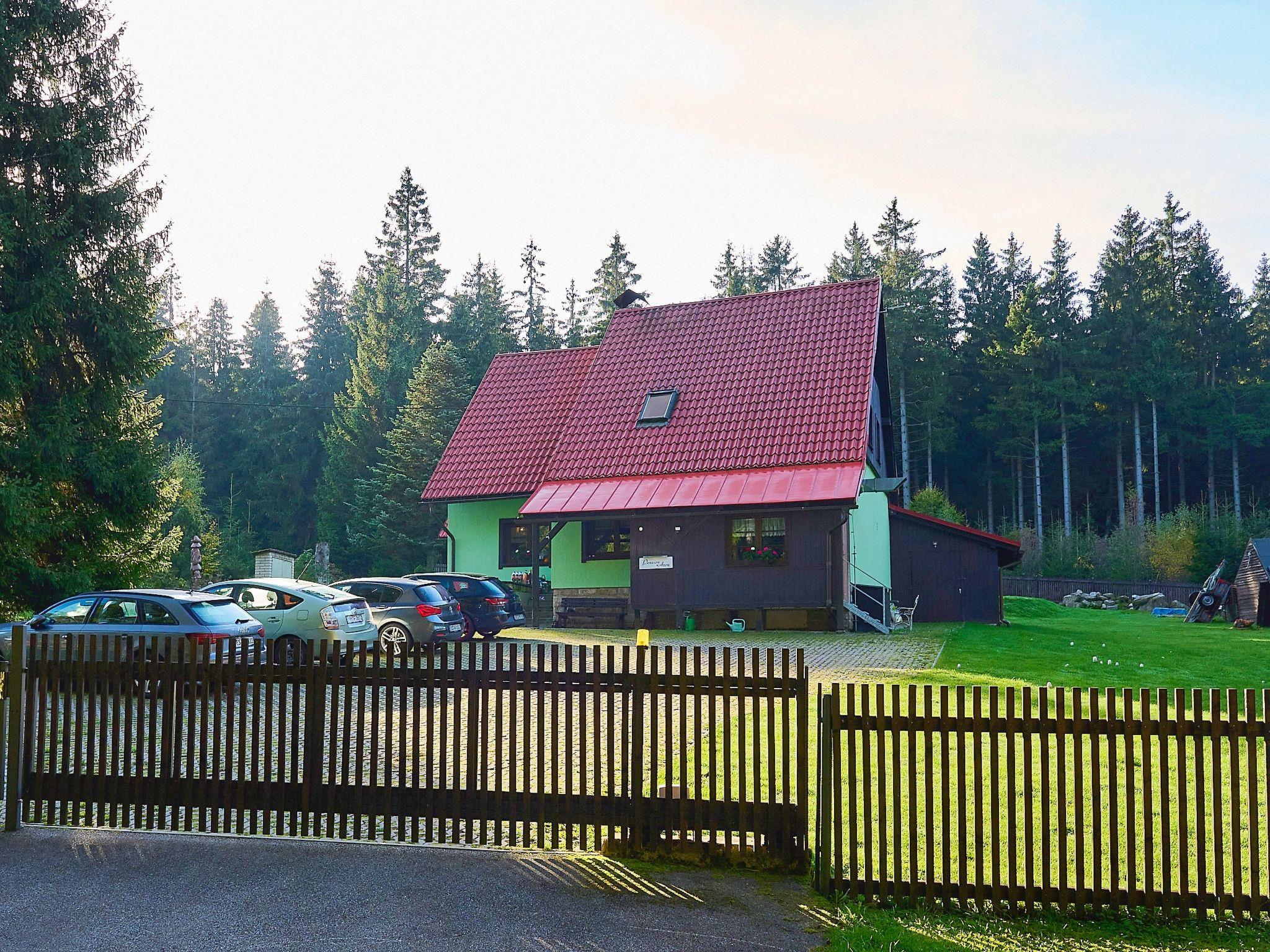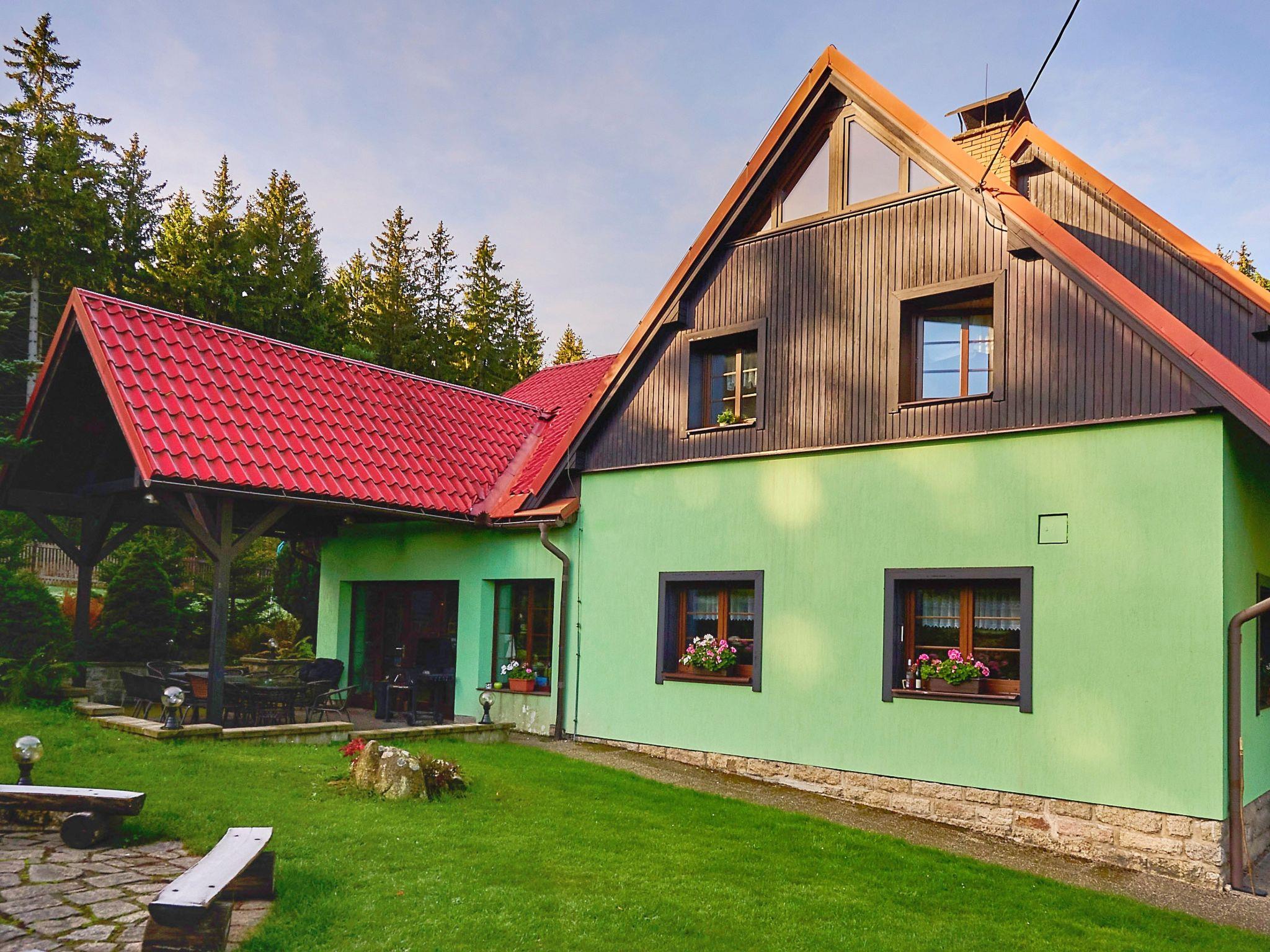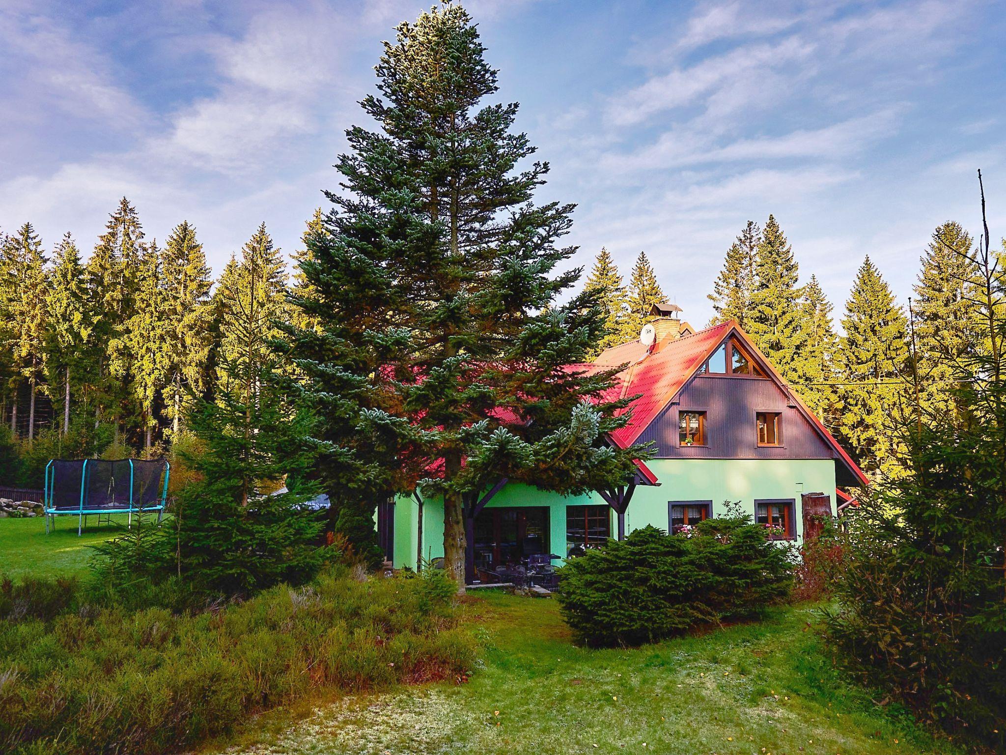 Very beautiful single-family house "Jelení kout", 2 storeys, detached, built in 1994, renovated in 2000, surrounded by trees. Outside the resort, traffic calmed area, along the wooded area, 1.5 km from the skiing area, in a cul-de-sac. Private: property 2'500 m2 (fenced), garden, indoor pool heated, with privacy (4 x 7 m, seasonal availability: 01.Jan. - 31.Dec.). Terrace, garden furniture, barbecue, fireplace, children's playground (swing, sandbox). In the house: WiFi, sauna (extra). Trampoline, washing machine. In Winter: please take snow chains. Parking (for 6 cars) on the premises. Shop 2.5 km, grocery 2.5 km, shopping centre 20 km, restaurant 2.5 km, café 3 km, bus stop "Smržovka, sánkarská dráha" 1.5 km, railway station "Smržovka stred" 2 km, outdoor swimming pool 7 km, indoor swimming pool 20 km. Golf course (18 hole) 17 km, tennis 4 km, riding stable 2 km, cycle lane 100 m, ski lift 2 km, slopes 2 km, ski rental 2 km, ski school 2 km, sled run 300 m, cross country ski track, children's playground 3 km. Nearby attractions: Rozhledna Cerná Studnice 2 km, Muzeum obrnené techniky Smržovka 2 km, Kittelovo muzeum v Krásné 5 km, Vodopády v Jedlové 17 km, Zoo Liberec, Aquapark Babylon 20 km, Bozkovské jeskyne 24 km. Well-known ski regions can easily be reached: Filip Smržovka 2 km, Tanvaldský Špicák 8 km, Ski areál Severák, Bedrichov, Harrachov. Hiking paths: Hrebenovka. Please note: baby equipment. Sauna and pool heating to be paid on the spot (according to electricity use).