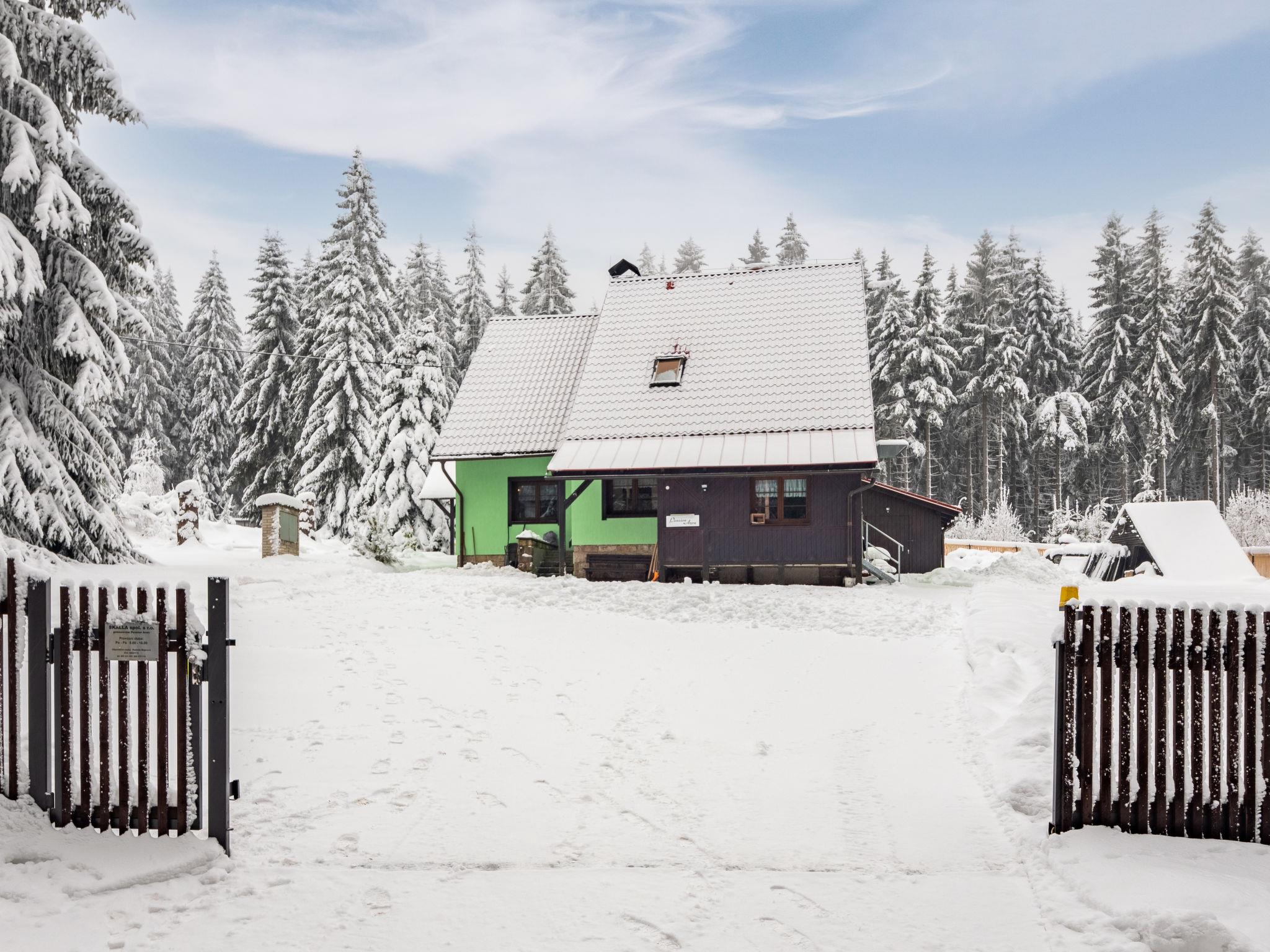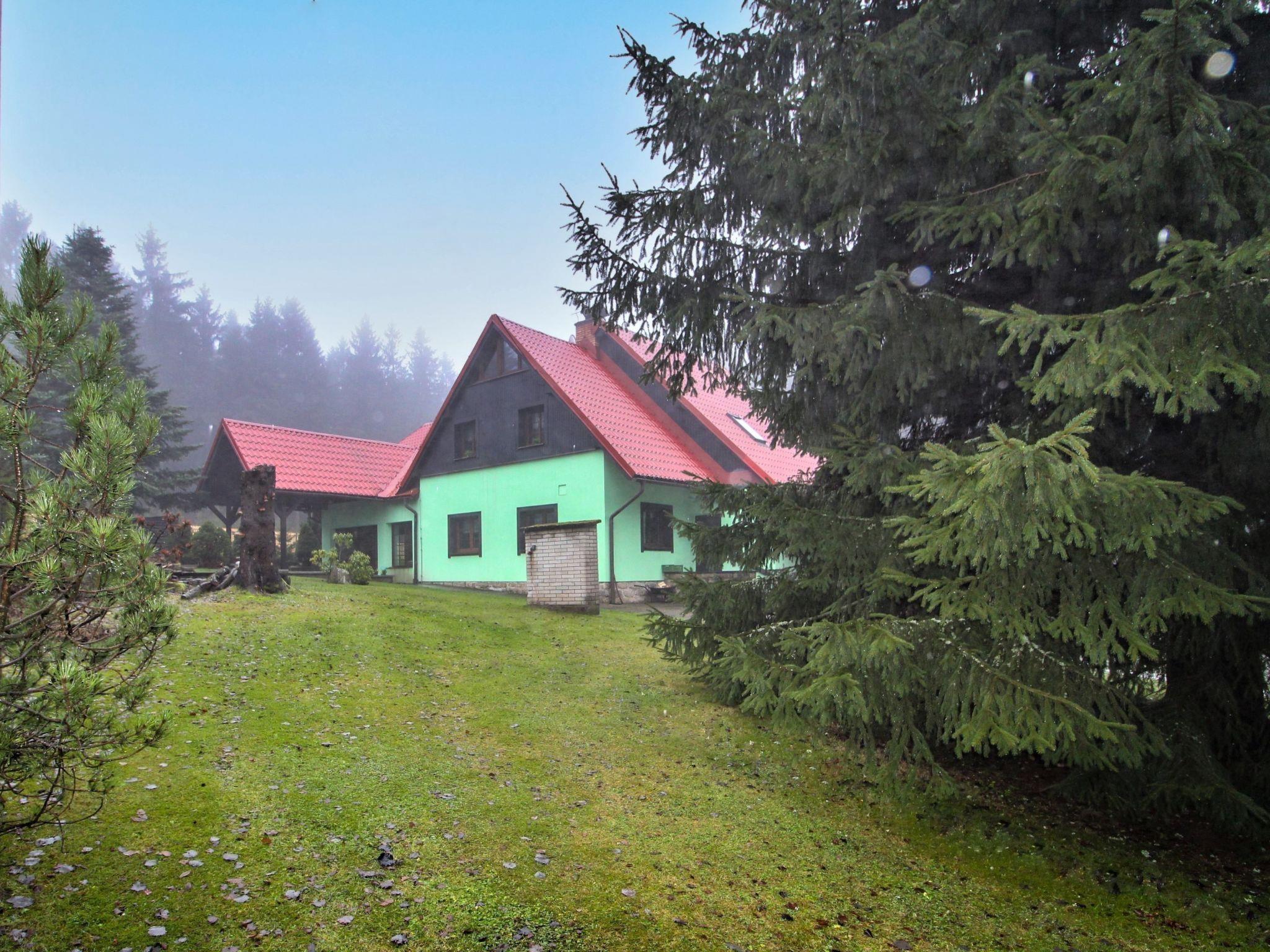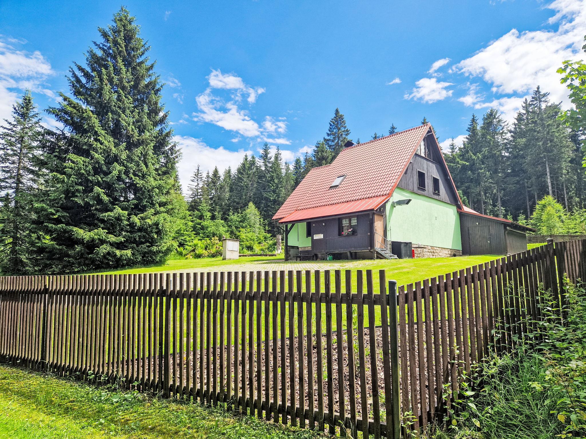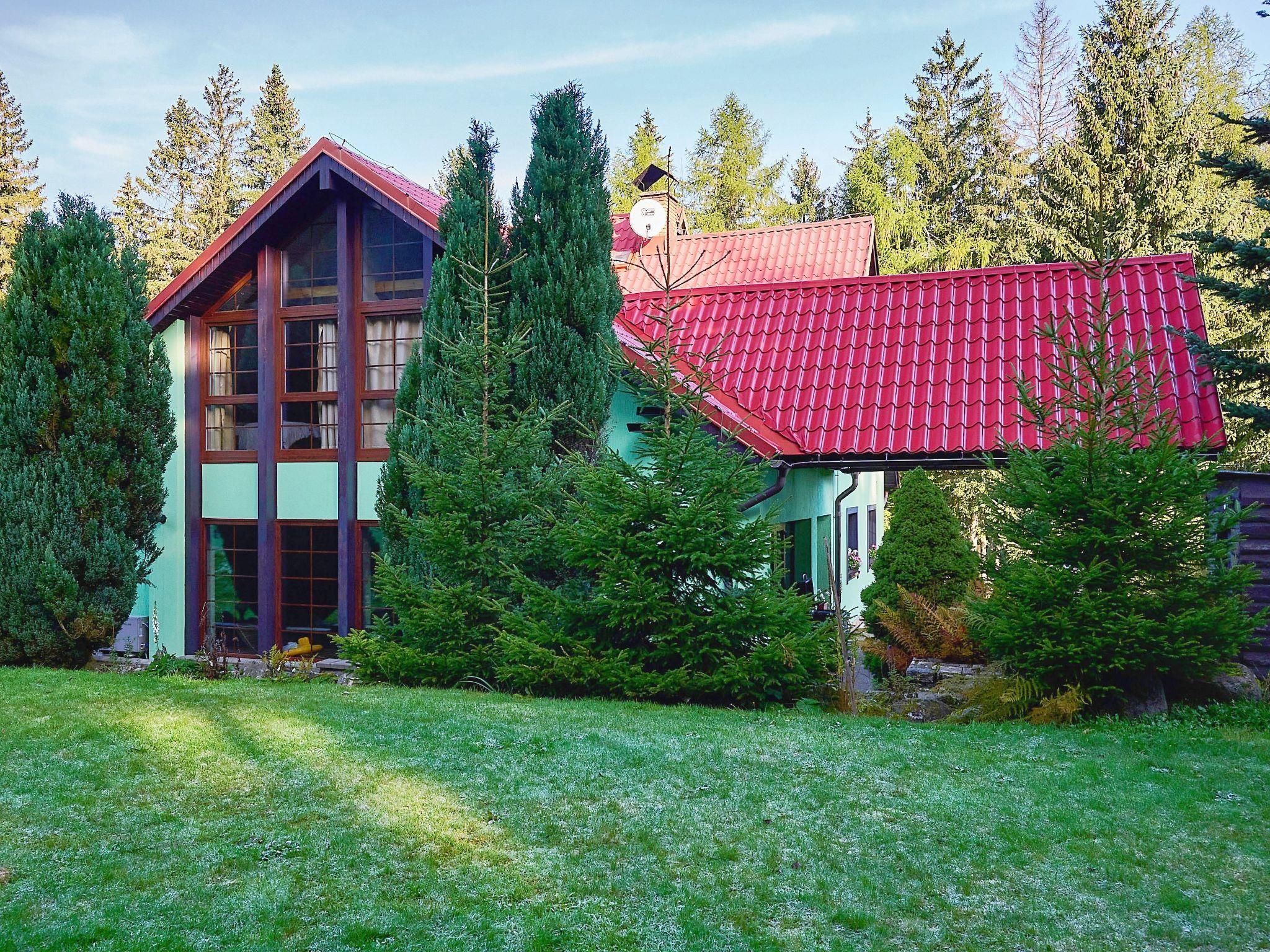 Very beautiful single-family house "Jelení kout", 2 storeys, detached, built in 1994, renovated in 2000, surrounded by trees. Outside the resort, traffic calmed area, along the wooded area, 1.5 km from the skiing area, in a cul-de-sac. Private: property 2'500 m2 (fenced), garden, indoor pool heated, with privacy (4 x 7 m, seasonal availability: 01.Jan. - 31.Dec.). Terrace, garden furniture, barbecue, fireplace, children's playground (swing, sandbox). In the house: WiFi, sauna (extra). Trampoline, washing machine. In Winter: please take snow chains. Parking (for 6 cars) on the premises. Shop 2.5 km, grocery 2.5 km, shopping centre 20 km, restaurant 2.5 km, café 3 km, bus stop "Smržovka, sánkarská dráha" 1.5 km, railway station "Smržovka stred" 2 km, outdoor swimming pool 7 km, indoor swimming pool 20 km. Golf course (18 hole) 17 km, tennis 4 km, riding stable 2 km, cycle lane 100 m, ski lift 2 km, slopes 2 km, ski rental 2 km, ski school 2 km, sled run 300 m, cross country ski track, children's playground 3 km. Nearby attractions: Rozhledna Cerná Studnice 2 km, Muzeum obrnené techniky Smržovka 2 km, Kittelovo muzeum v Krásné 5 km, Vodopády v Jedlové 17 km, Zoo Liberec, Aquapark Babylon 20 km, Bozkovské jeskyne 24 km. Well-known ski regions can easily be reached: Filip Smržovka 2 km, Tanvaldský Špicák 8 km, Ski areál Severák, Bedrichov, Harrachov. Hiking paths: Hrebenovka. Please note: baby equipment. Sauna and pool heating to be paid on the spot (according to electricity use).