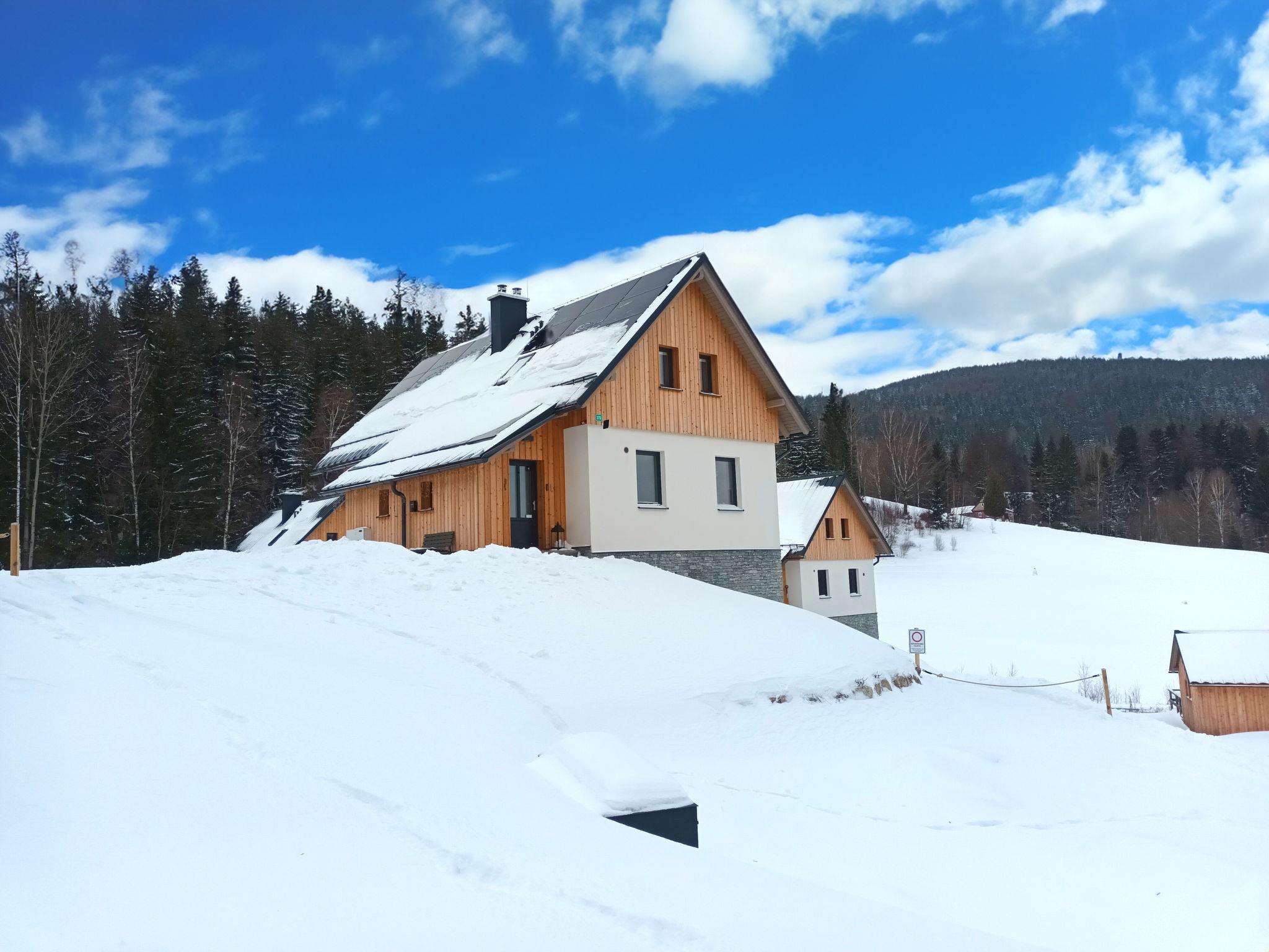 Comfortable cottage, 2 storeys, detached, built in 2023. Outside the resort, along the wooded area, 2 km from the skiing area. Private: property. Terrace. In Winter: please take snow chains. Parking. E-charging station. Shop 2 km, grocery 2.5 km, supermarket 6 km, shopping centre 20 km, restaurant 2 km, bus stop "Jiretín pod Bukovou" 1.4 km, railway station "Jiretín pod Bukovou" 1.3 km, outdoor swimming pool 7 km, indoor swimming pool 20 km. Golf course (9 hole) 17 km, walking paths from the house 10 m, cycle lane 100 m, ski lift 2 km, slopes 2 km, ski rental 2 km, ski school 2 km, cross country ski track 100 m, children's playground 3 km. Nearby attractions: Rozhledna Cerná Studnice 6 km, Muzeum obrnené techniky Smržovka 6 km, Vodopády Jedlové 7 km, Kittelovo muzeum v Krásné 12 km, Aquapark Babylon, IQLandia, ZOO Liberec 22 km, Bozkovské jeskyne 22 km. Well-known ski regions can easily be reached: Tanvaldský Špicák 2 km, Filip Smržovka 4 km, Svetlý Vrch Albrechtice 4 km, Josefuv Dul 7 km, Severák, Bedrichov 12 km. Hiking paths: Hrebenovka.