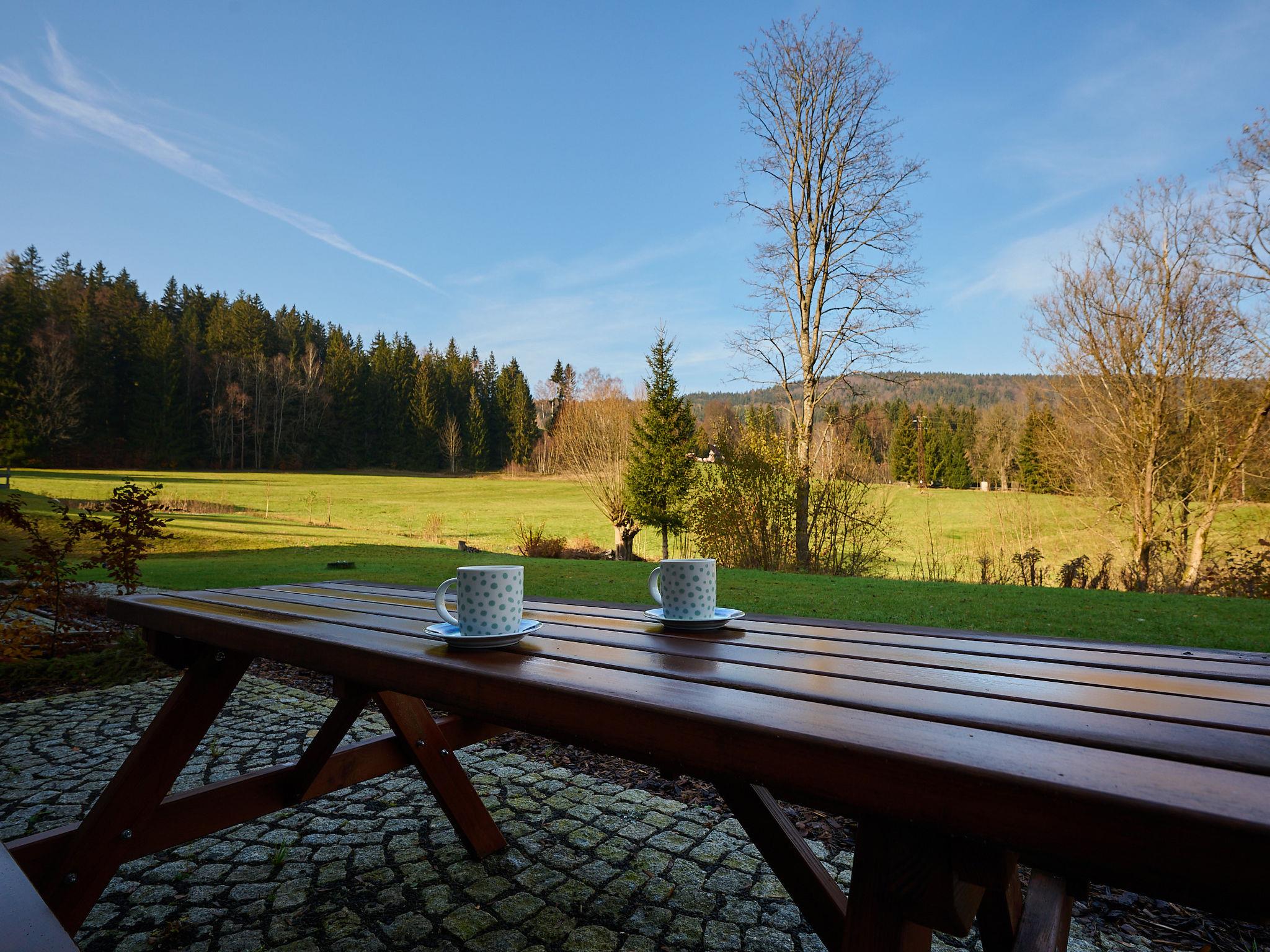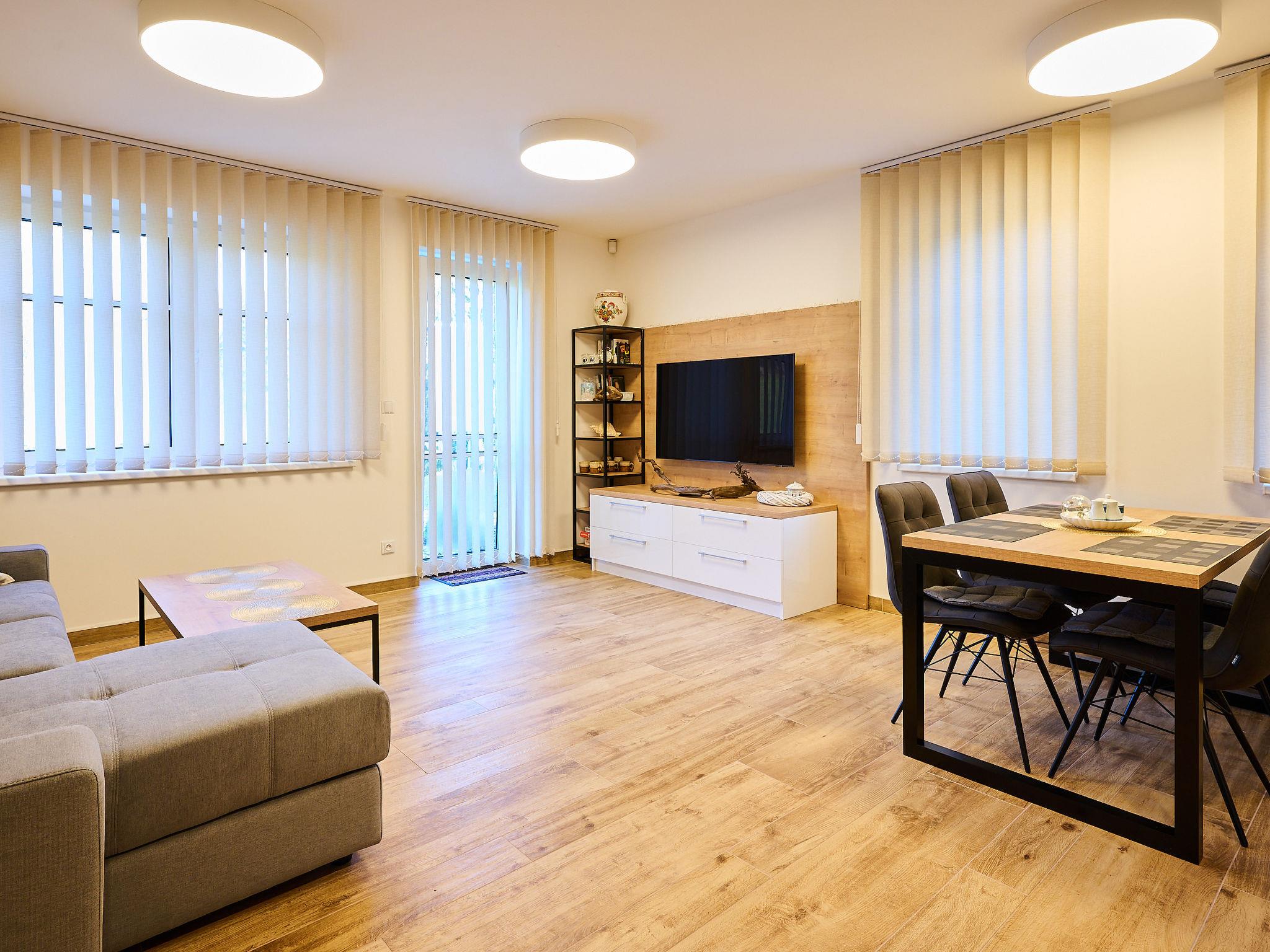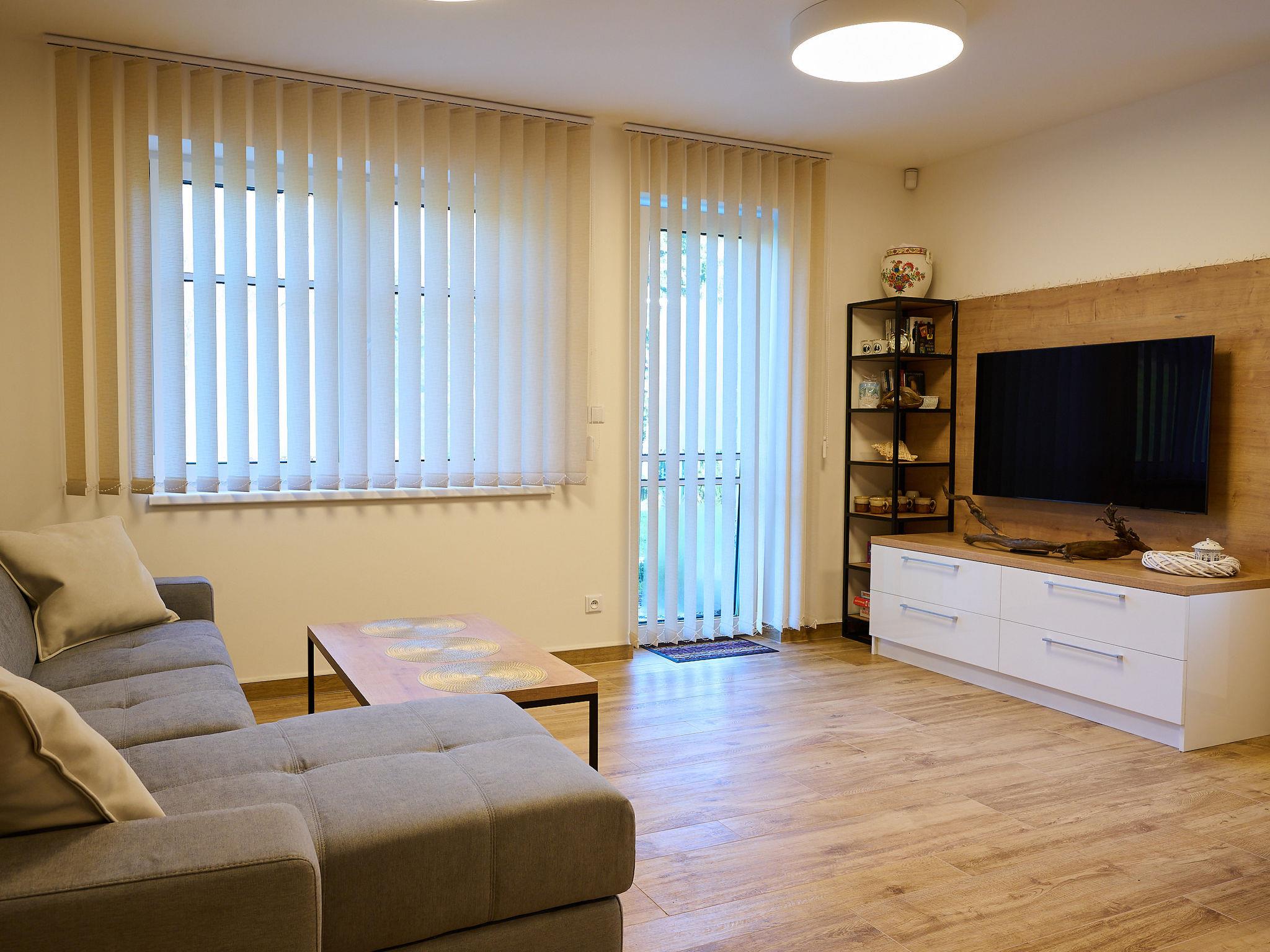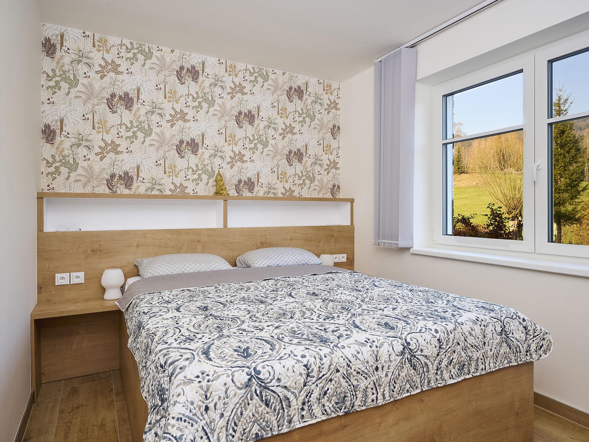 " Markéta", 2-room apartment on the ground floor. Very beautiful and modern furnishings: open living room with panoramic window with 1 double sofabed, TV and electric heating. 1 room with 1 double bed. Open kitchen (oven, 4 ceramic glass hob hotplates, toaster, kettle, microwave, electric coffee machine) with dining table. Shower/WC. Floor heating. Terrace furniture. Beautiful panoramic view of the valley. Facilities: Internet (WiFi, free). Parking. Please note: non-smoking house. Smoke alarm.