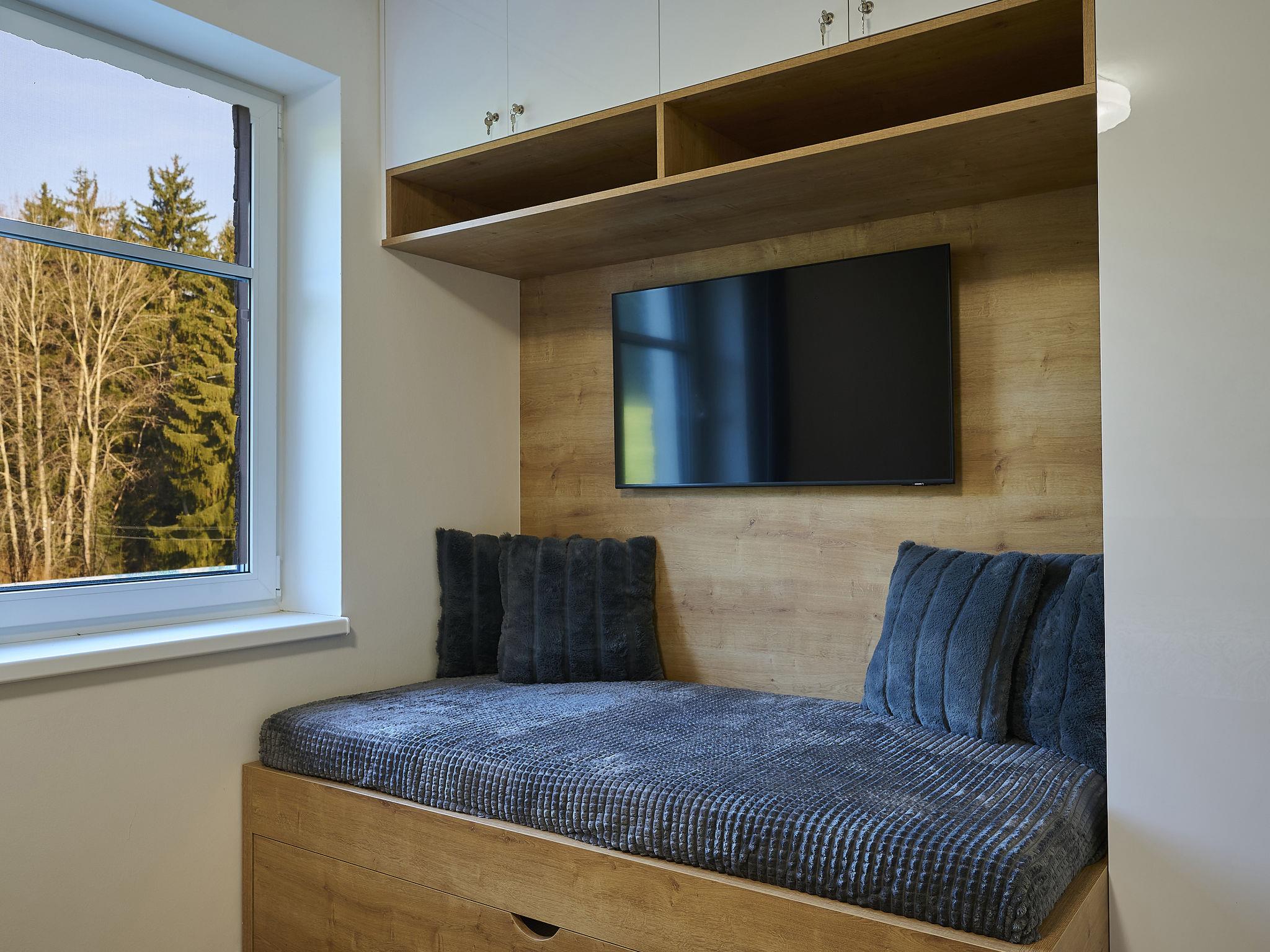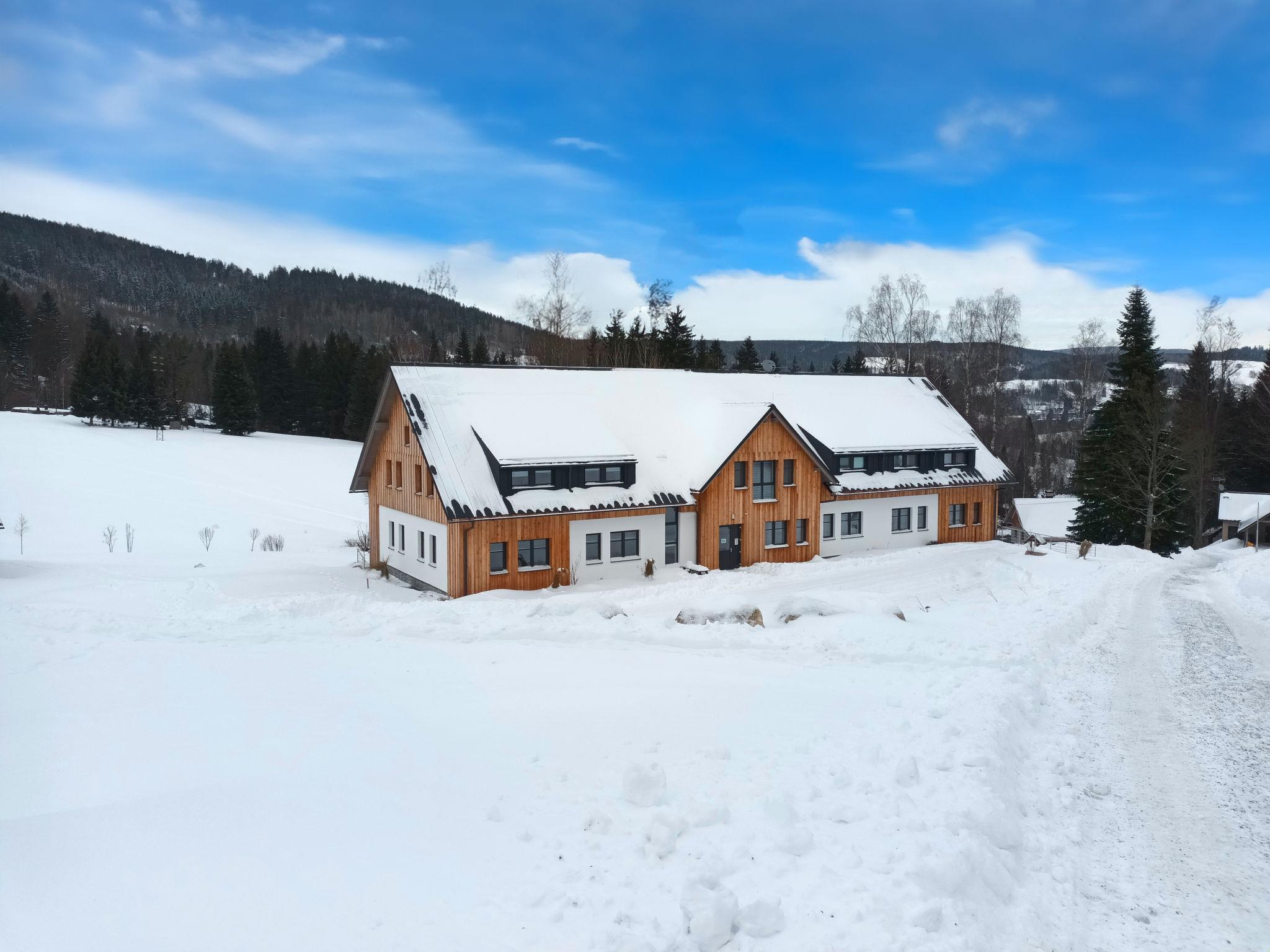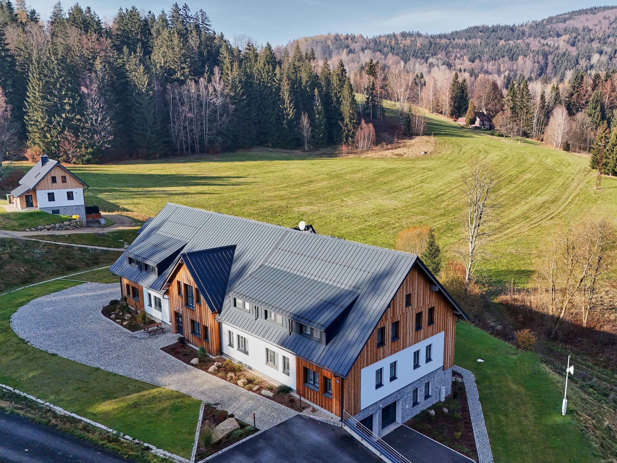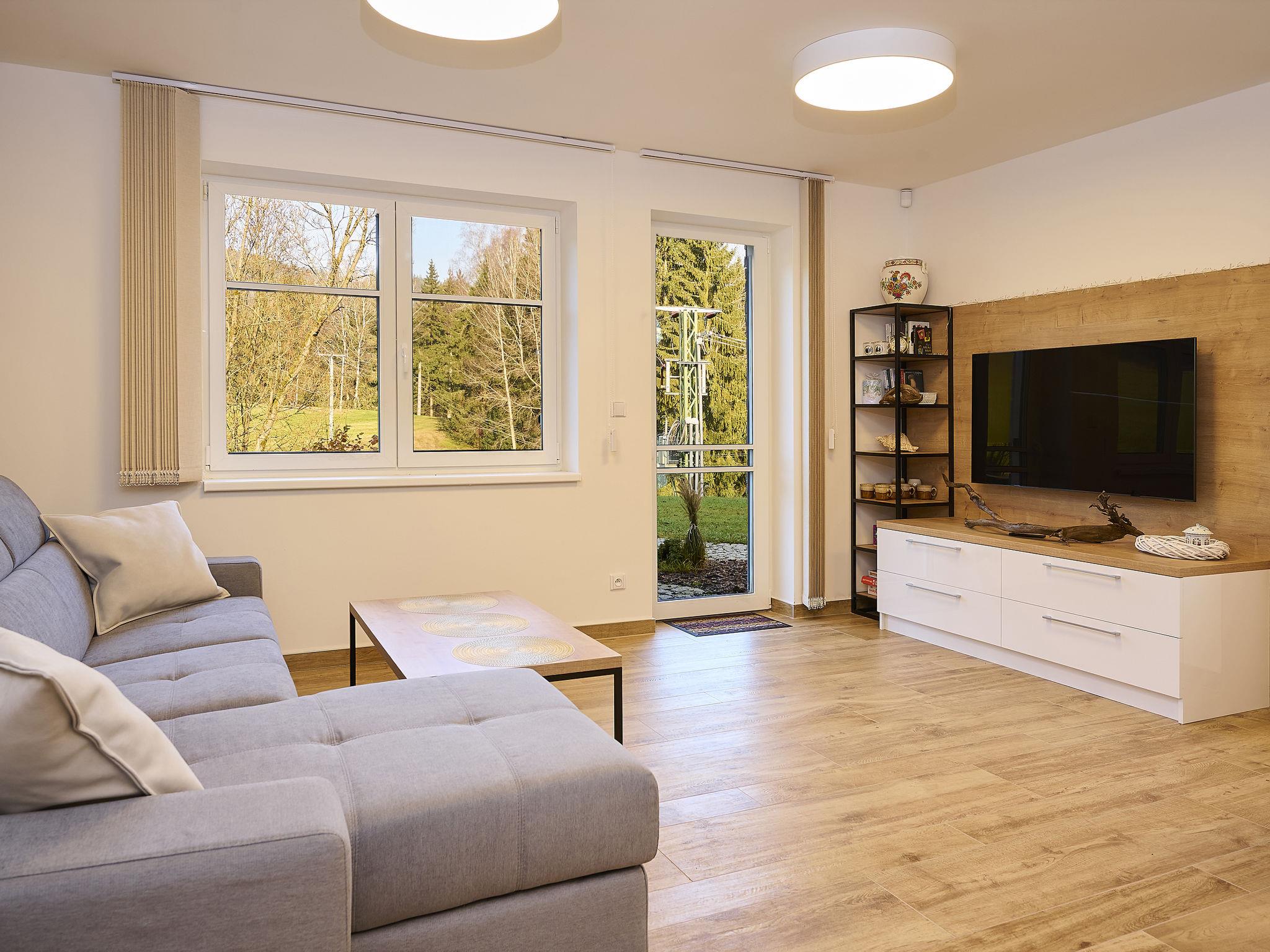 Comfortable apartment block, 2 storeys, detached, built in 2023. Outside the resort, along the wooded area, 2 km from the skiing area. In Winter: please take snow chains. Parking. Shop 2 km, grocery 2.5 km, supermarket 6 km, shopping centre 20 km, restaurant 2 km, bus stop "Jiretín pod Bukovou, ObÚ" 1 km, outdoor swimming pool 7 km, indoor swimming pool 20 km. Golf course (9 hole) 17 km, walking paths from the house 10 m, cycle lane 100 m, ski lift 2 km, slopes 2 km, ski rental 2 km, ski school 2 km, cross country ski track 100 m, children's playground 3 km. Nearby attractions: Rozhledna Cerná Studnice 6 km, Muzeum obrnené techniky Smržovka 6 km, Vodopády Jedlové 7 km, Kittelovo muzeum v Krásné 12 km, Aquapark Babylon, IQLandia, ZOO Liberec 22 km, Bozkovské jeskyne 22 km. Well-known ski regions can easily be reached: Tanvaldský Špicák 2 km, Filip Smržovka 4 km, Svetlý Vrch Albrechtice 4 km, Josefuv Dul 7 km, Severák, Bedrichov 12 km. Hiking paths: Hrebenovka.