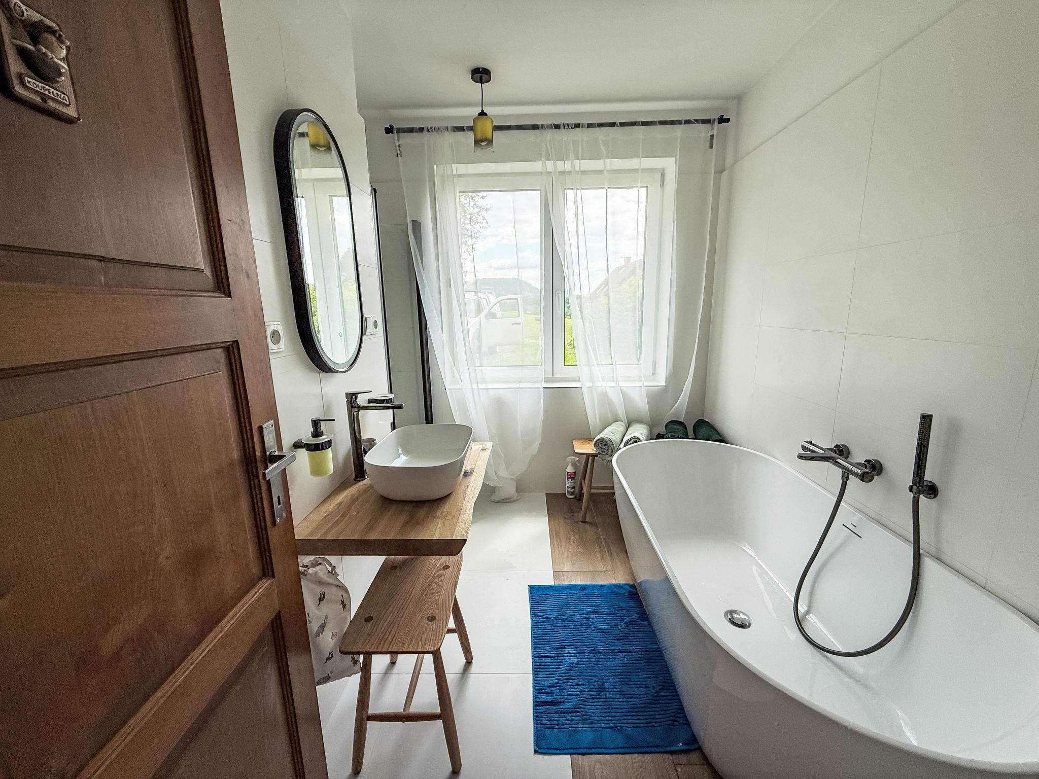Stárkov 18 km from Náchod: Resort "Stárkov", 450 m a.s.l., detached, built in 1997, renovated, surrounded by meadows. 22 houses in the resort. On the outskirts, in a sunny, elevated position on a slope, along the wooded area, 24 km from the lake, 10 km from the skiing area, in the countryside. For shared use: property 10 ha, meadow, pond, swimming pool (8 x 4 m, depth 150 cm, seasonal availability: 15.Jun. - 16.Sep.). Table tennis, volleyball, badminton, volleyball court, beach volleyball, patio, barbecue, fireplace, children's playground (slide, swing, sandbox). In the complex: reception, lounge, bistro, massage (extra). Billiard table, table football, trampoline, kiosk, storage room for bicycles, laundry (extra). Linen change (suppl. charge extra). Towel change (suppl. charge extra). Room cleaning on request (extra). Bread roll service possible on request. Pre-arrival grocery service. Motor access to 200 m from the house. Parking at the house. Grocery 1 km, supermarket 8 km, restaurant 1 km, café 10 m, bus stop "Stárkov,mlékárna" 280 m, railway station "Ždár nad Metují" 4.6 km, indoor swimming pool 18 km. Golf course (9 hole) 26 km, sailing school 26 km, tennis 500 m, riding stable, walking paths from the house, cycle lane 10 m, ski lift 6 km, ski school 17 km, cross country ski track 100 m, ice rink 8 km, children's playground 10 m. Nearby attractions: Adršpašsko-teplické skály 15 km, Náchod 17 km, Broumovské steny 17 km, Ratiborice a Babiccino údolí 22 km, Broumov 24 km, Relaxpark Pec pod Snežkou 50 km. Well-known ski regions can easily be reached: Radvanice 10 km, Petríkovice 17 km, Mladé Buky 36 km. Well-known lakes can easily be reached: vodní nádrž Rozkoš 26 km. Please note: suitable for families, suitable for seniors baby equipment on request (included).