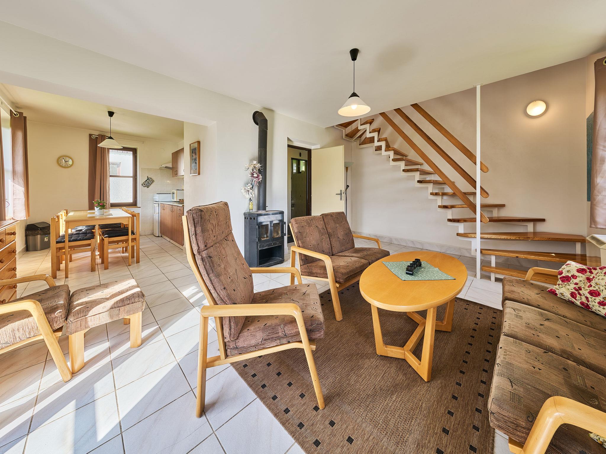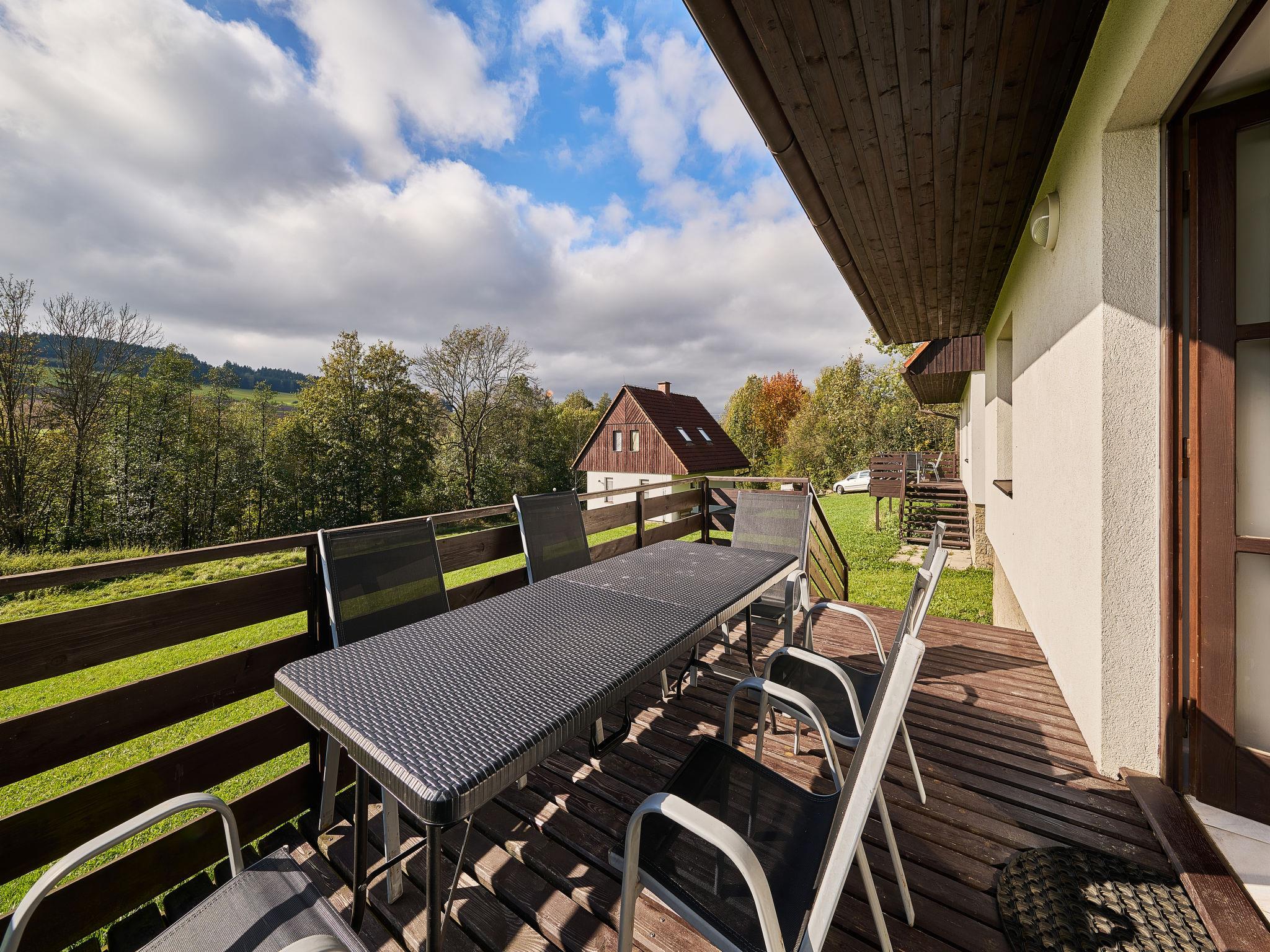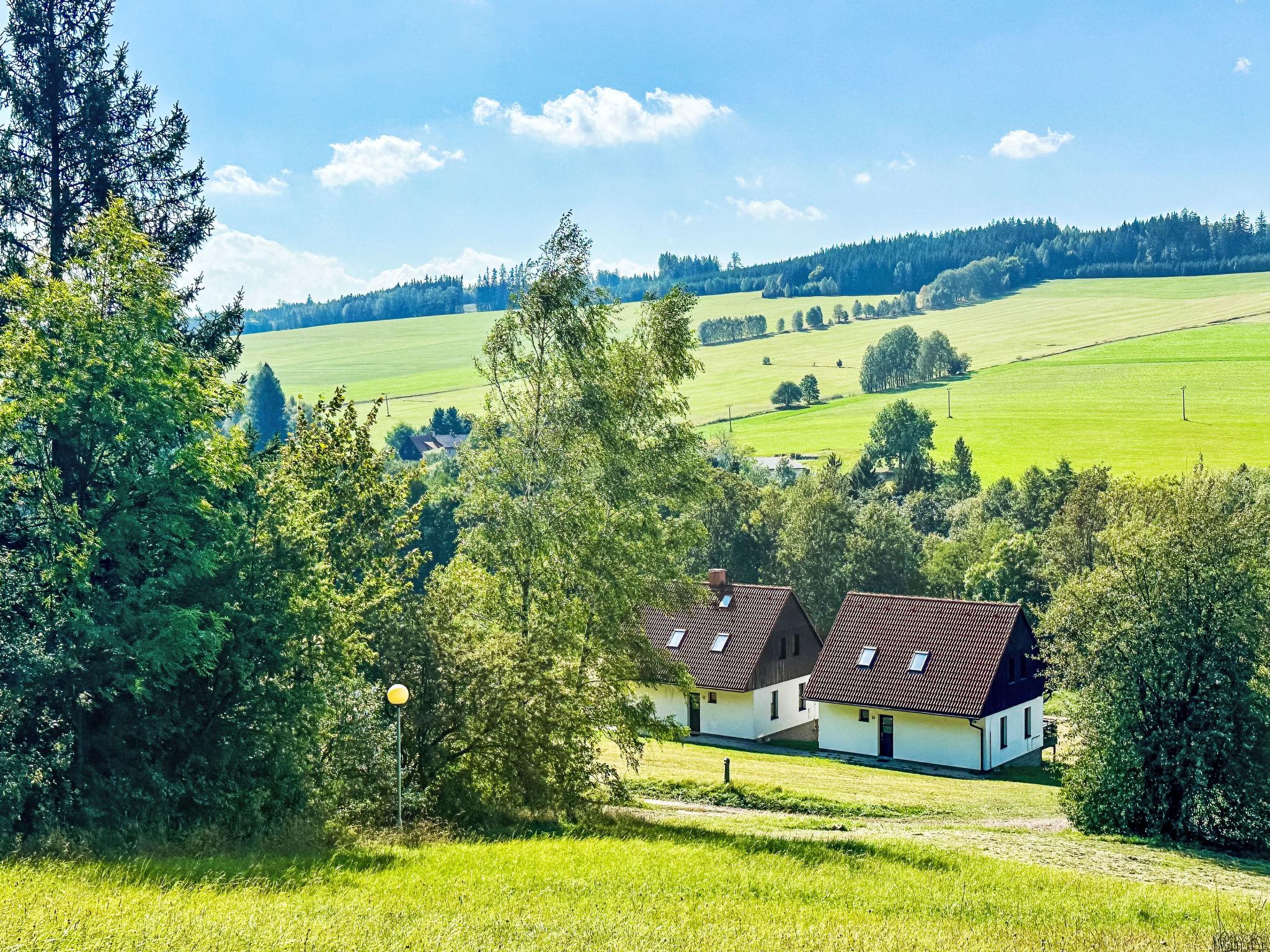 Stárkov 18 km from Náchod: Resort "Stárkov", 450 m a.s.l., semi-detached, built in 1997, surrounded by meadows. 22 houses in the resort. On the outskirts, in a sunny, elevated position on a slope, along the wooded area, 24 km from the lake, 10 km from the skiing area, in the countryside. For shared use: property 10 ha, meadow, pond, swimming pool (8 x 4 m, depth 150 cm, seasonal availability: 15.Jun. - 16.Sep.). Table tennis, volleyball, badminton, volleyball court, beach volleyball, patio, barbecue, fireplace, children's playground (slide, swing, sandbox). In the complex: reception, lounge, bistro, massage (extra). Billiard table, table football, trampoline, kiosk, storage room for bicycles, laundry (extra). Linen change (suppl. charge extra). Towel change (suppl. charge extra). Room cleaning on request (extra). Bread roll service possible on request. Pre-arrival grocery service. Motor access to 200 m from the house. Parking at the house. Grocery 1 km, supermarket 8 km, restaurant 1 km, café 10 m, bus stop "Stárkov,mlékárna" 280 m, railway station "Ždár nad Metují" 4.6 km, indoor swimming pool 18 km. Golf course (9 hole) 26 km, sailing school 26 km, tennis 500 m, riding stable, walking paths from the house, cycle lane 10 m, ski lift 6 km, ski school 17 km, cross country ski track 100 m, ice rink 8 km, children's playground 10 m. Nearby attractions: Adršpašsko-teplické skály 15 km, Náchod 17 km, Broumovské steny 17 km, Ratiborice a Babiccino údolí 22 km, Broumov 24 km, Relaxpark Pec pod Snežkou 50 km. Well-known ski regions can easily be reached: Radvanice 10 km, Petríkovice 17 km, Mladé Buky 36 km. Well-known lakes can easily be reached: vodní nádrž Rozkoš 26 km. Please note: suitable for families, suitable for seniors baby equipment on request (included).
