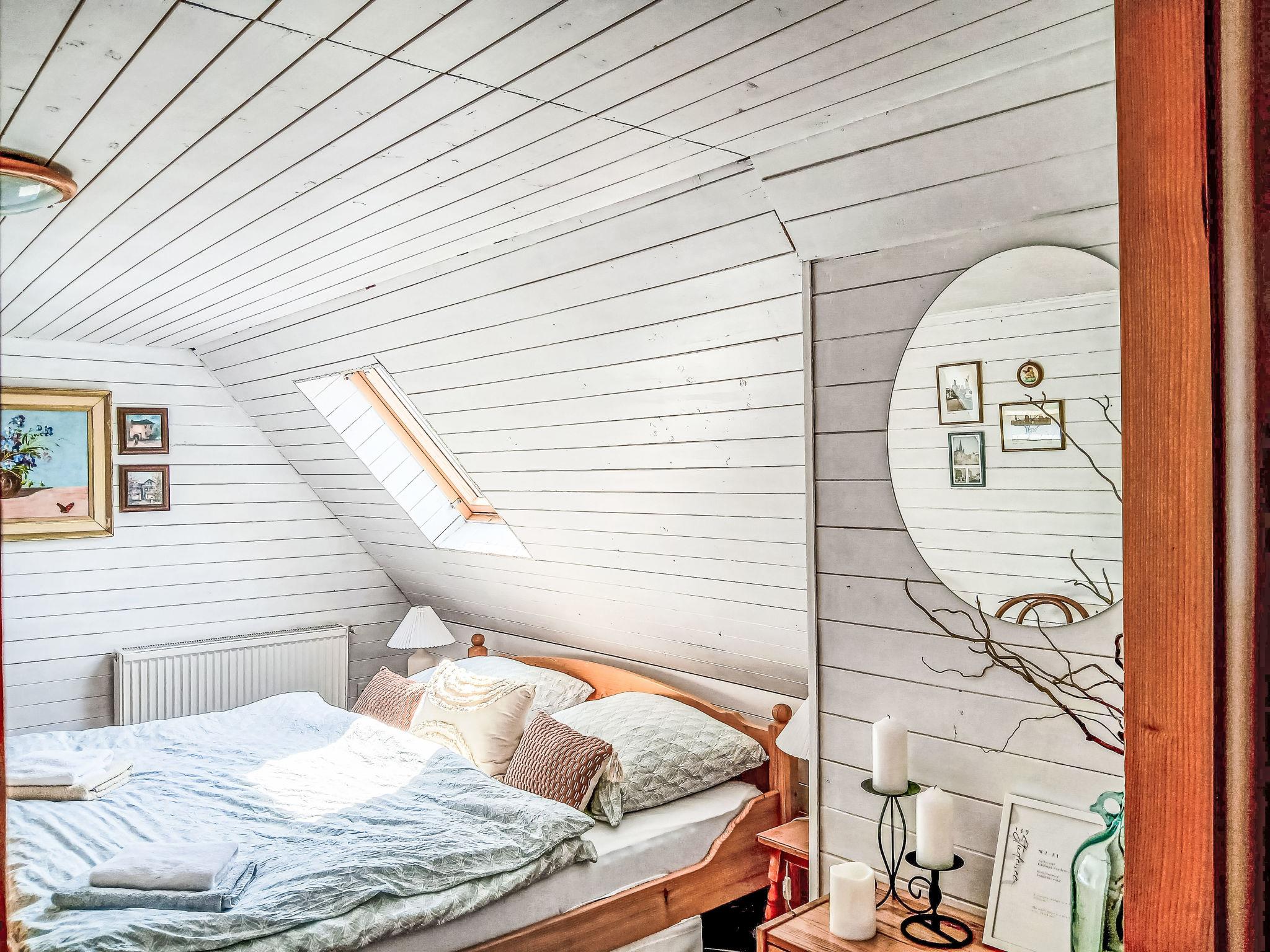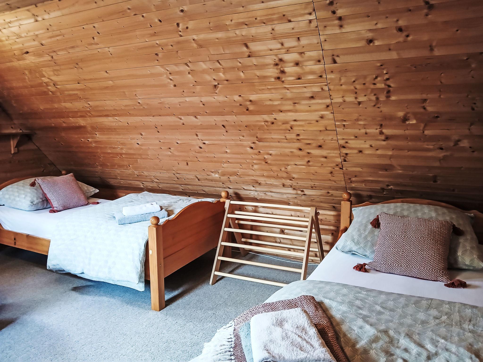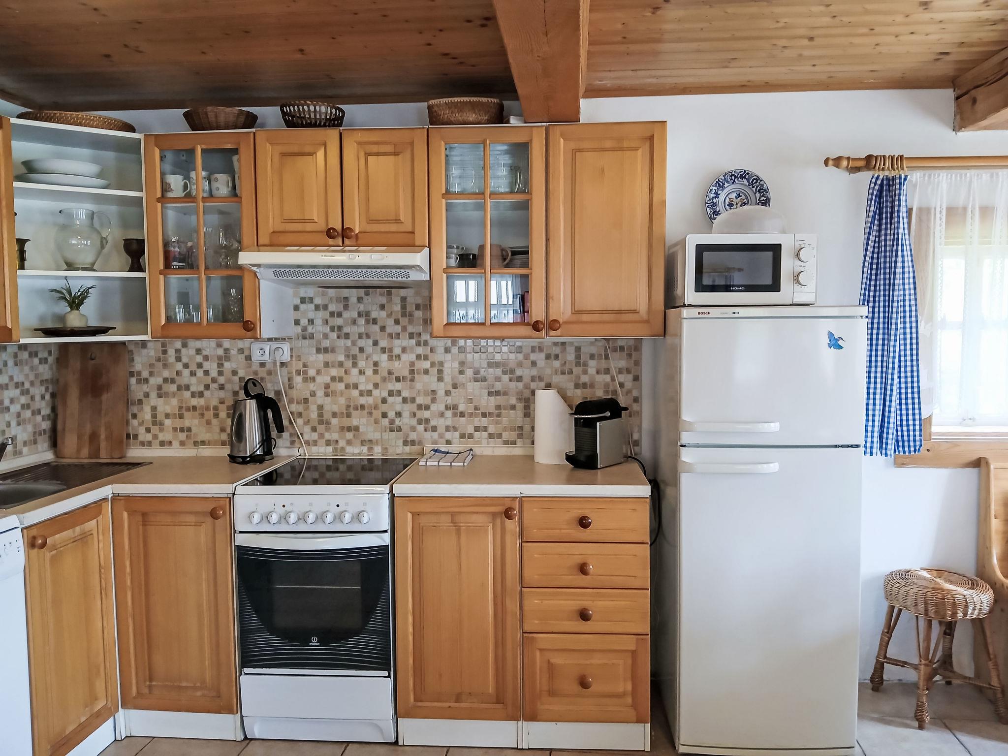 4-room chalet on 2 levels. Spacious and bright, fully renovated, very comfortable and beautiful furnishings: entrance hall with open-hearth fireplace and TV. Living/dining room with dining nook. Kitchenette (oven, dishwasher, 4 ceramic glass hob hotplates, kettle, microwave, freezer, electric coffee machine). Shower, sep. WC, Sauna. Electric heating. Upper floor: 1 room with 1 double bed. 1 room with 1 double bed. 1 room with 3 beds and 1 pull-out bed. Sep. WC. Facilities: washing machine, baby cot. Internet (WiFi, free). Please note: non-smoking house. Maximum 1 small pet/ dog allowed.