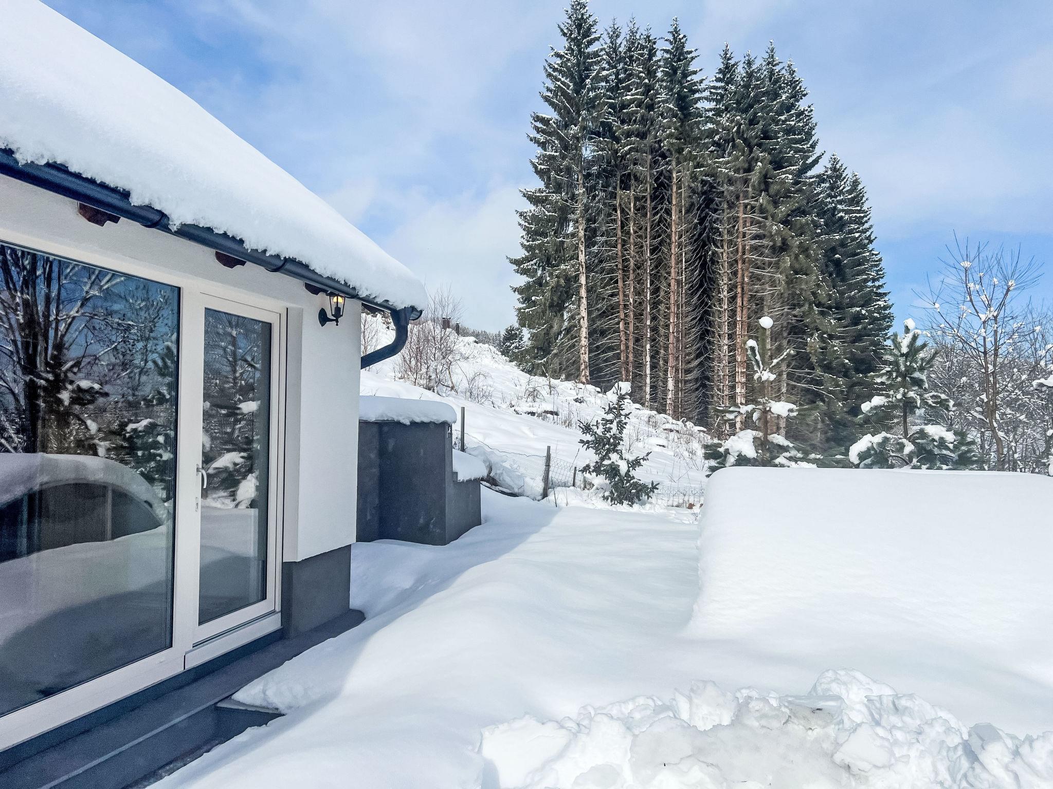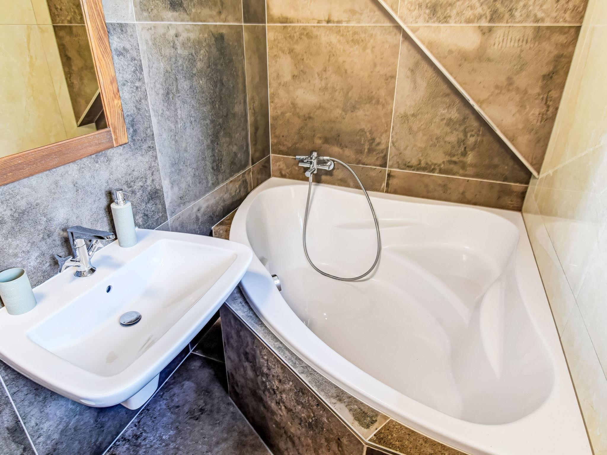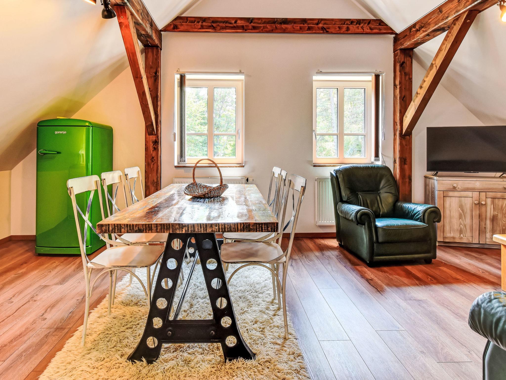 "Zadov", 9-room cottage 300 m2 on 3 levels. Stylish and wooden furniture furnishings: 1 room 13 m2 with 1 double bed. 1 room 15 m2 with 1 double bed. Kitchen-/living room 28 m2 (oven, dishwasher, 4 ceramic glass hob hotplates, kettle, microwave) with 1 sofabed, dining table and TV. Shower/WC. Heating. On the lower ground floor: 1 room 15 m2 with 1 double bed. Exit to the terrace. Kitchen-/living room 26 m2 (oven, dishwasher, 4 ceramic glass hob hotplates, kettle, microwave) with 1 sofabed, Scandinavian wood stove, dining table and TV. Exit to the terrace. Shower/WC. Heating. Upper floor: (spiral staircase), 1 room 17 m2 with 1 double bed. 1 room 12 m2 with 2 beds. 1 small room 10 m2 with 1 double bed. Large kitchen-/living room 38 m2 (oven, dishwasher, 4 ceramic glass hob hotplates, kettle, microwave) with 1 sofabed. Bath/shower/WC. Wooden floors. Facilities: Internet (WiFi, free). Please note: fire extinguisher, no lift.