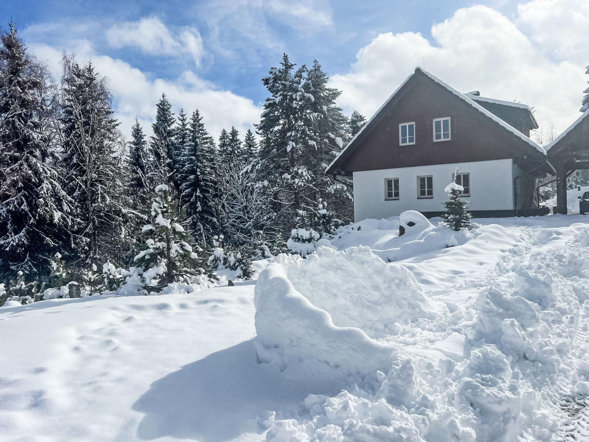 very beautiful cottage "Zadov", 3 storeys, detached, surrounded by trees. In a quiet, sunny position, 100 m from the edge of the forest, 1 km from the skiing area. For shared use: property 2'500 m2 with lawn, swimming pool (8 x 3 m, 24 m2, seasonal availability: 01.Jun. - 30.Sep.). Garden furniture, barbecue, fireplace. In the house: WiFi, sauna, sun terrace, central heating system. Parking at the house. Grocery 2 km, supermarket 20 km, restaurant, bar, café 500 m, bus stop "Zadov" 500 m, railway station "Vimperk" 11 km. Nearby attractions: Šumavská slat – rašelinište 1 km, Hribová rezervace Stachy 2 km, Boubínský prales a vyhlídková vež 25 km, Národní park Šumava, Obrí hrad – keltské hradište (Nicov) 5 km, Rozhledna na skokanském mustku-Churánov 1 km. Well-known ski regions can easily be reached: Lyžarský areál Zadov/Churánov 1 km. Well-known lakes can easily be reached: Plešné jezero 55 km, Pramen Vltavy 25 km. Object suitable for 12 adults.