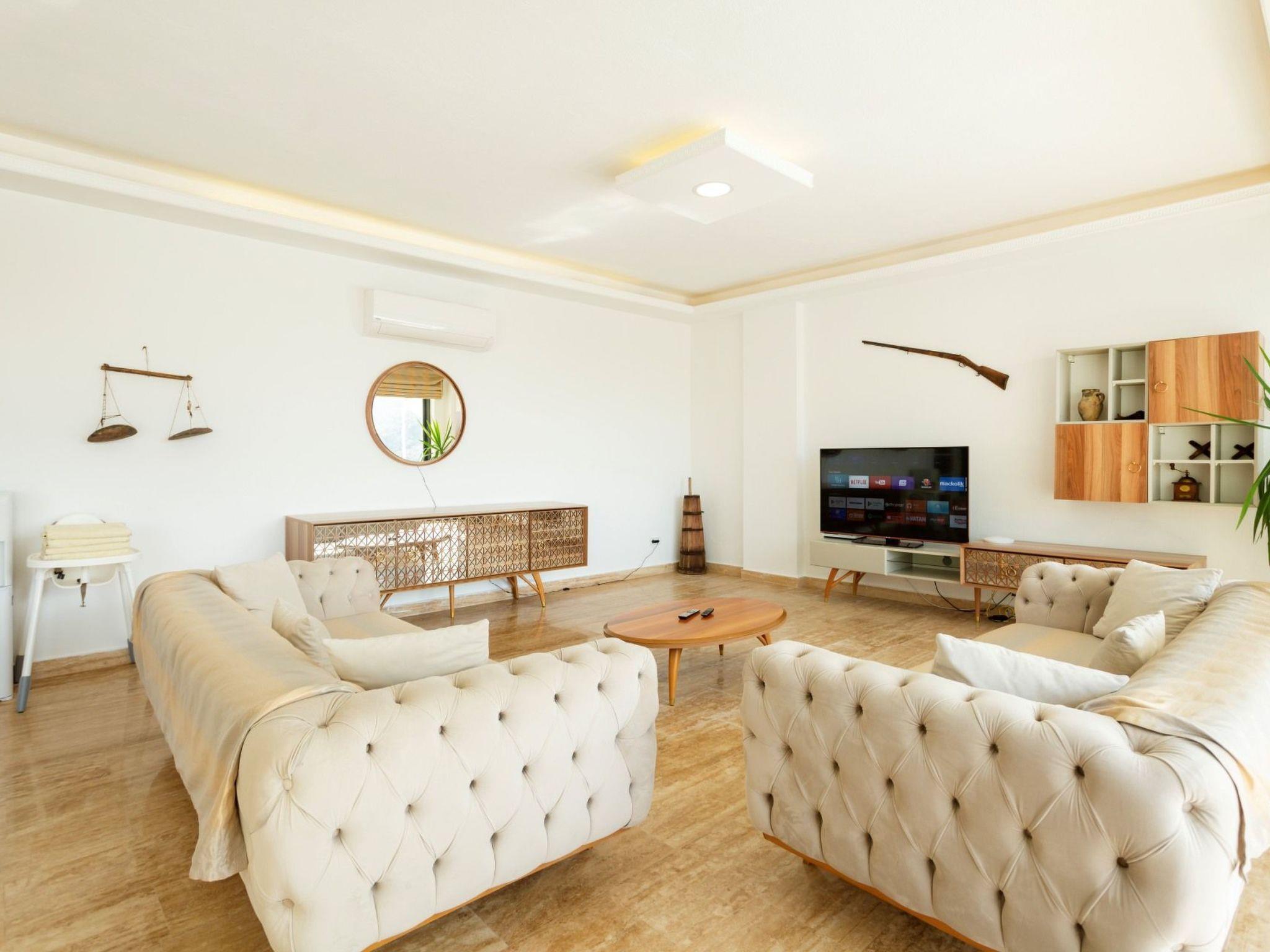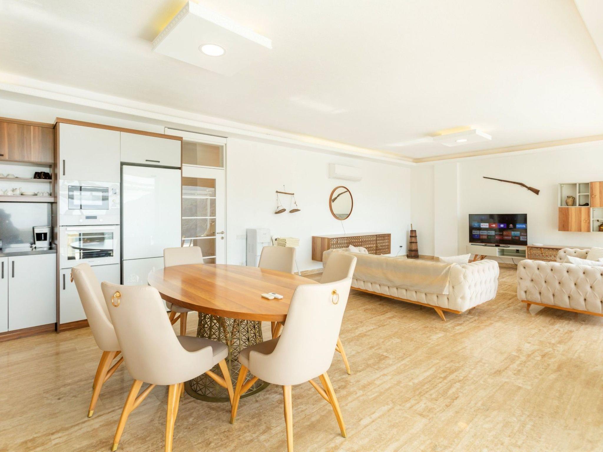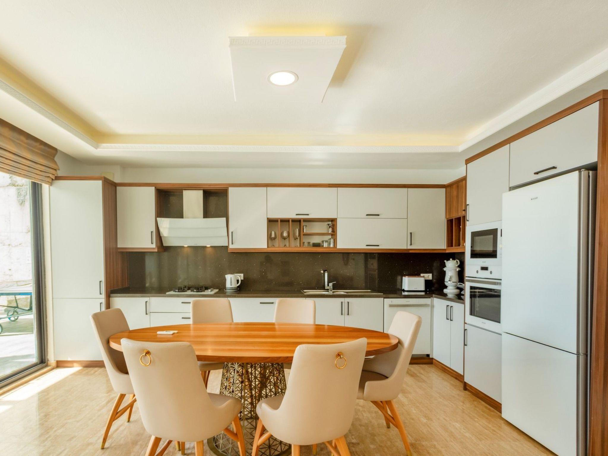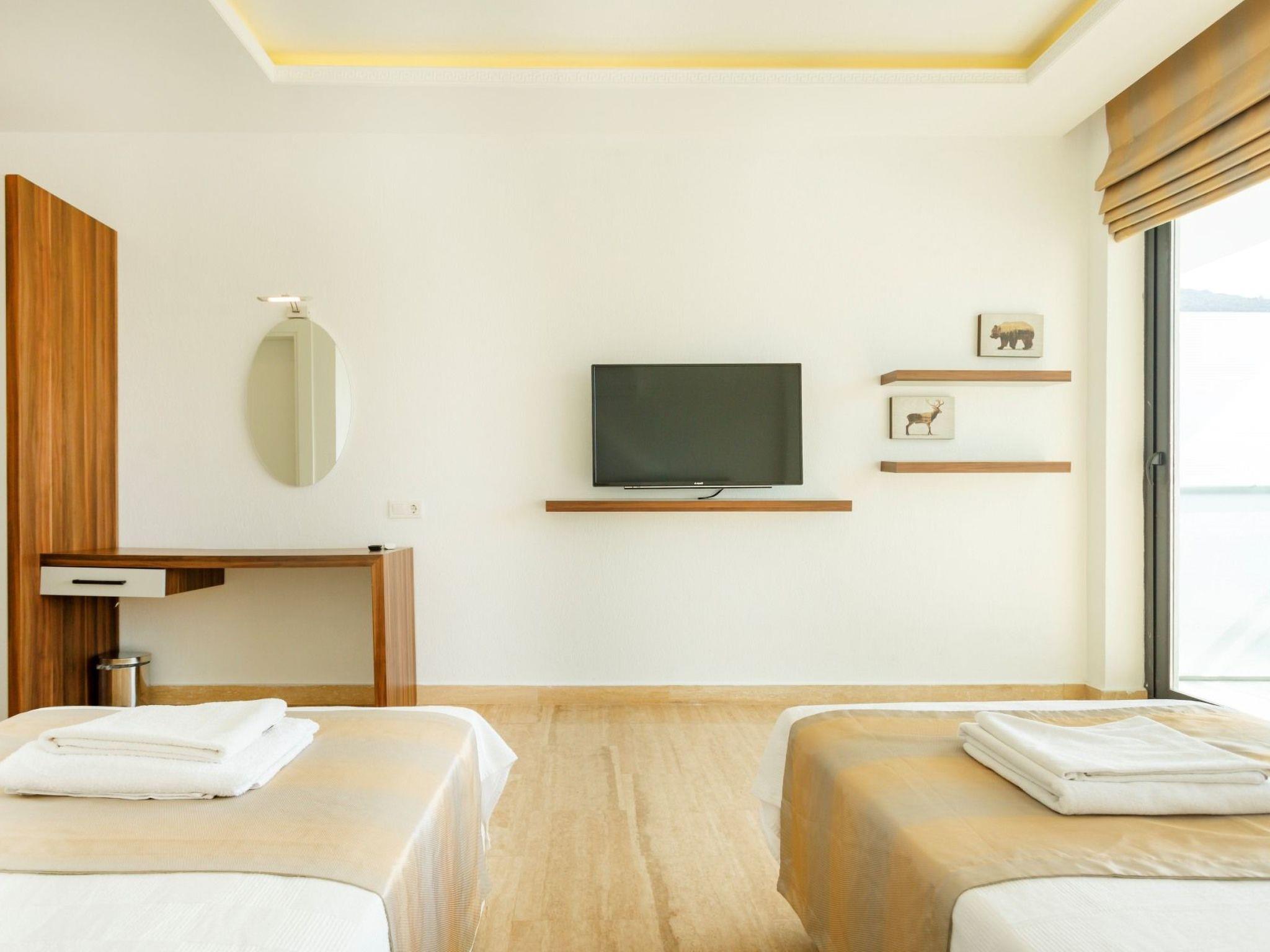 Bath towel, hand towel and beach towel are available in each villa. Towels are prepared in advance and included in the rooms.Iron, ironing board, hair dryer, teapot, barbeque/ charcoal burner are available in each villa.HallHall with sea and nature landscape , sitting group, six-person dinner table , satellite receiver, and tv(led) and air conditioner are available. KitchenAmerican Kitchen designed as large, spacious ,and modern, refrigerator, dish washer, washing machine,stove, quartet oven (embedded) , microwave oven, electric water heater (kettle), pan, saucepan etc. kitchen equipments, and six-person dinnerware are available. Cleaning and Care Villa is delivered to you , and cleaned for two times a week, if you request an extra cleaning ; cleaning (including new bed sheet, pillow case ) are performed by our attendants as chargeable.DepositA deposit in 200 pounds is received in the entrance of the villa. If no problems such as any damage, scrapped and lost stuff is determined in control before guest leaving the villa ,deposite is returned to guest. Entrance time to our villas is 03.00 PM for the first day. The latest leaving time is 12:00 AM.Free Applications *Electricity, water and bottled gas expenses .* Internet and digital platform are free.*Clean bed sheet, and pillow case are kept available as much as person capacity of villa* Daily Pool and garden cares are performed by attendants in early hours
