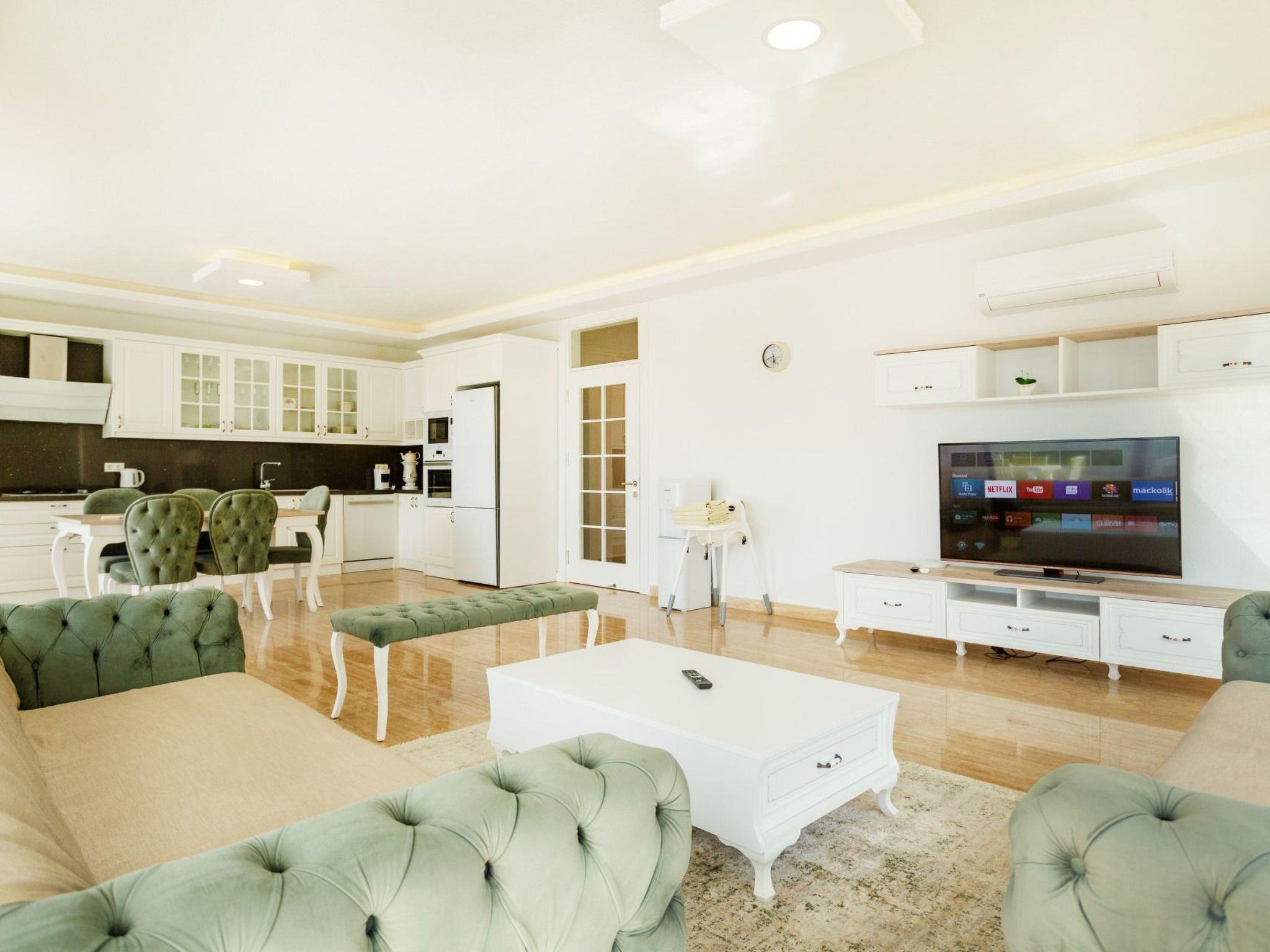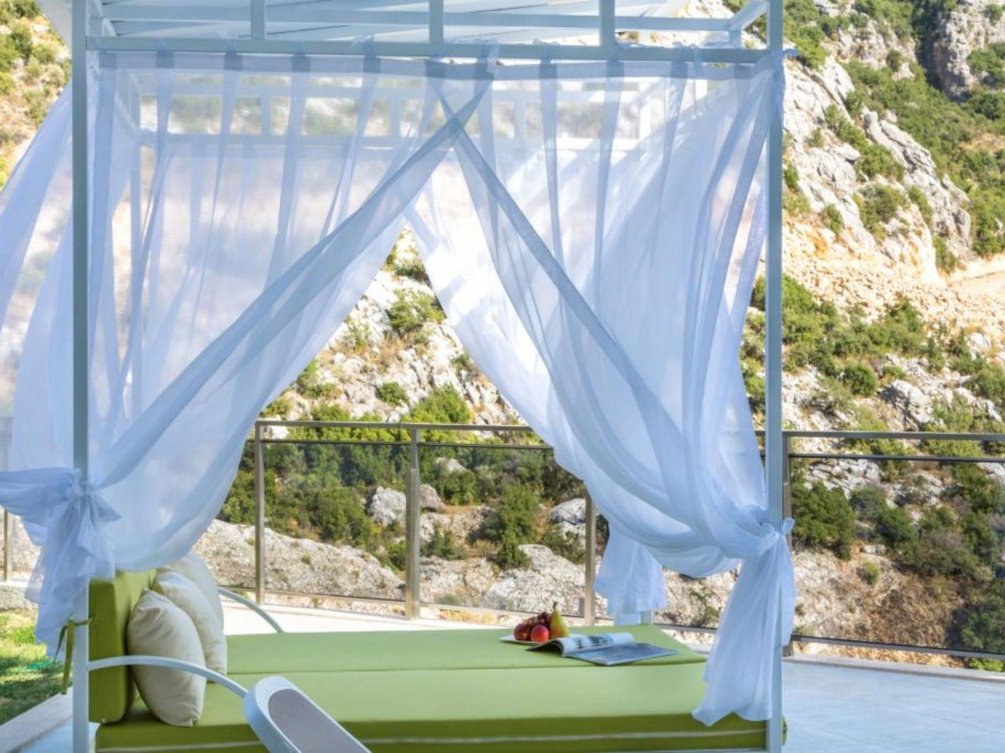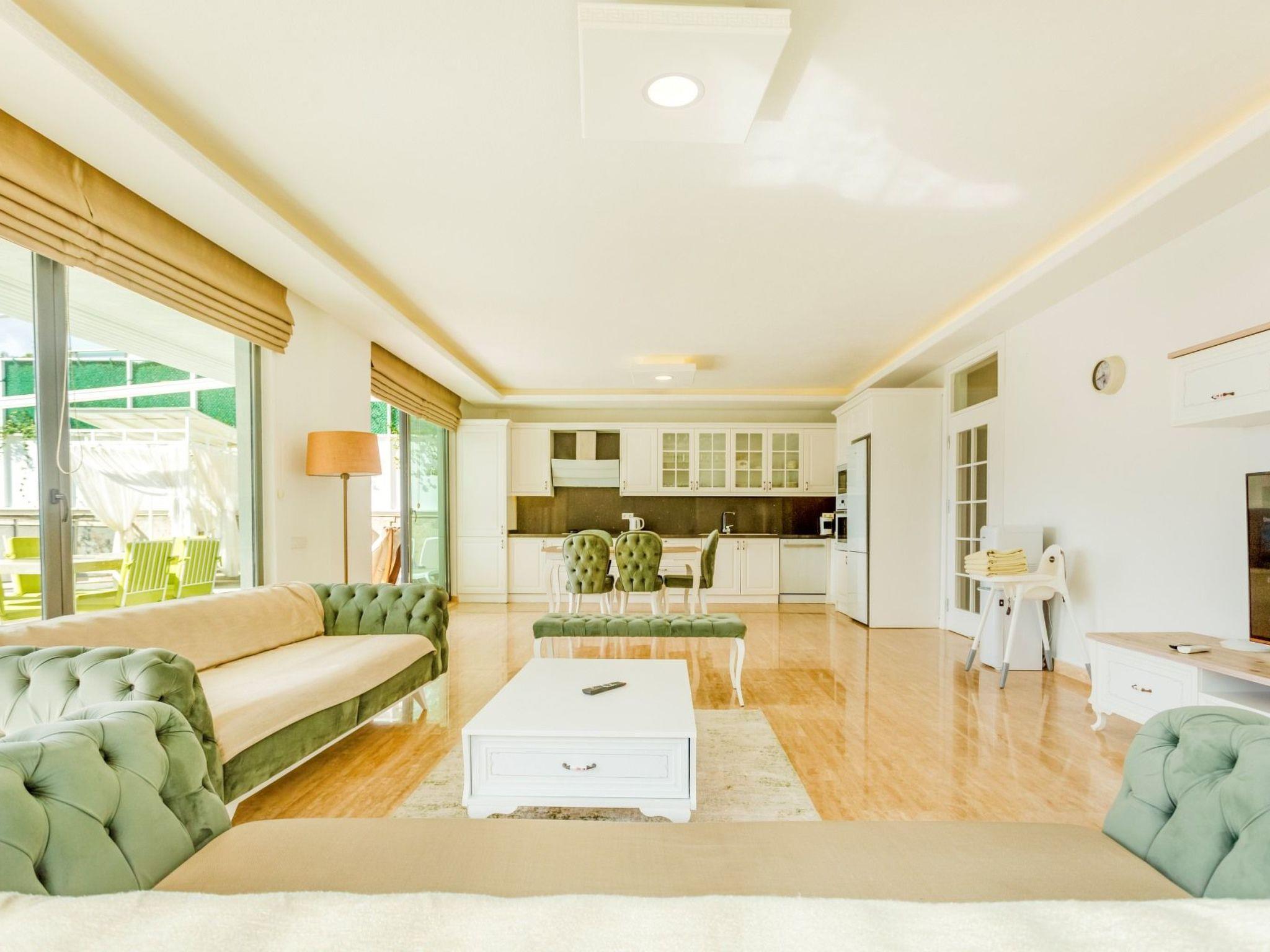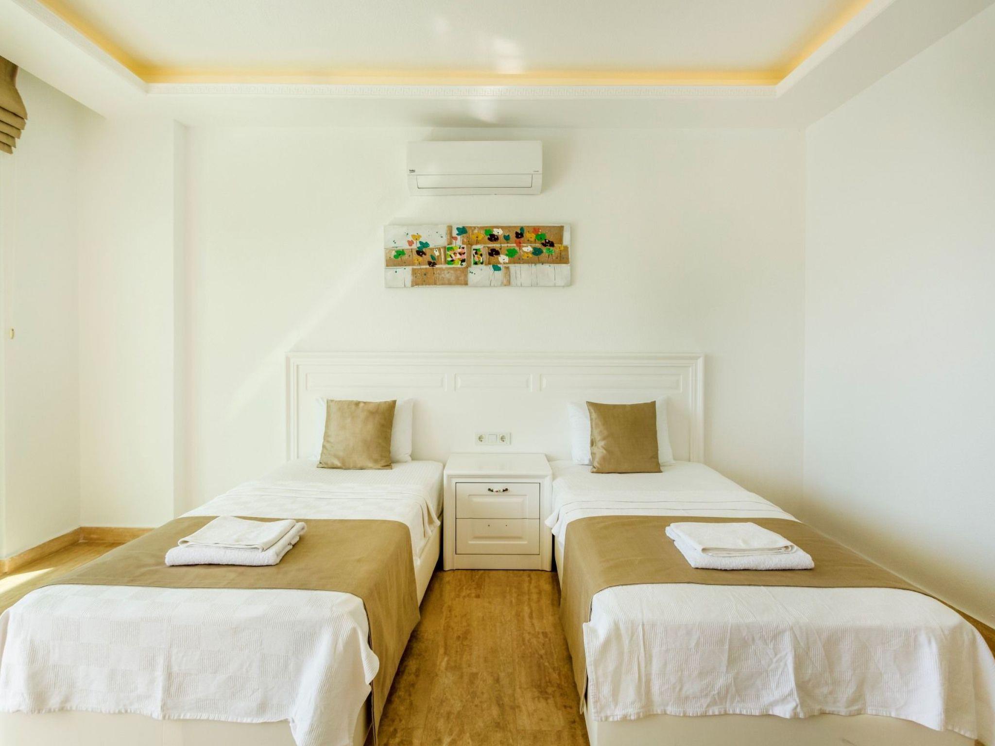 Bed rooms1. Bed room:double bed for suit family, air conditioner, wardrobe , balcony, led tv,jacuzzi2. Bed room: Teen bed room ,two single beds, air conditioner , bath, wardrob, , balcony, ledtv,jacuzzi are availableBath towel, hand towel and beach towel are available in each villa. Towels are prepared in advanceand included in the rooms.Iron, ironing board, hair dryer, teapot, barbeque/ charcoal burner are available in each villa.HallHall with sea and nature landscape , sitting group, six-person dinner table , satellite receiver, andtv(led) and air conditioner are available. KitchenAmerican Kitchen designed as large, spacious ,and modern, refrigerator, dish washer, washingmachine,stove, quartet oven (embedded) , microwave oven, electric water heater (kettle), pan,saucepan etc. kitchen equipments, and six-person dinnerware are available.Pool and Garden Large sunbathing area with private swimming pool and garden are available in each villa. 6 sunbedsand umbrellas, six person dining table,sitting group, barbeque are available. Pools are collapsibleheated.Pool Size Width: 3,5 mt/ Length : 10 mt / Depth: 1,40mtCleaning and Care Villa is delivered to you , and cleaned for two times a week, if you request an extra cleaning ;cleaning (including new bed sheet, pillow case ) are performed by our attendants as chargeable.