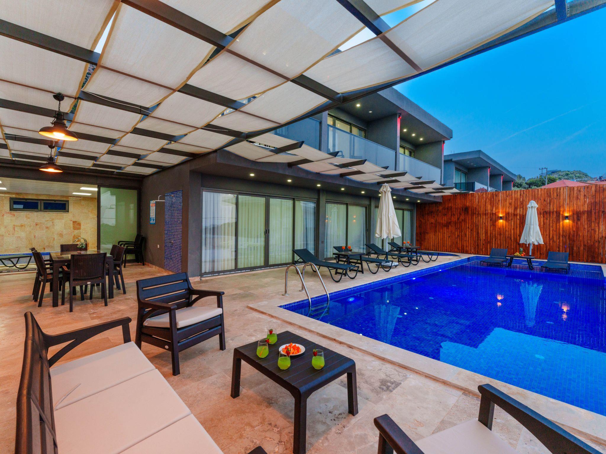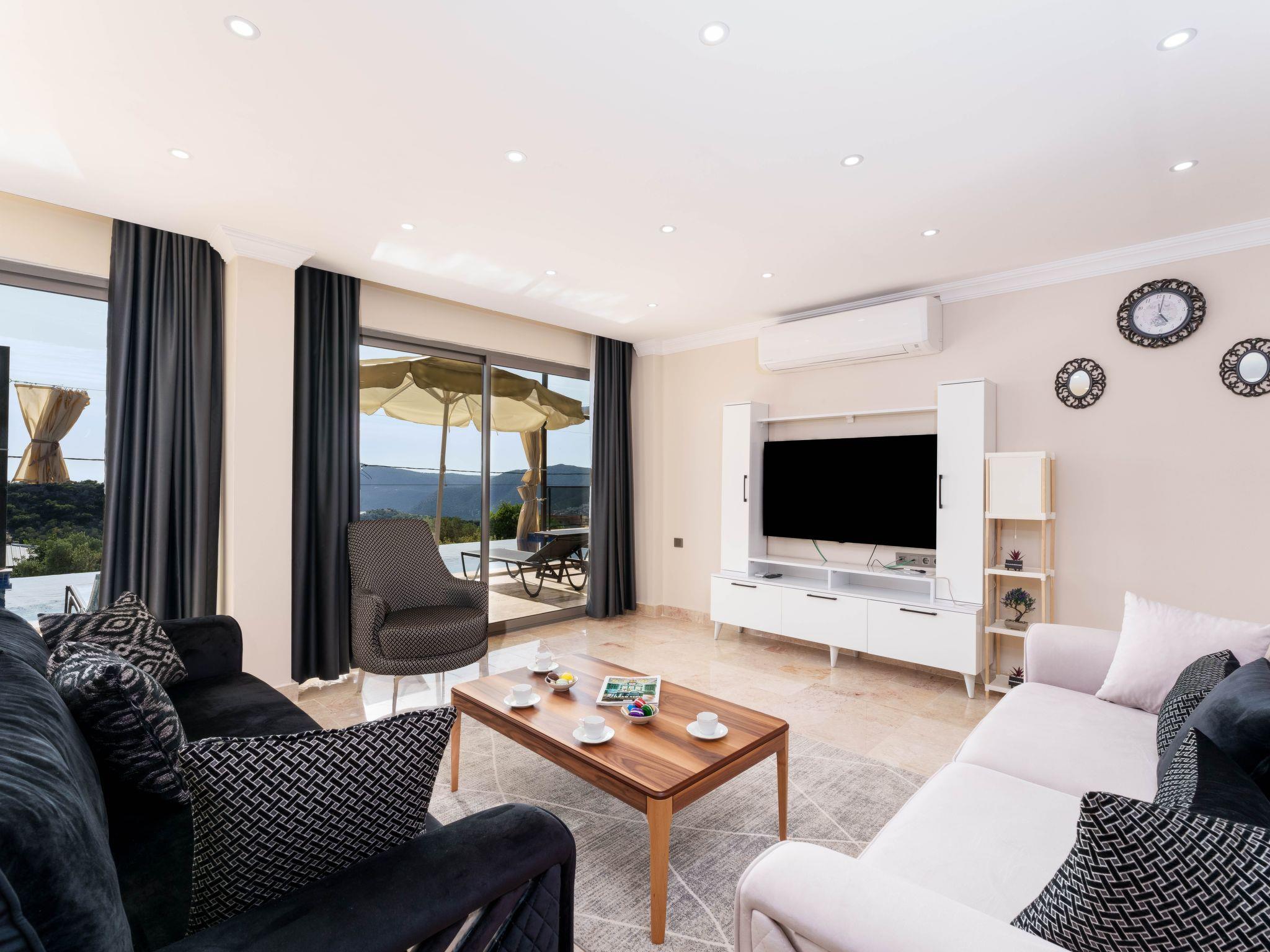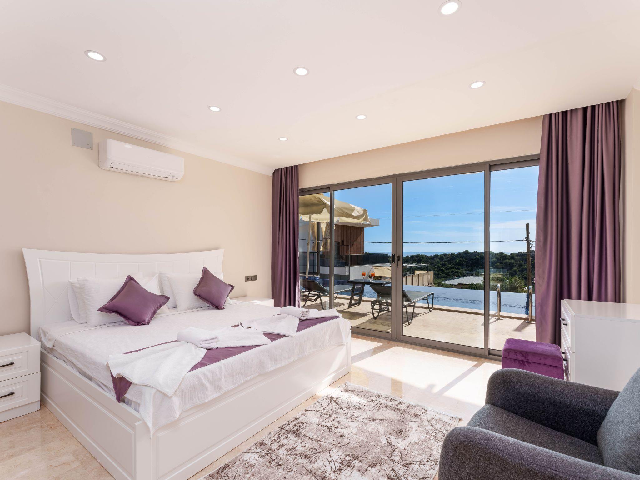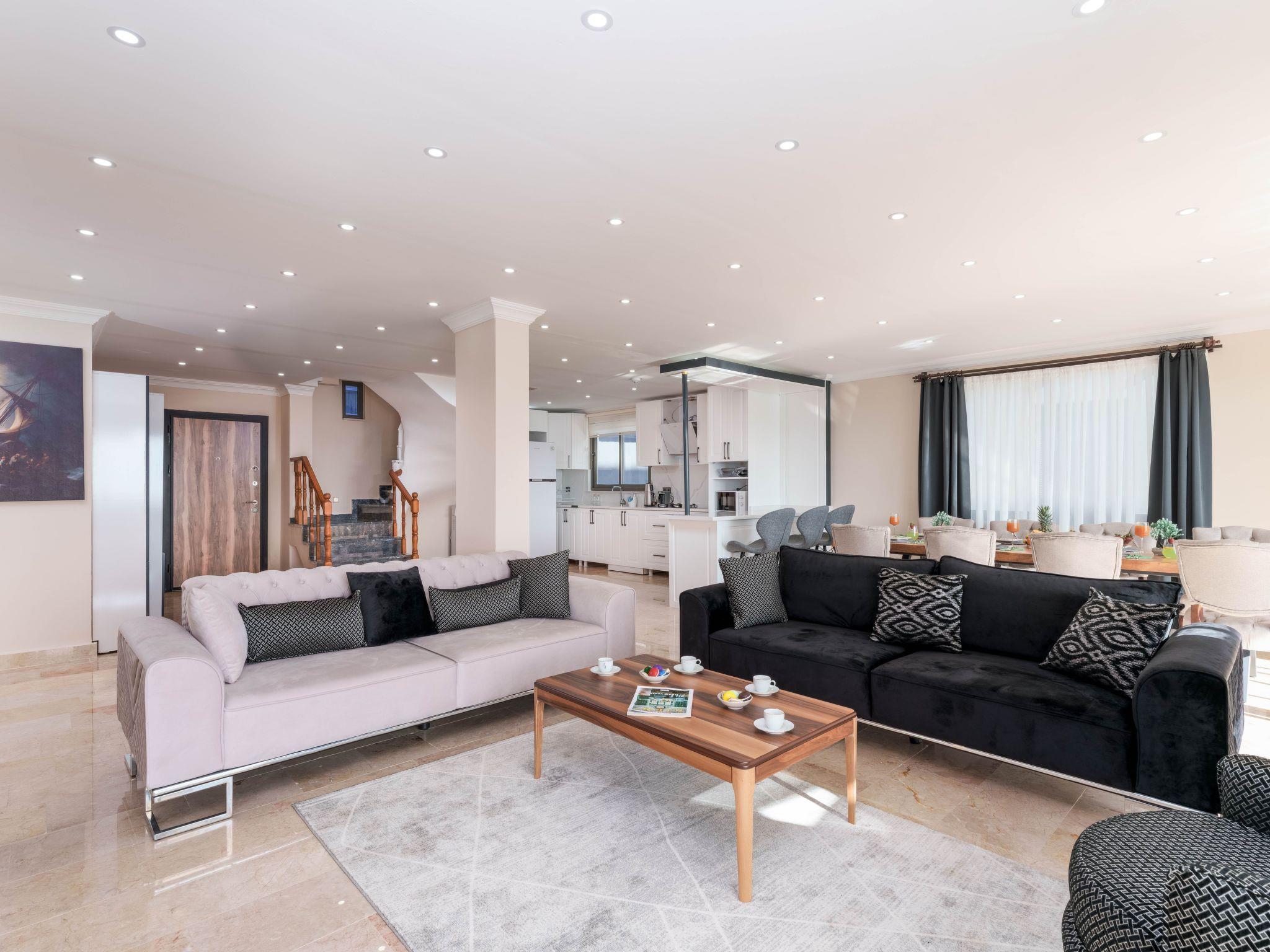 This luxurious villa is located in the Kalkan Kördere area and has 4 bedrooms and can accommodate up to 8 guests. With its mesmerising blue tones, luxurious design and modern architecture, it offers you a dream holiday experience. It is the ideal sea view rental villa for large families or groups of friends.