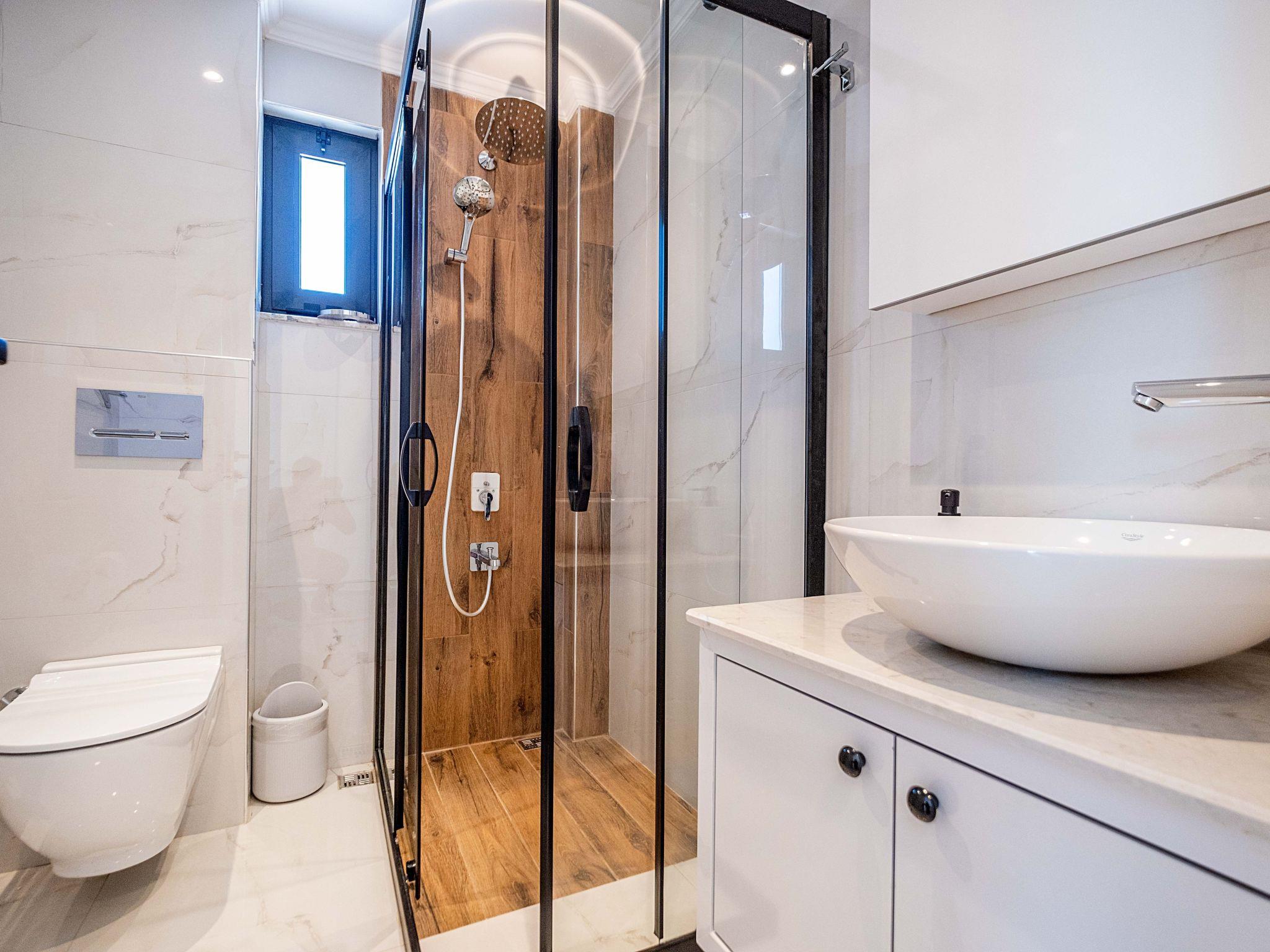 Inside the house, a fully equipped environment awaits you, designed with your needs and comfort in mind. Each of the three inviting bedrooms offers comfortable beds for an optimal night's sleep as well as blackout curtains so that you are not disturbed during your sleep phases. The availability of a private bathroom with shower and WC in each room ensures maximum privacy and comfort. The interior is complemented by air conditioning in all rooms, a washing machine and dishwasher for your sole use and practical household aids such as a kettle to make your stay smooth and pleasant.