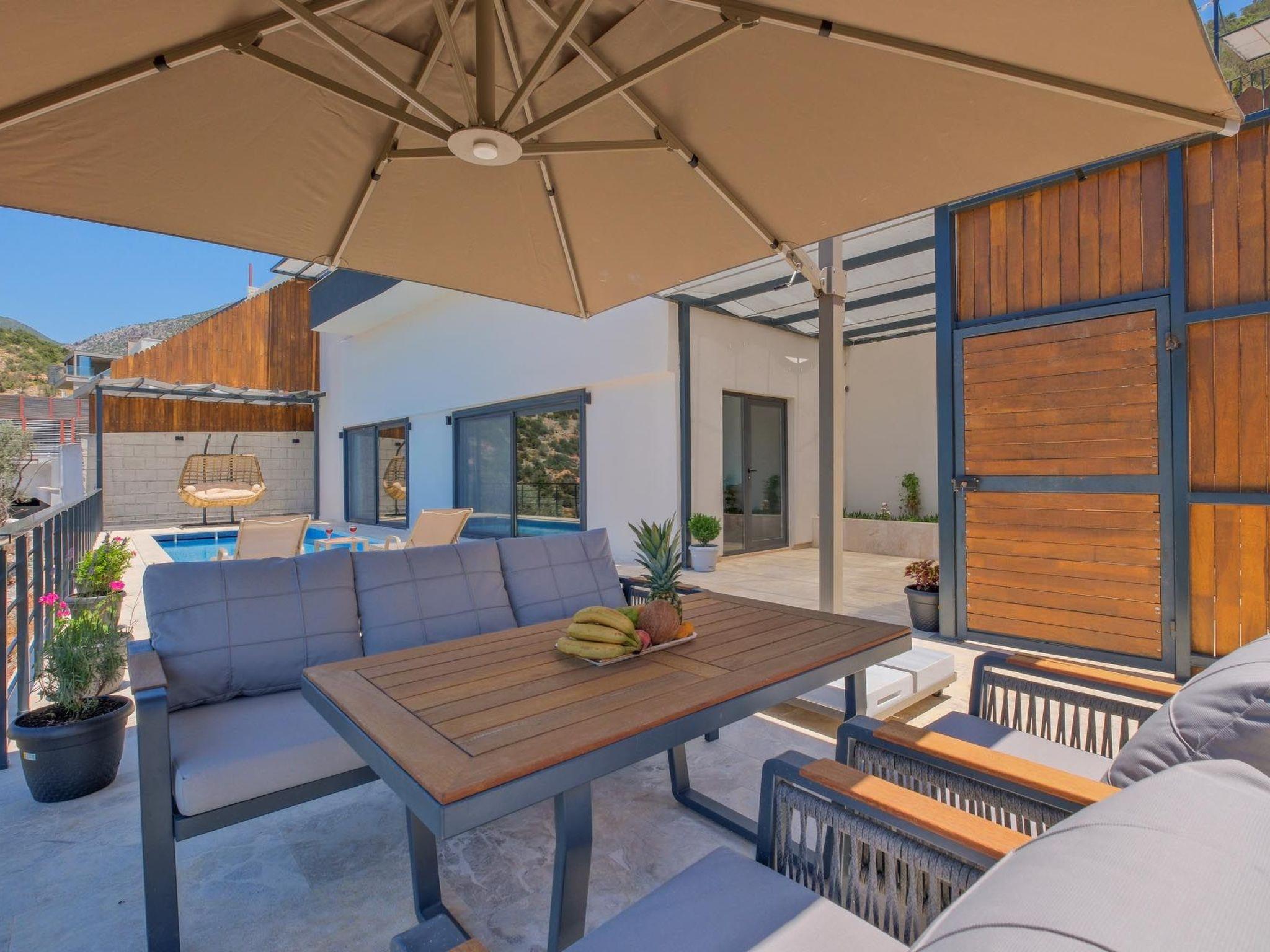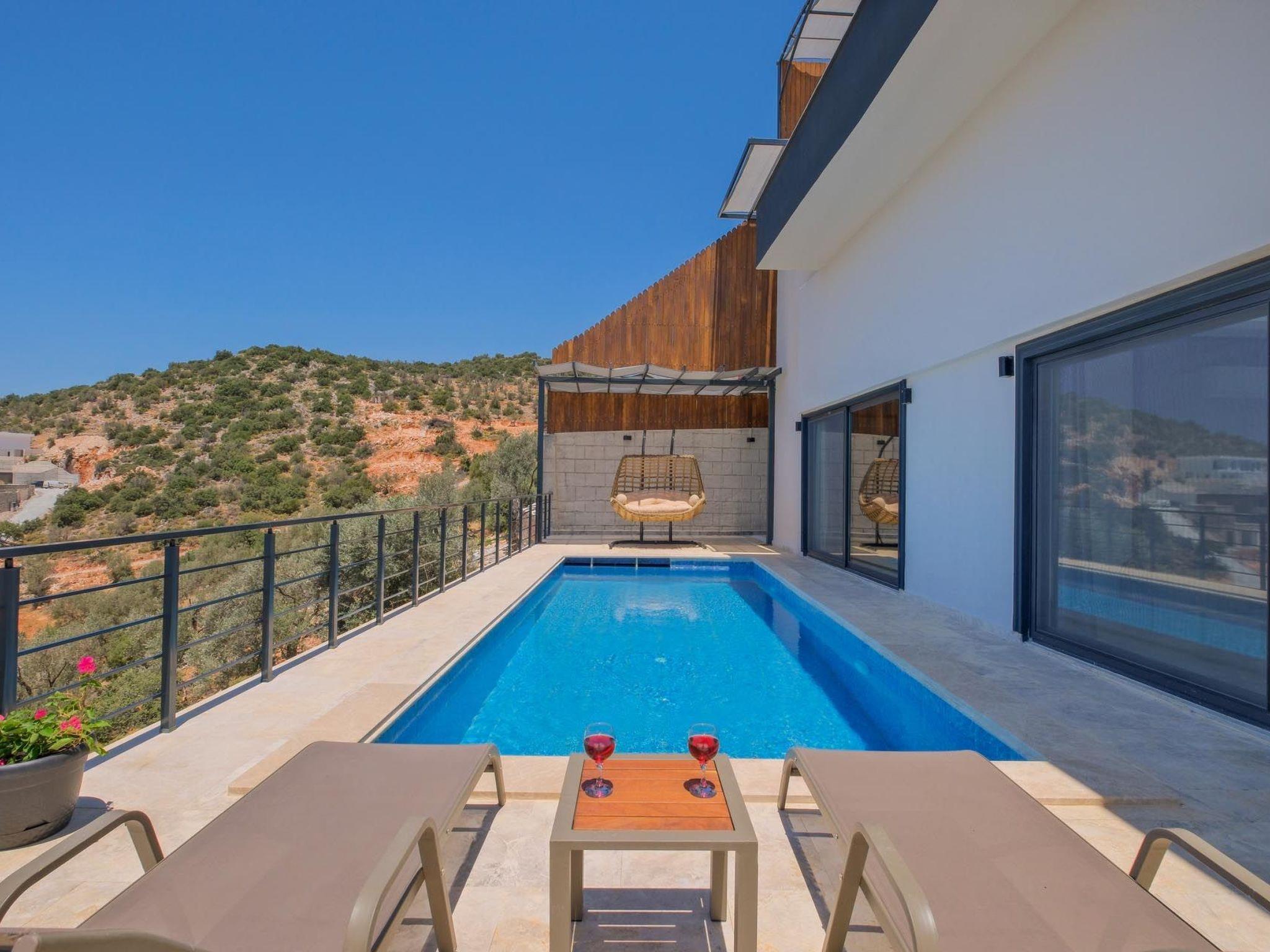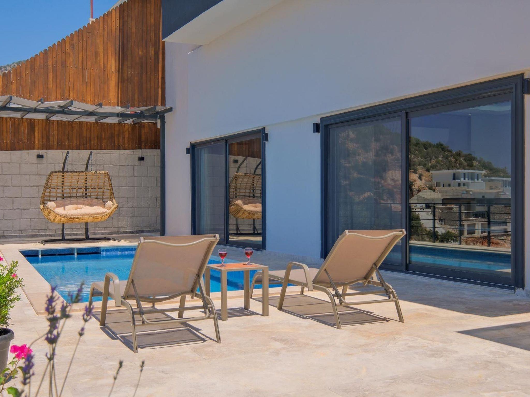 The romantic ambience of the villa is perfectly tailored to the needs of newly married couples. Elegant furnishings, cosy retreats and romantic lighting create an inviting and intimate atmosphere. A special highlight is the private hot tub, where you can relax and enjoy the impressive view. The luxurious bedroom has a king-size bed with high-quality bed linen, while the spacious bathroom is equipped with a free-standing bathtub and rain shower. The fully equipped kitchen invites you to embark on culinary adventures and the open-plan living area with panoramic windows offers magnificent views. The private terrace with comfortable sun loungers, free WiFi and air conditioning round off the luxurious offer.