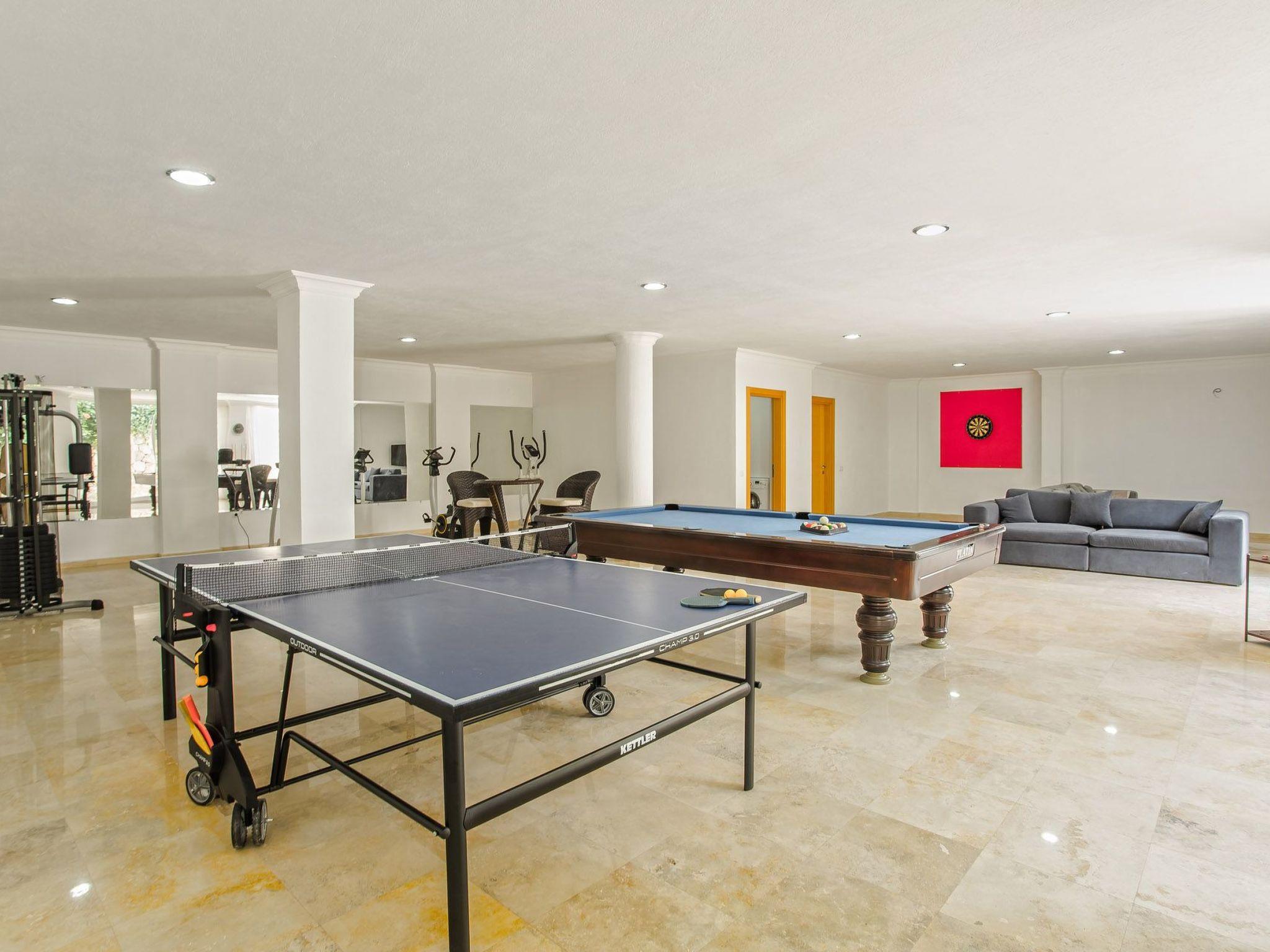 Inside, guests will find fully equipped accommodation that leaves nothing to be desired. The five cosy bedrooms, each with an en-suite bathroom, ensure private comfort. A washing machine is available for shared use and the kitchen is well equipped with a gas hob, dishwasher, kettle and coffee machine. A pool table provides entertainment, while the continuous air conditioning ensures a pleasant coolness even on hot days.