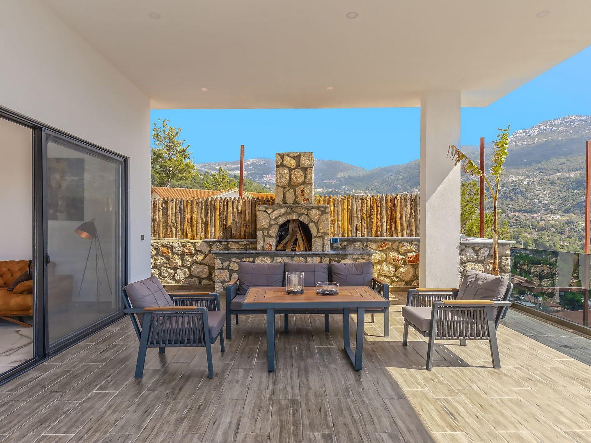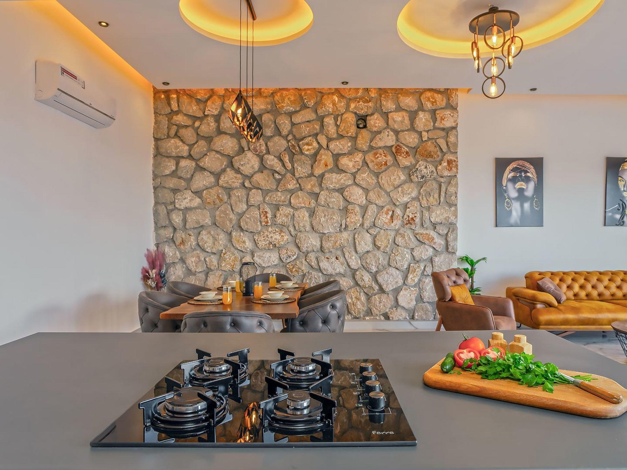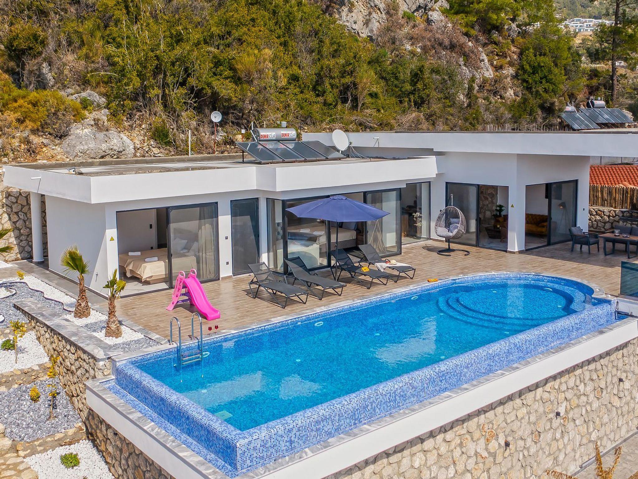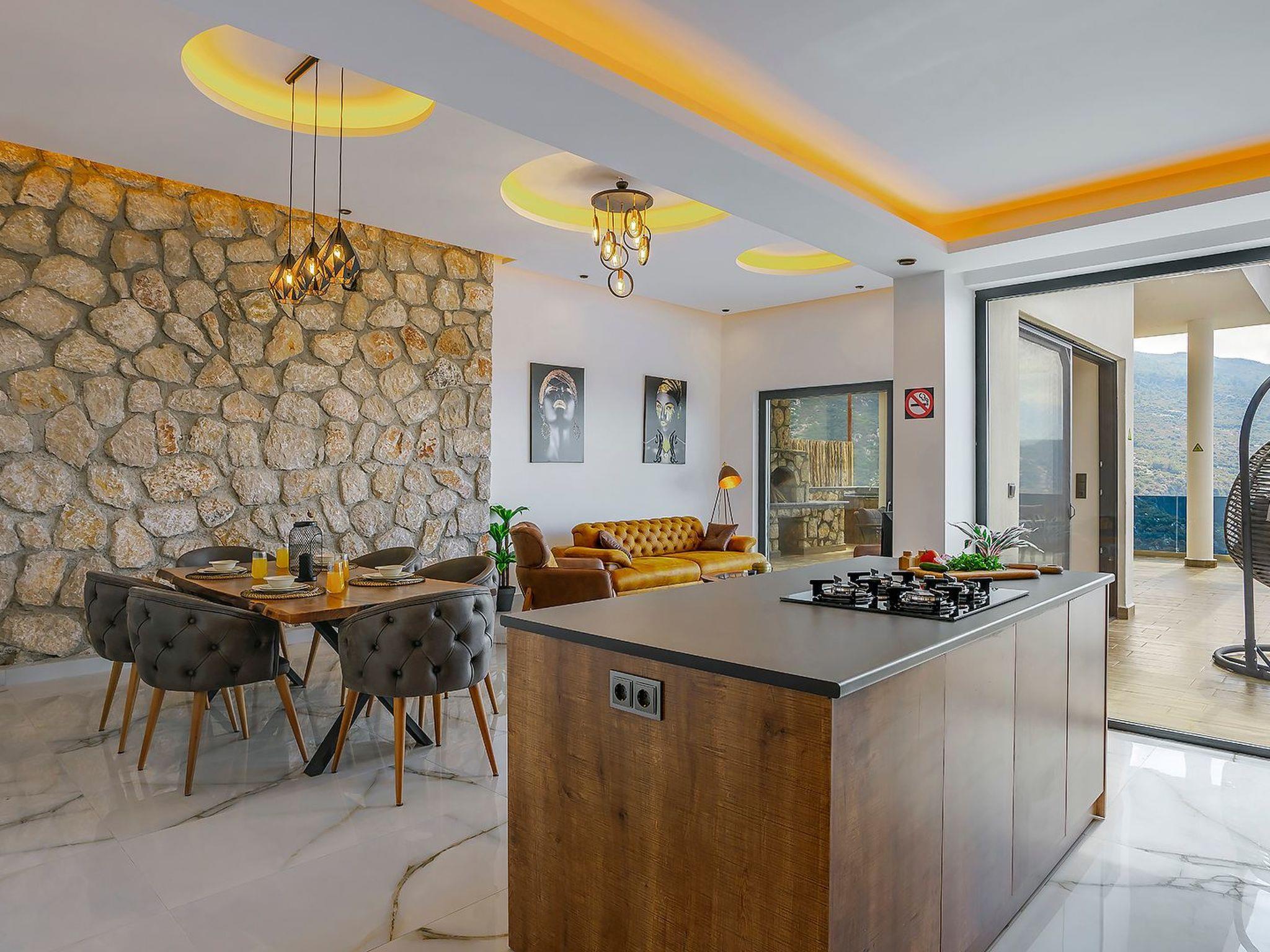 With 2 bedrooms and 2 bathrooms, this villa can accommodate up to 4 people who want to enjoy a relaxing and luxurious holiday amidst the breathtaking scenery of Kalkan.the villa is equipped with modern amenities and offers beautiful views of the sea, nature and the valley. From the terrace you can enjoy the view of the island while relaxing in the jacuzzi and enjoying the tranquillity of the surroundings.