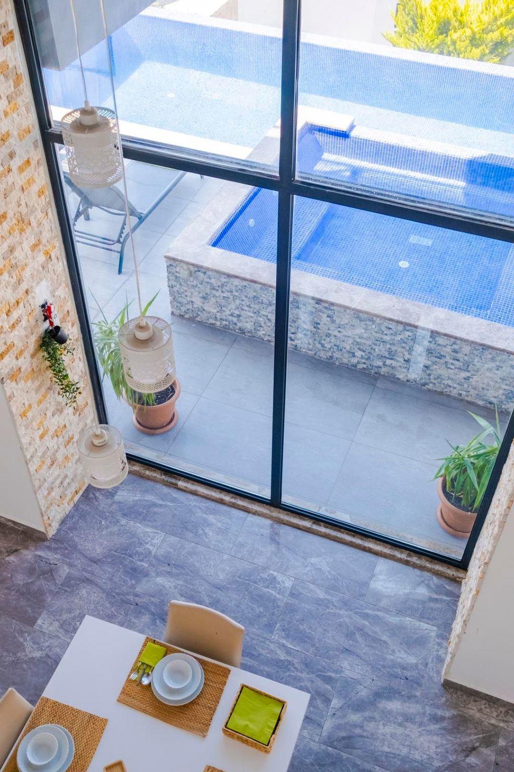 The spacious outdoor Jacuzzi offers an ideal place to enjoy the panoramic view of the deep blue sea and the surrounding landscape in relaxed company. The villa offers spectacular views that blend in perfectly with the surroundings and provide unforgettable moments at any time of day.