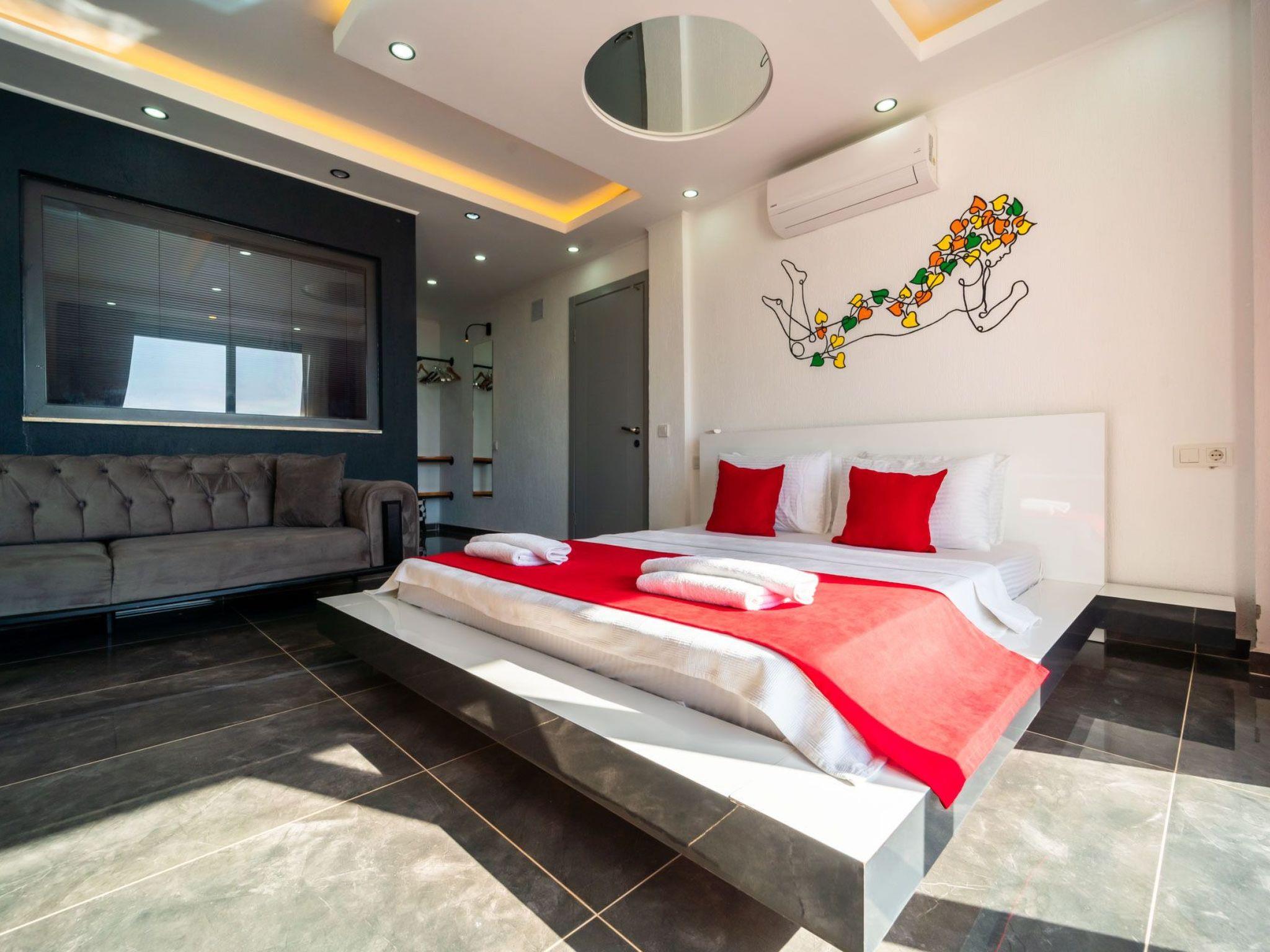 The outdoor area of the holiday home is an oasis of relaxation. A terrace and a balcony invite you to spend cosy hours outdoors, while the spacious garden for exclusive use offers plenty of opportunities for fun and games. The pool, surrounded by the lush nature of Anatolia, promises refreshing moments on warm days.