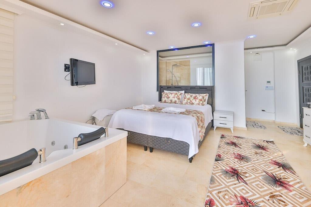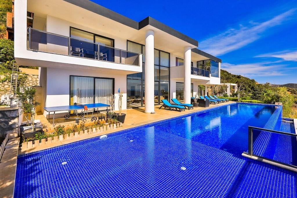 Villa Jessica is a luxury holiday villa in Kalkan, Kördere, that can accommodate up to 6 people. The villa offers stunning sea views and features an infinity pool for relaxing bathing. The villa's garden also offers plenty of space to relax and enjoy the view. Inside, Villa Jessica offers modern and comfortable accommodations with spacious living areas and bedrooms. The kitchen is well-equipped, and there is ample seating in the dining area and living room. From the terraces and pool area, you have access to breathtaking views of the sea and the surrounding countryside. The villa also features a range of amenities, including Wi-Fi, air conditioning, and a barbecue, to make your stay even more enjoyable. It is the perfect place for a relaxing holiday with family or friends. The garden also features sun loungers and parasols for outdoor relaxation. NOTE: The last 700–800 meters of the road to the villa have a steep incline.