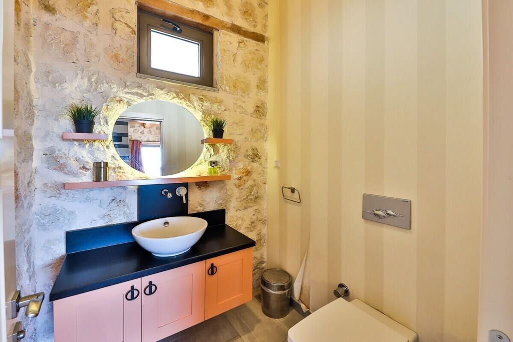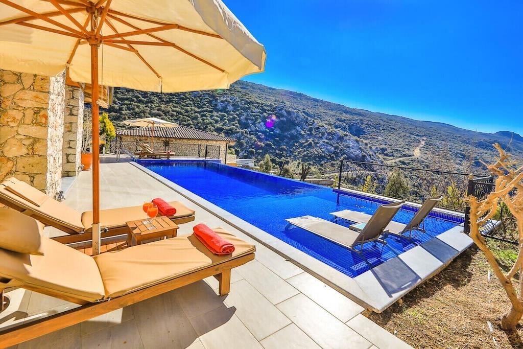 The Ime rental villa is located in the Islamlar district of Kalkan and offers unique views of nature. Built from natural stone, Villa Horizont offers a pleasant vacation with its impressive interior design and comfortable layout. It has 3 bedrooms and can accommodate up to 6 people. Surrounded by natural trees, it is secluded and offers privacy, making it ideal for conservative families and groups of friends. Villa Ime awaits its guests amidst lush greenery with breathtaking views of the islands – perfect for enjoying the sunrise. IMPORTANT INFORMATION: A rental car is highly recommended. The roads in Kalkan are partly hilly and uneven. In addition, power outages may occasionally occur during the summer months due to high temperatures.