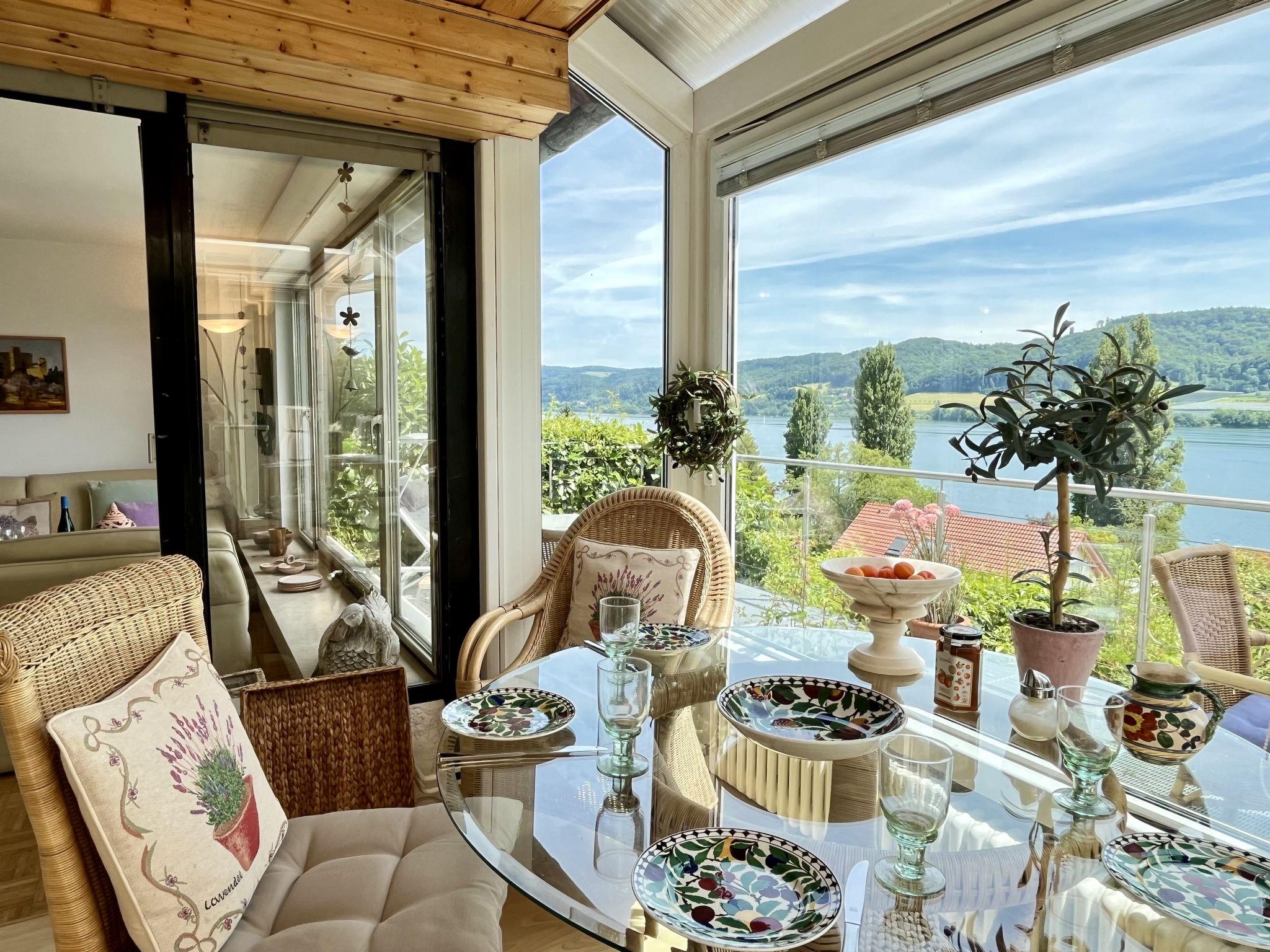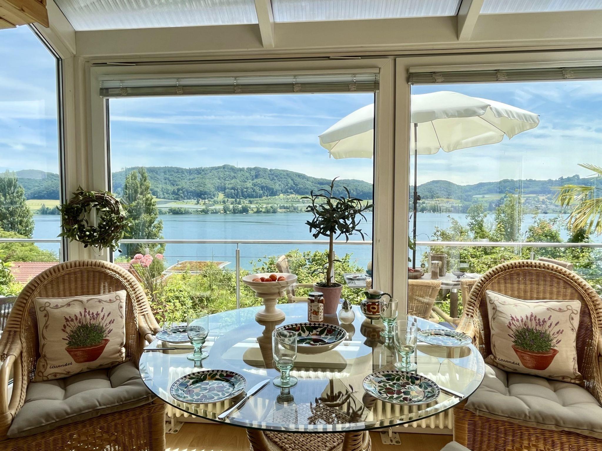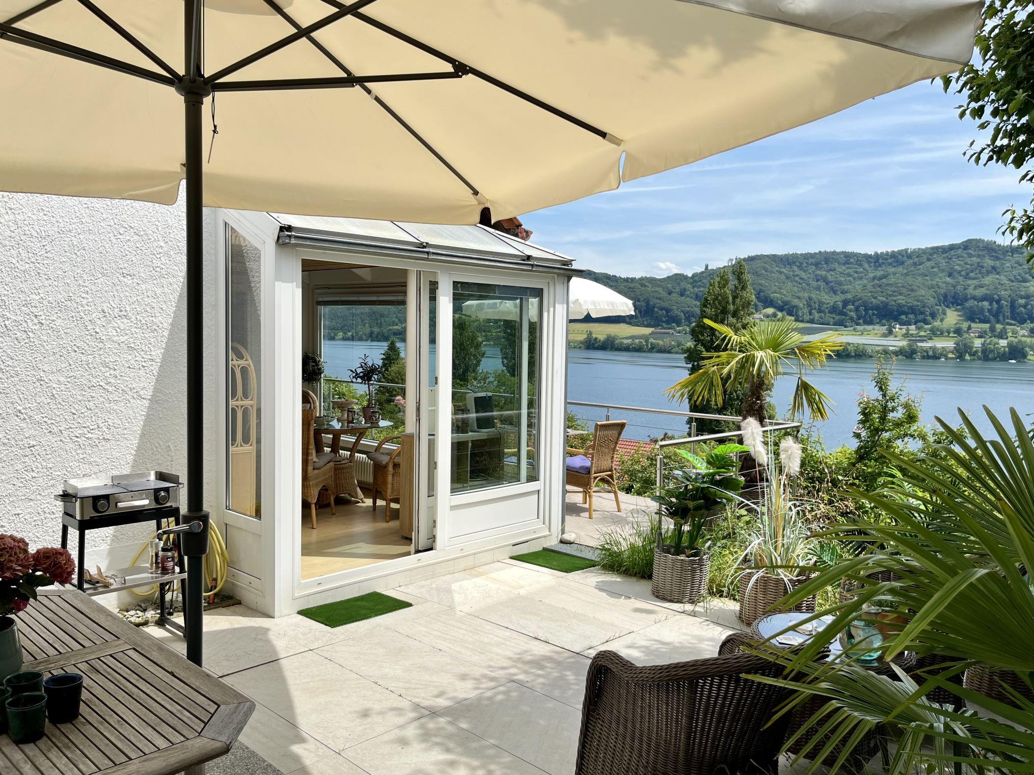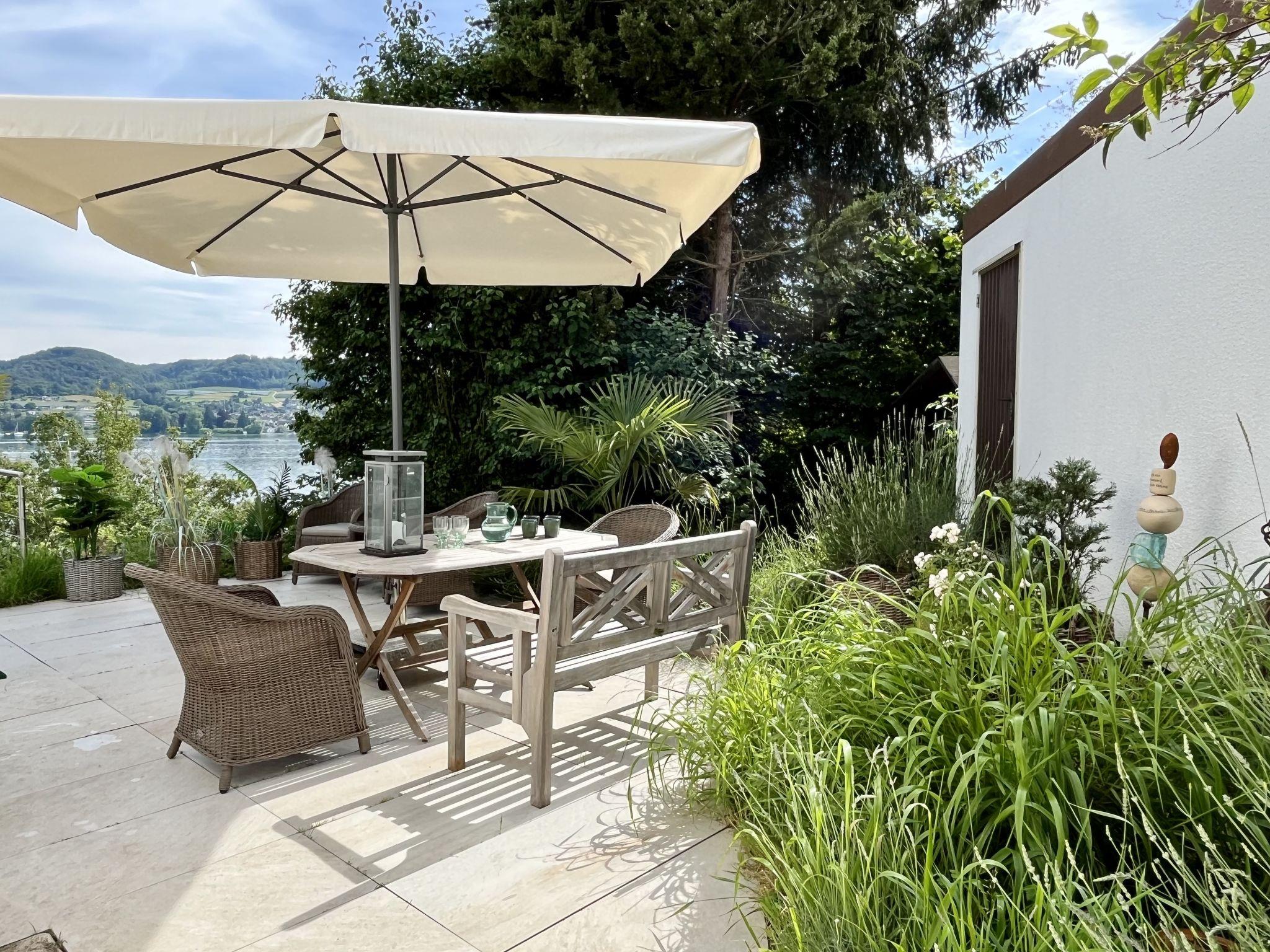 Öhningen 4 km from Stein am Rhein: Beautiful single-family house "Seepanorama", 3 storeys. In the district of Wangen, in the district Höri / westlicher Bodensee, in a sunny position on a slope, in the residential district, 300 m from the lake, 500 m from the beach, in a cul-de-sac. Private: natural state property, parking at the house. Grocery 4 km, supermarket 4 km, restaurant 900 m, bakery 4 km, pub garden 900 m, bus stop "Wangen,Pension Auer Linie 200" 100 m, railway station "Radolfzell" 16 km, grass beach "Wangen", swimming bay 500 m, public bathing area 4 km, lake Bodensee 300 m. Sports harbour 500 m, cycle lane 250 m. Nearby attractions: Museum Haus Dix 4 km, Museum Hesse 6 km, Rheinfall Schaffhausen 28 km, Insel Reichenau 50 km, Sealife Konstanz 36 km. Hiking paths: Schiener Berg, Hohentwiel, Hinterland Bodensee. For your information: The riverside road runs about 70 m below the house. In the summer months, this can be very busy at certain times of the day. However, it cannot be seen from the house (trees/bushes).