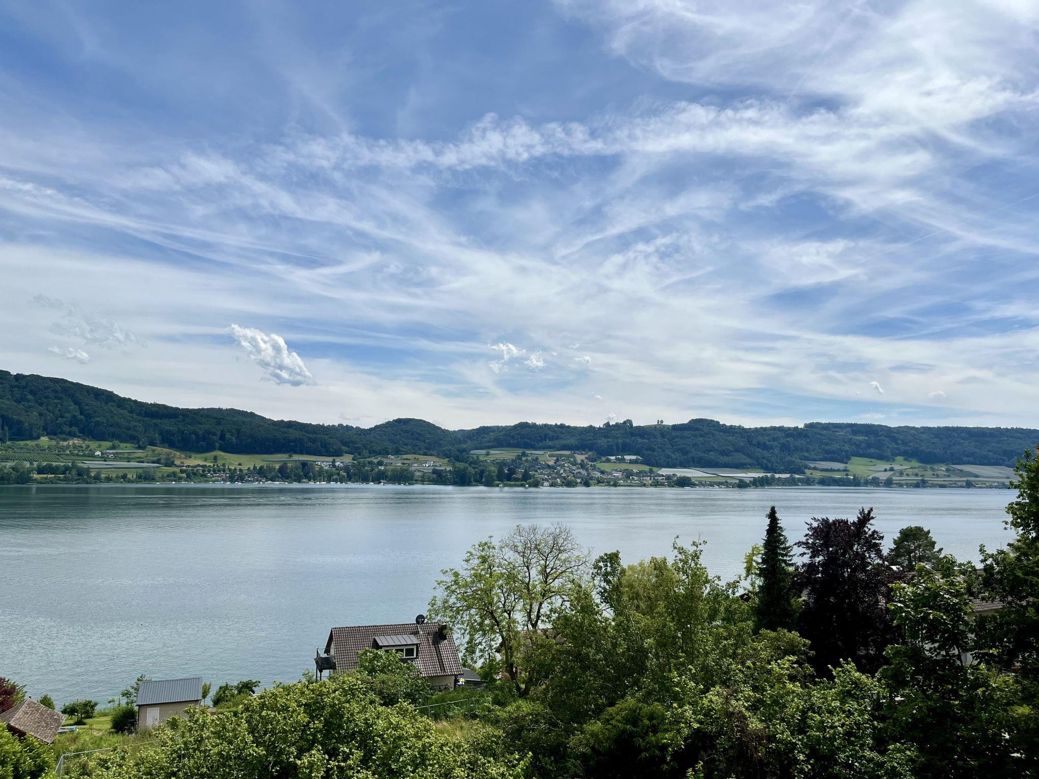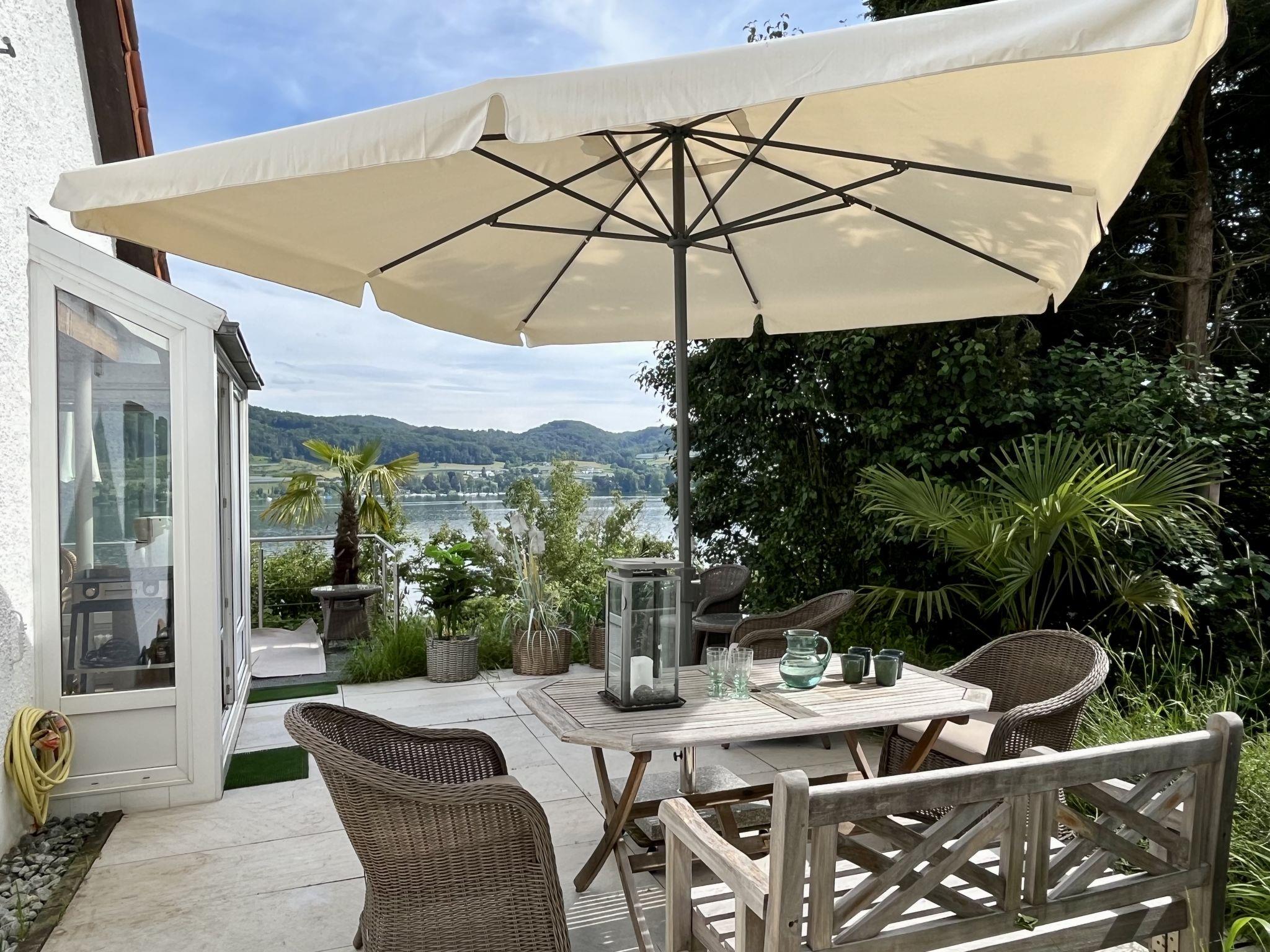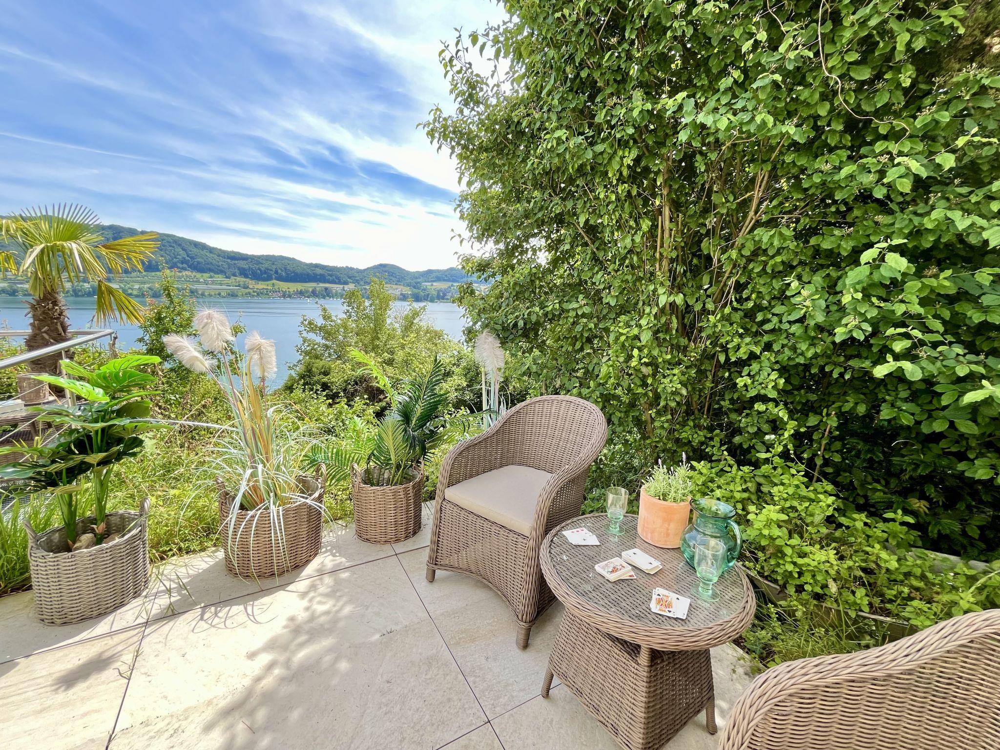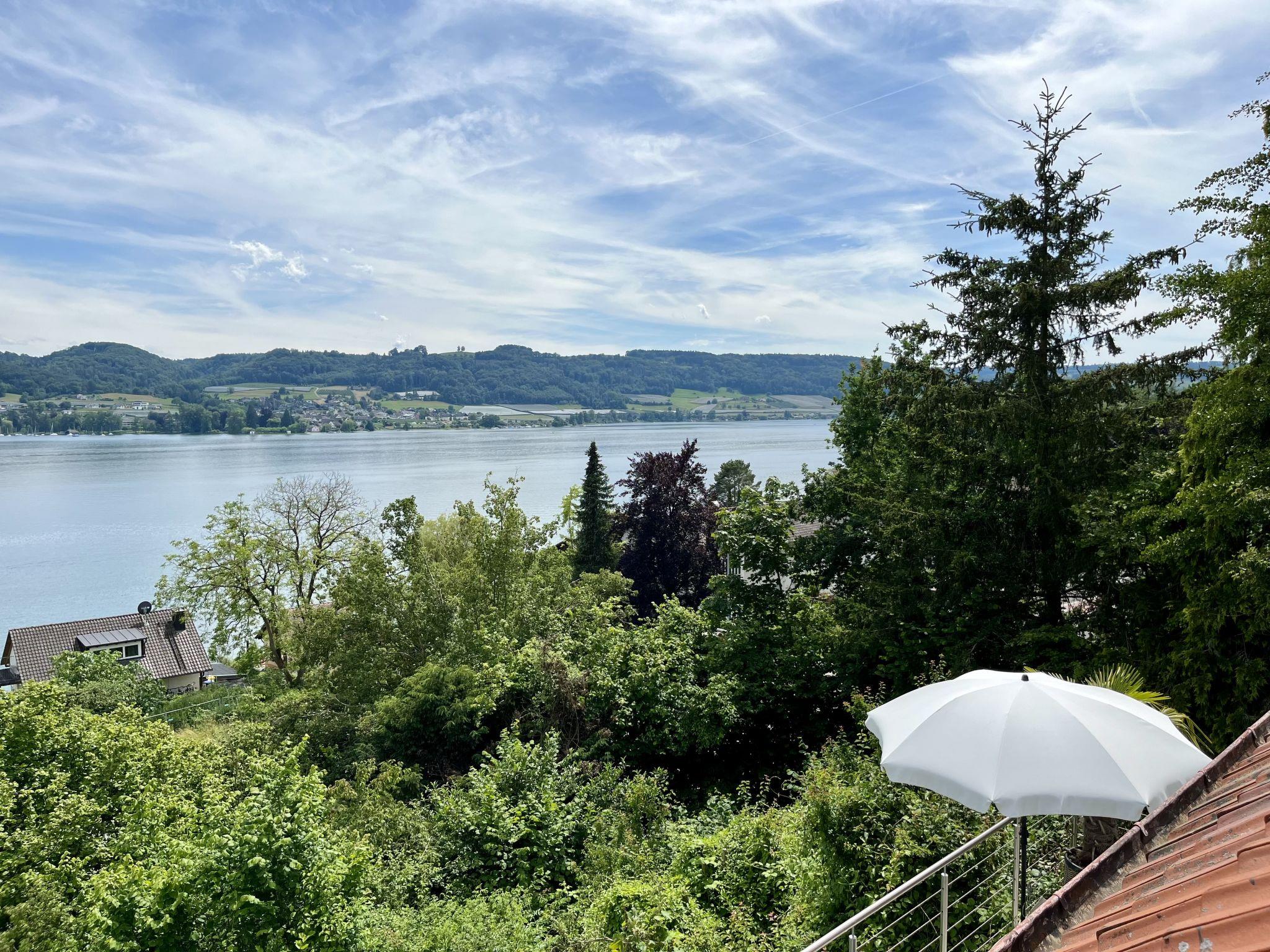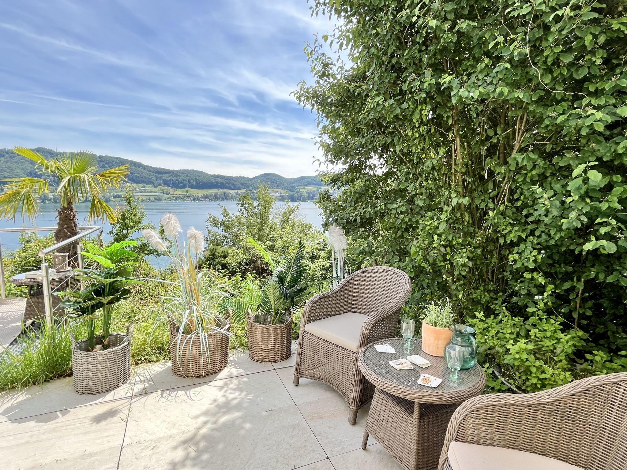 Öhningen 4 km from Stein am Rhein: Beautiful single-family house "Seepanorama", 3 storeys. In the district of Wangen, in the district Höri / westlicher Bodensee, in a sunny position on a slope, in the residential district, 300 m from the lake, 500 m from the beach, in a cul-de-sac. Private: natural state property, parking at the house. Grocery 4 km, supermarket 4 km, restaurant 900 m, bakery 4 km, pub garden 900 m, bus stop "Wangen,Pension Auer Linie 200" 100 m, railway station "Radolfzell" 16 km, grass beach "Wangen", swimming bay 500 m, public bathing area 4 km, lake Bodensee 300 m. Sports harbour 500 m, cycle lane 250 m. Nearby attractions: Museum Haus Dix 4 km, Museum Hesse 6 km, Rheinfall Schaffhausen 28 km, Insel Reichenau 50 km, Sealife Konstanz 36 km. Hiking paths: Schiener Berg, Hohentwiel, Hinterland Bodensee. For your information: The riverside road runs about 70 m below the house. In the summer months, this can be very busy at certain times of the day. However, it cannot be seen from the house (trees/bushes).