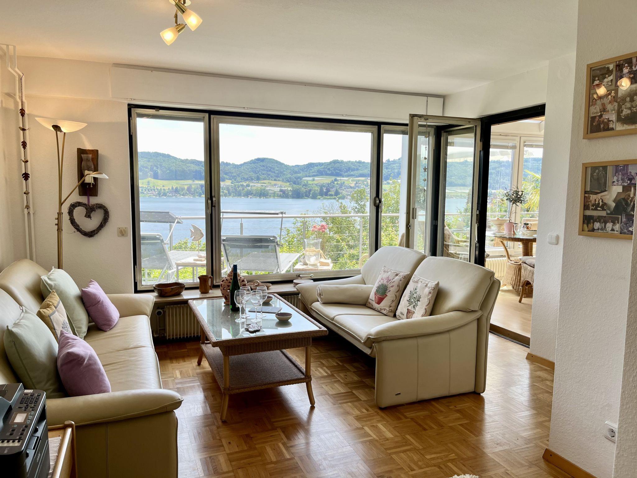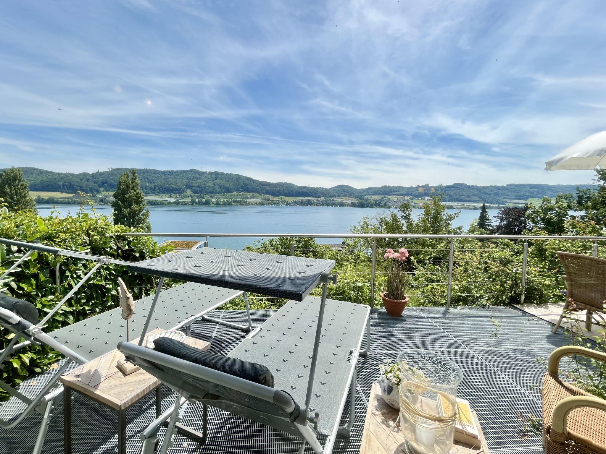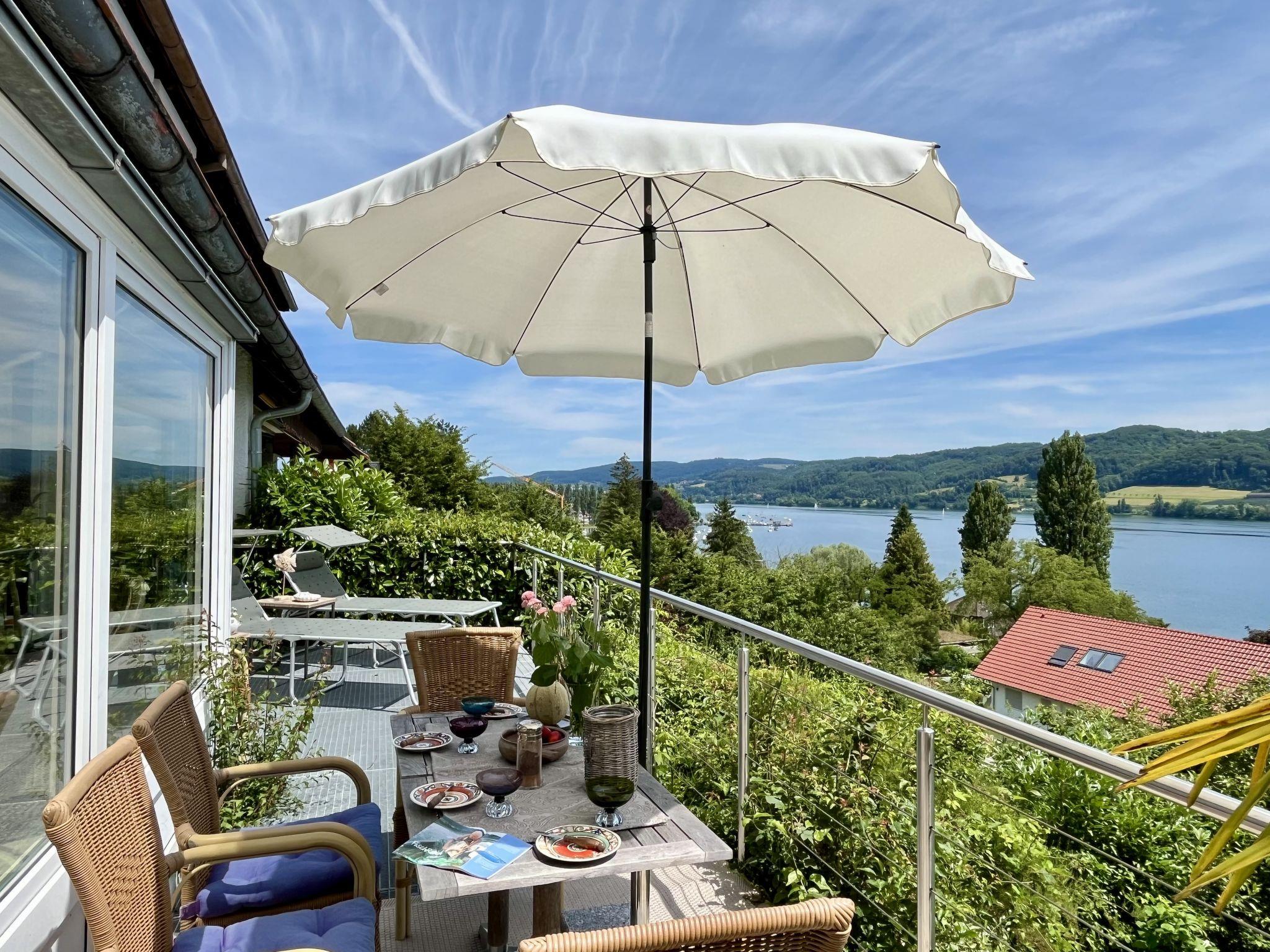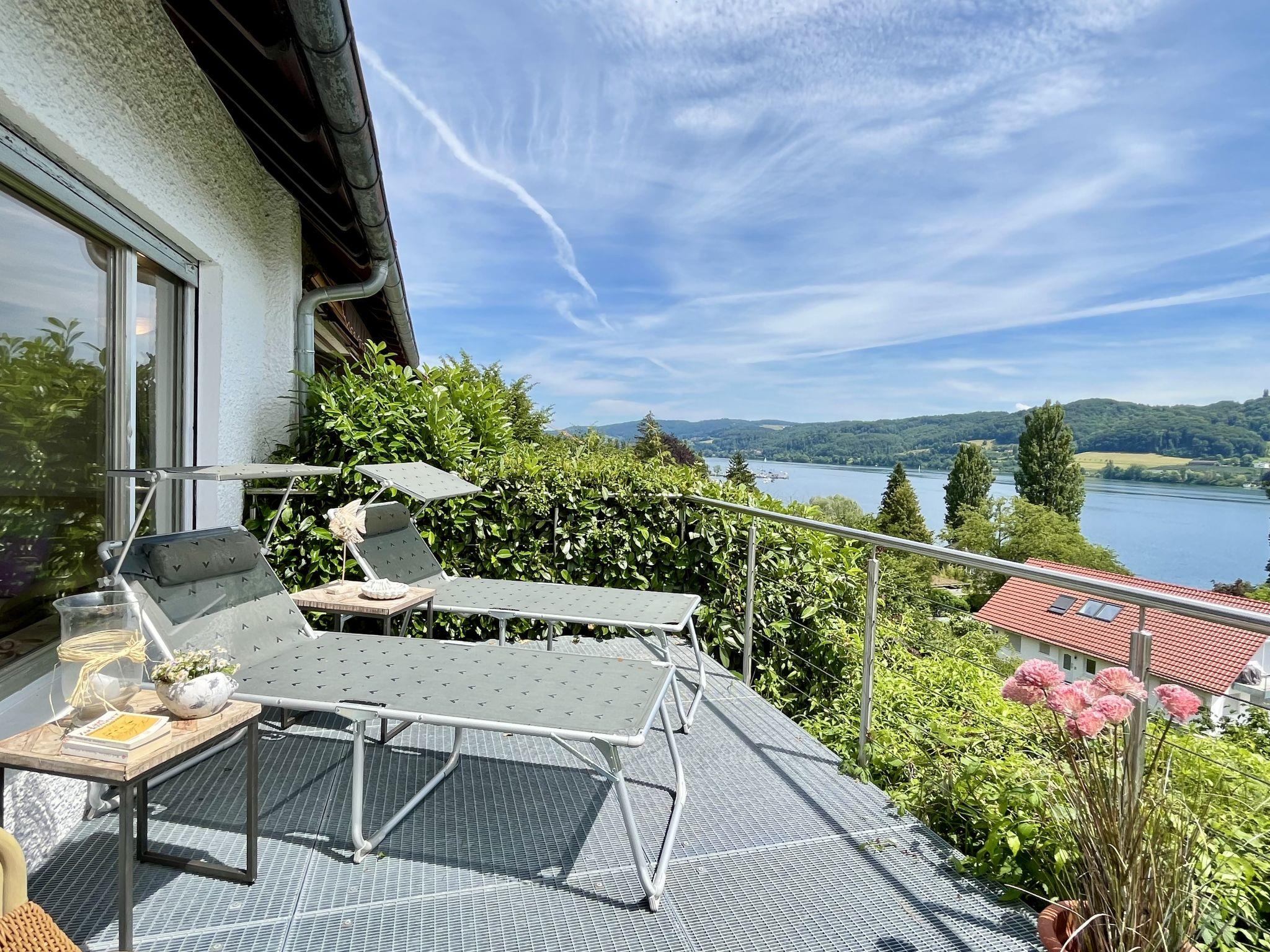 "Seepanorama", 4-room semi-detached house 90 m2 on 3 levels. Bright, partly renovated in 2022, beautiful and cosy furnishings: living room with satellite TV (flat screen), hi-fi system. Walk-through room with dining table. Exit to the balcony, to the terrace. Open kitchen (oven, dishwasher, 4 ceramic glass hob hotplates, kettle, electric coffee machine). Bath/WC. Heating. On the lower ground floor: 1 double bedroom with 1 double bed (2 x 90 cm, length 200 cm). Walk-through room with 2 x 1 bunk beds (90 cm, length 200 cm), hand-basin. Upper floor: 1 double bedroom with 1 double bed (180 cm, length 200 cm). Large balcony, south facing position, large terrace, south facing position and west facing position. Terrace furniture, balcony furniture, electric barbecue (portable), deck chairs (2). Marvellous view of the lake. Facilities: washing machine, dryer, hair dryer. Internet (WiFi, free). Parking at the house. Please note: not suitable for small children. Non-smoking house. Smoke alarm, fire extinguisher. For reasons of space, the oven, washing machine and tumble dryer are located in the basement of the house. Bed layout is flexible. There are more sleeping options available than the maximum number of people allowed which may, however, not be exceeded.