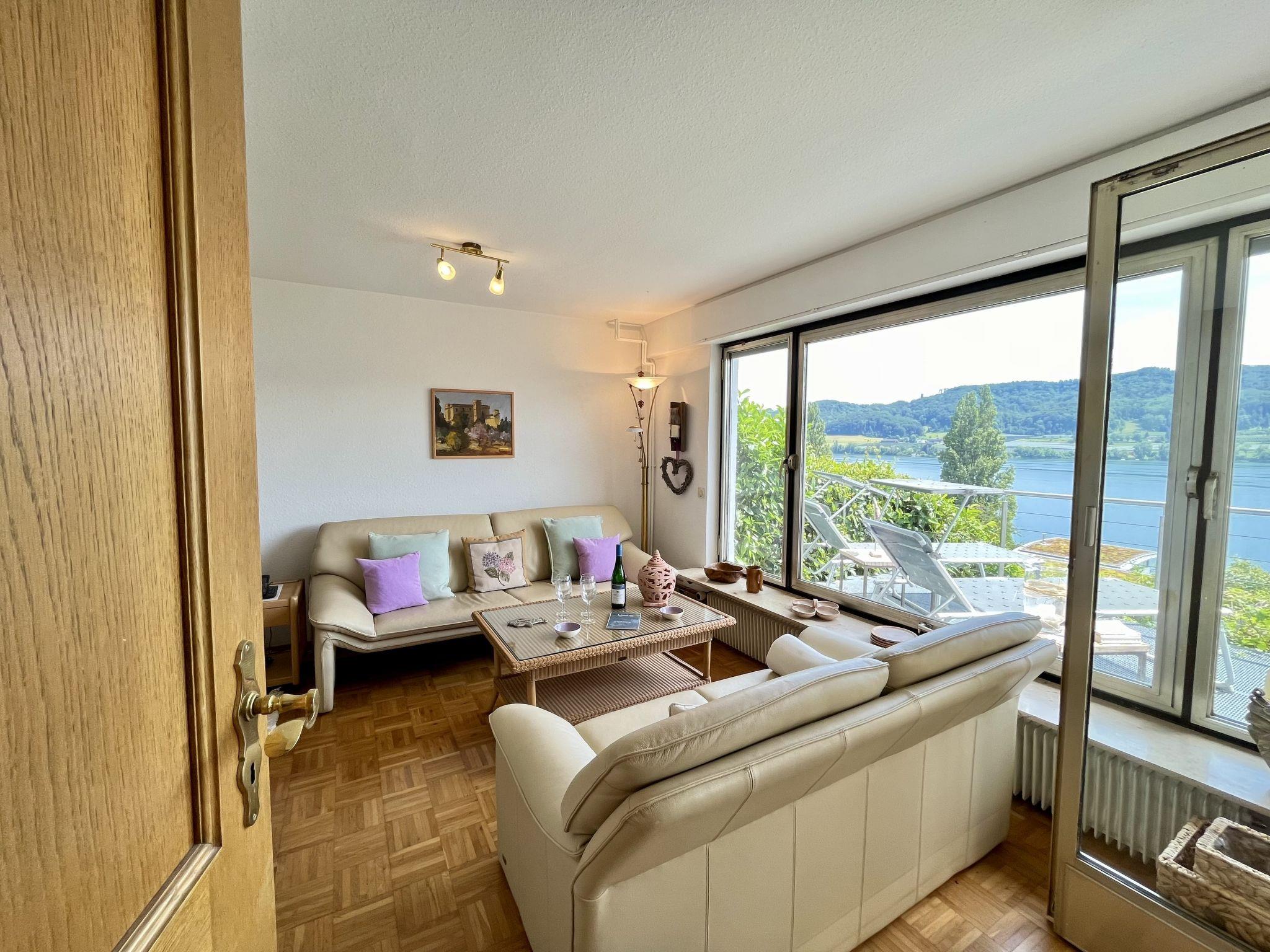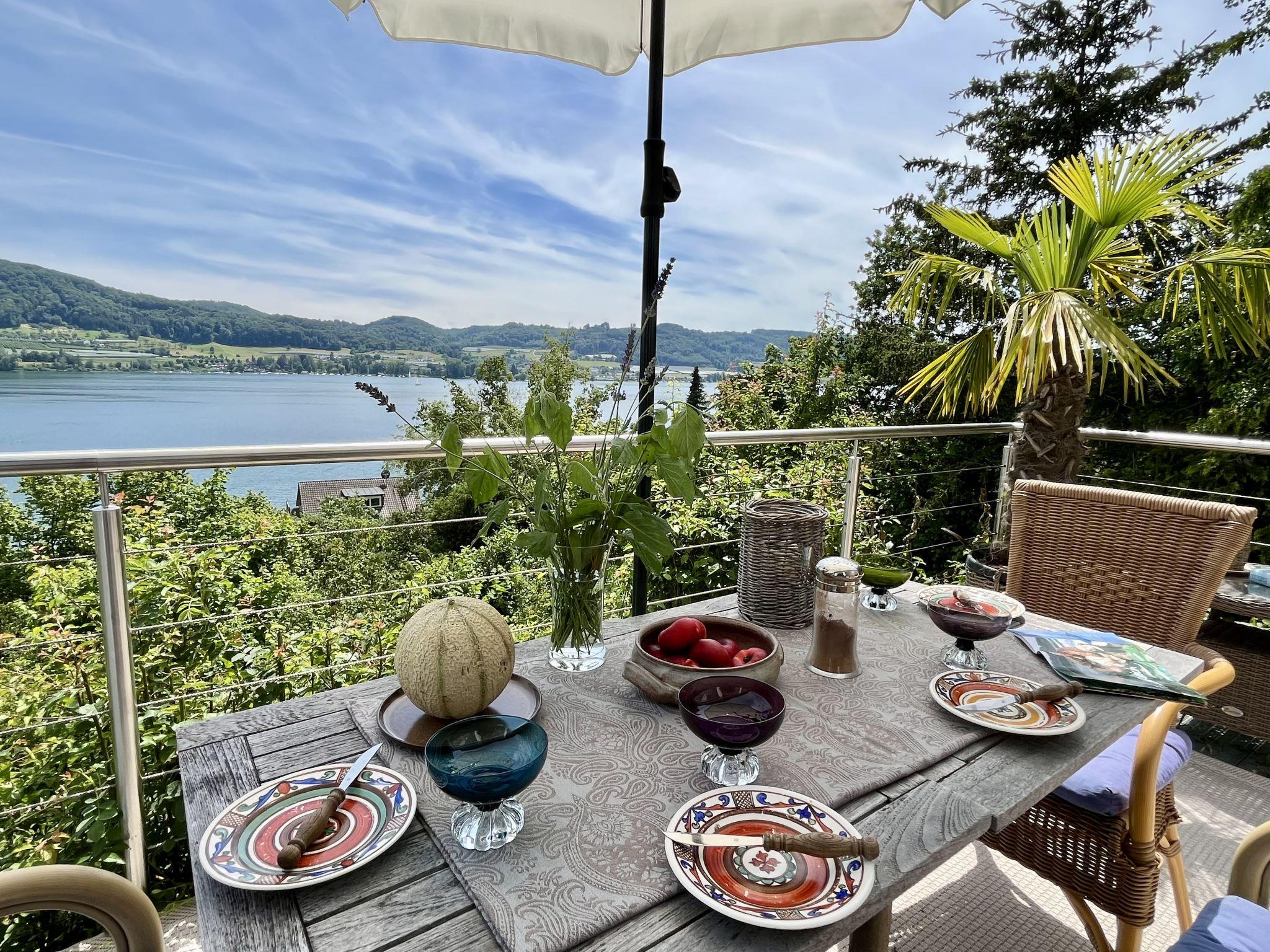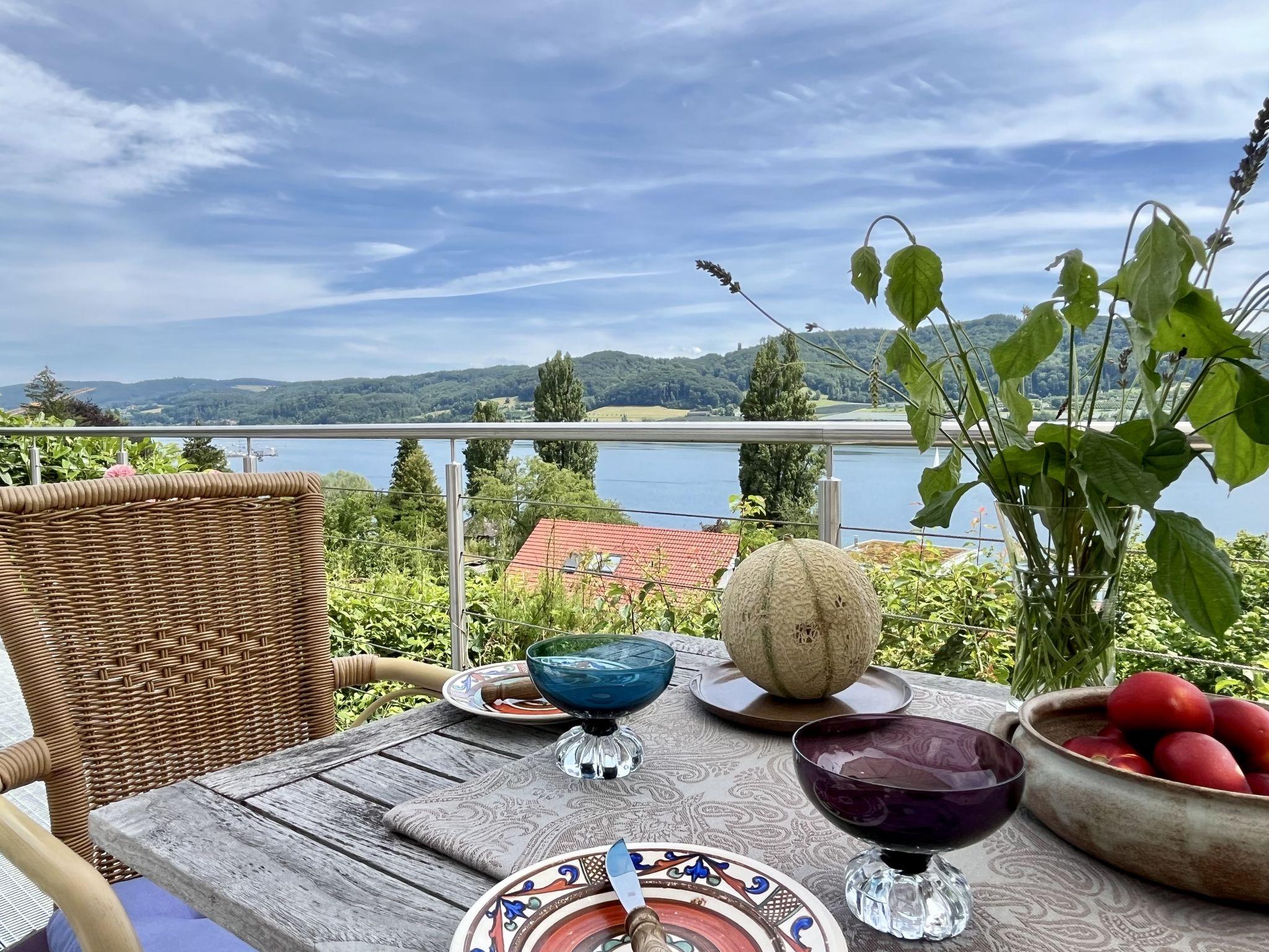 "Seepanorama", 4-room semi-detached house 90 m2 on 3 levels. Bright, partly renovated in 2022, beautiful and cosy furnishings: living room with satellite TV (flat screen), hi-fi system. Walk-through room with dining table. Exit to the balcony, to the terrace. Open kitchen (oven, dishwasher, 4 ceramic glass hob hotplates, kettle, electric coffee machine). Bath/WC. Heating. On the lower ground floor: 1 double bedroom with 1 double bed (2 x 90 cm, length 200 cm). Walk-through room with 2 x 1 bunk beds (90 cm, length 200 cm), hand-basin. Upper floor: 1 double bedroom with 1 double bed (180 cm, length 200 cm). Large balcony, south facing position, large terrace, south facing position and west facing position. Terrace furniture, balcony furniture, electric barbecue (portable), deck chairs (2). Marvellous view of the lake. Facilities: washing machine, dryer, hair dryer. Internet (WiFi, free). Parking at the house. Please note: not suitable for small children. Non-smoking house. Smoke alarm, fire extinguisher. For reasons of space, the oven, washing machine and tumble dryer are located in the basement of the house. Bed layout is flexible. There are more sleeping options available than the maximum number of people allowed which may, however, not be exceeded.