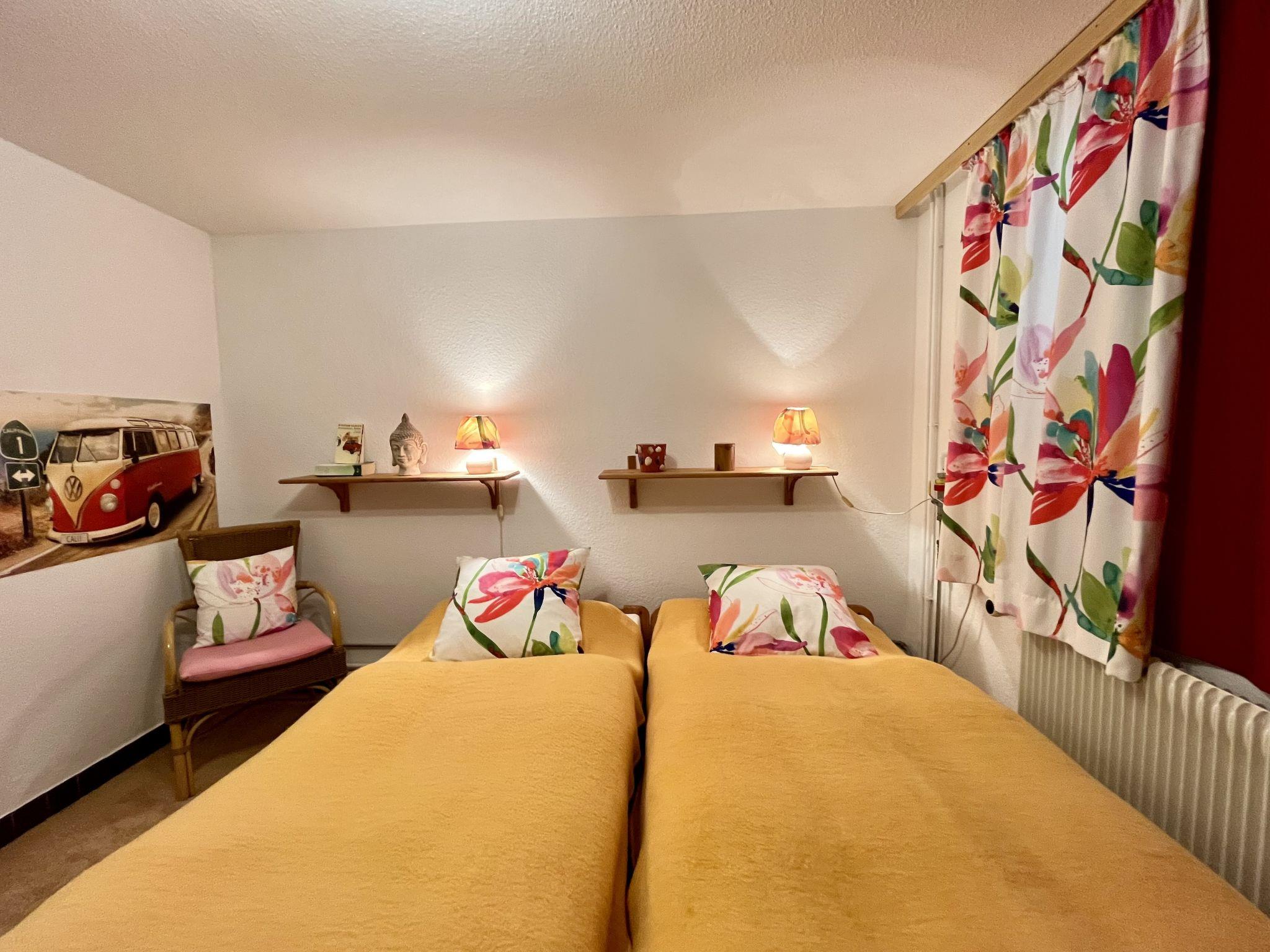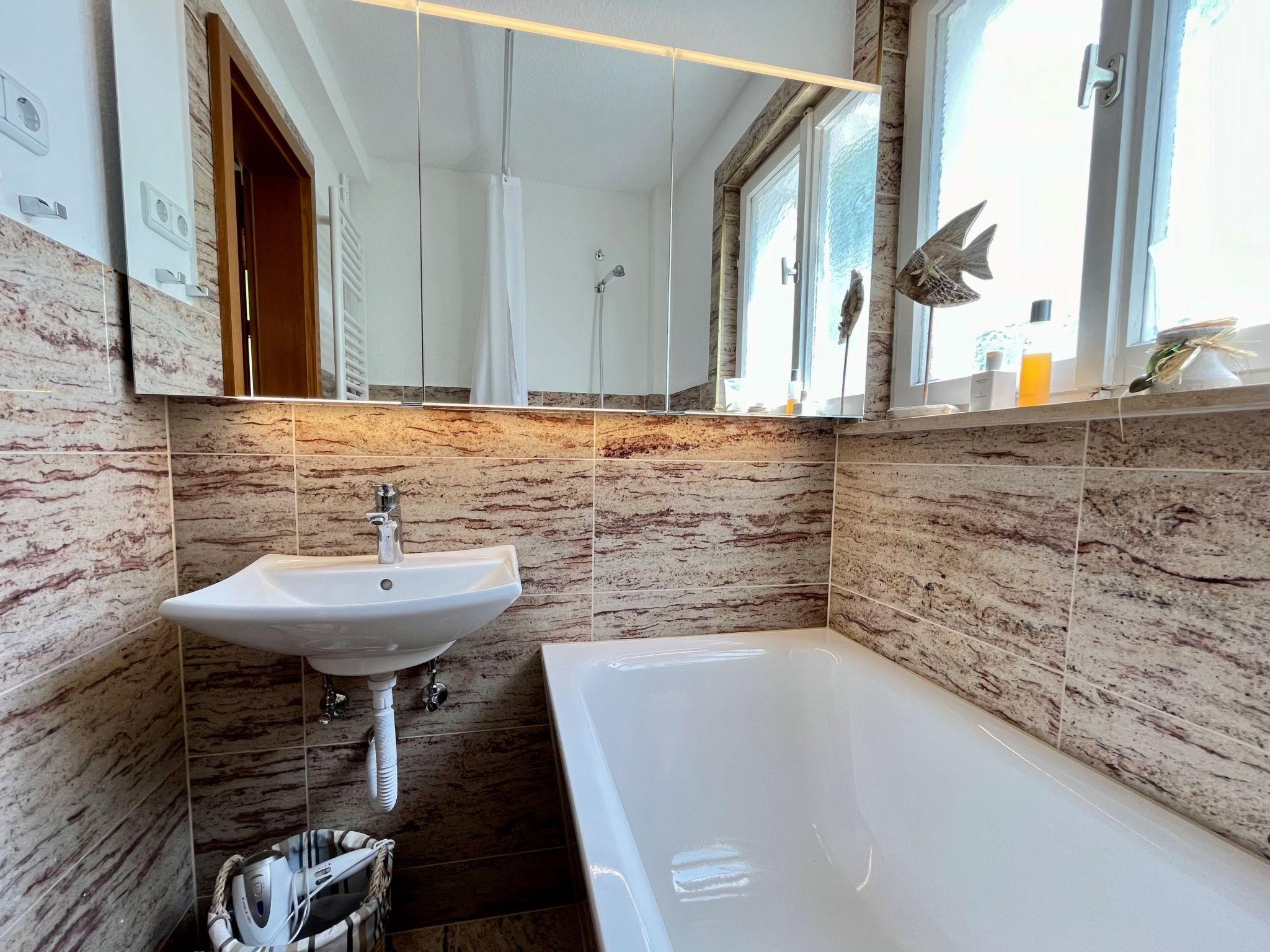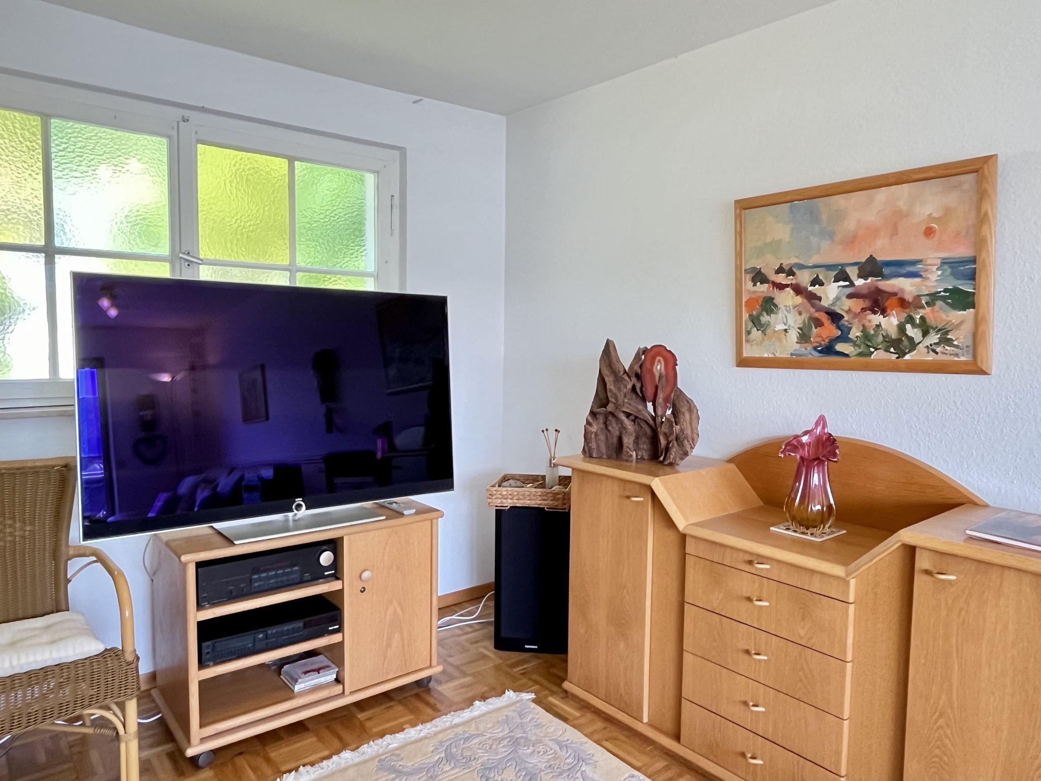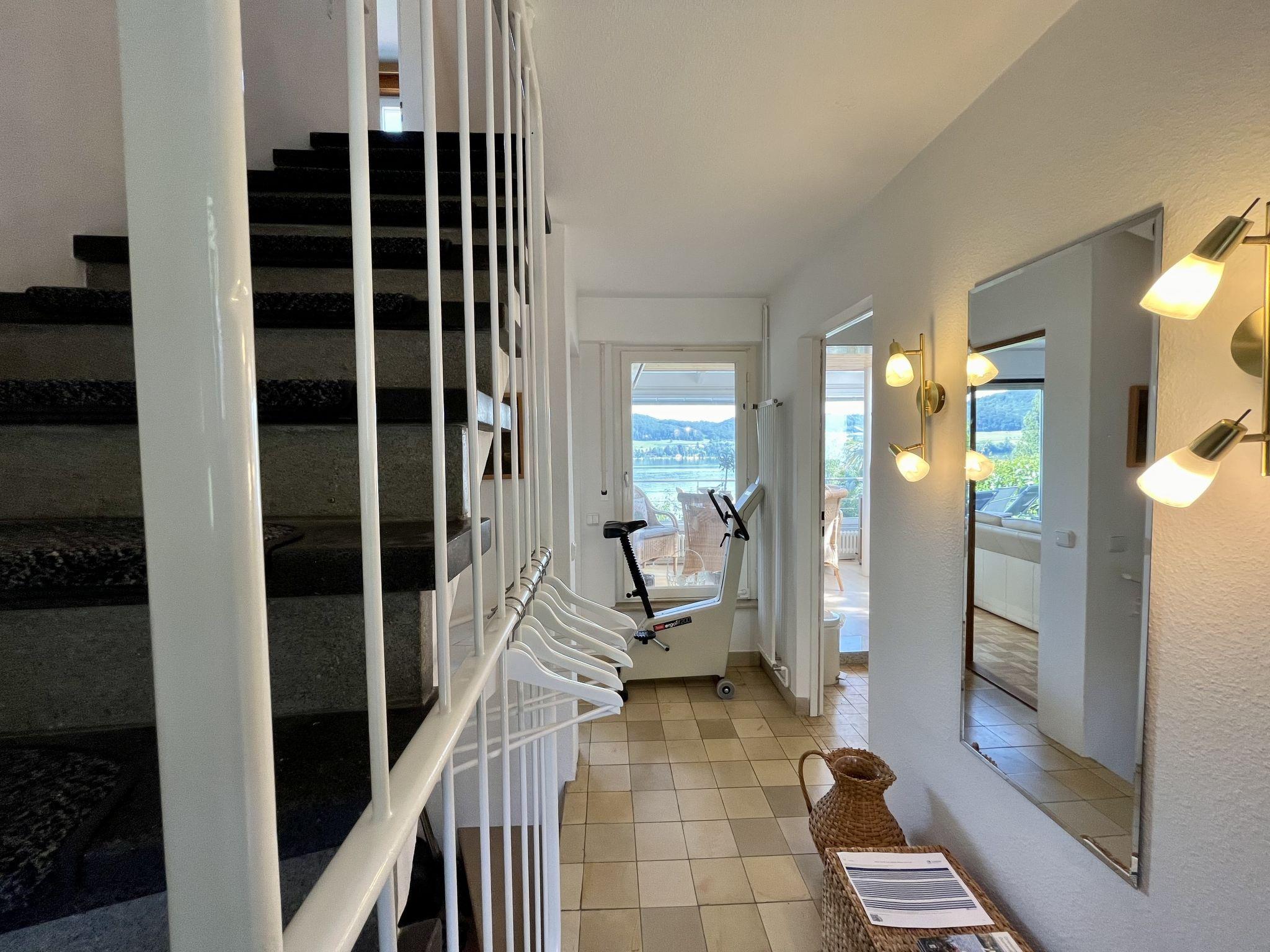"Seepanorama", 4-room semi-detached house 90 m2 on 3 levels. Bright, partly renovated in 2022, beautiful and cosy furnishings: living room with satellite TV (flat screen), hi-fi system. Walk-through room with dining table. Exit to the balcony, to the terrace. Open kitchen (oven, dishwasher, 4 ceramic glass hob hotplates, kettle, electric coffee machine). Bath/WC. Heating. On the lower ground floor: 1 double bedroom with 1 double bed (2 x 90 cm, length 200 cm). Walk-through room with 2 x 1 bunk beds (90 cm, length 200 cm), hand-basin. Upper floor: 1 double bedroom with 1 double bed (180 cm, length 200 cm). Large balcony, south facing position, large terrace, south facing position and west facing position. Terrace furniture, balcony furniture, electric barbecue (portable), deck chairs (2). Marvellous view of the lake. Facilities: washing machine, dryer, hair dryer. Internet (WiFi, free). Parking at the house. Please note: not suitable for small children. Non-smoking house. Smoke alarm, fire extinguisher. For reasons of space, the oven, washing machine and tumble dryer are located in the basement of the house. Bed layout is flexible. There are more sleeping options available than the maximum number of people allowed which may, however, not be exceeded.