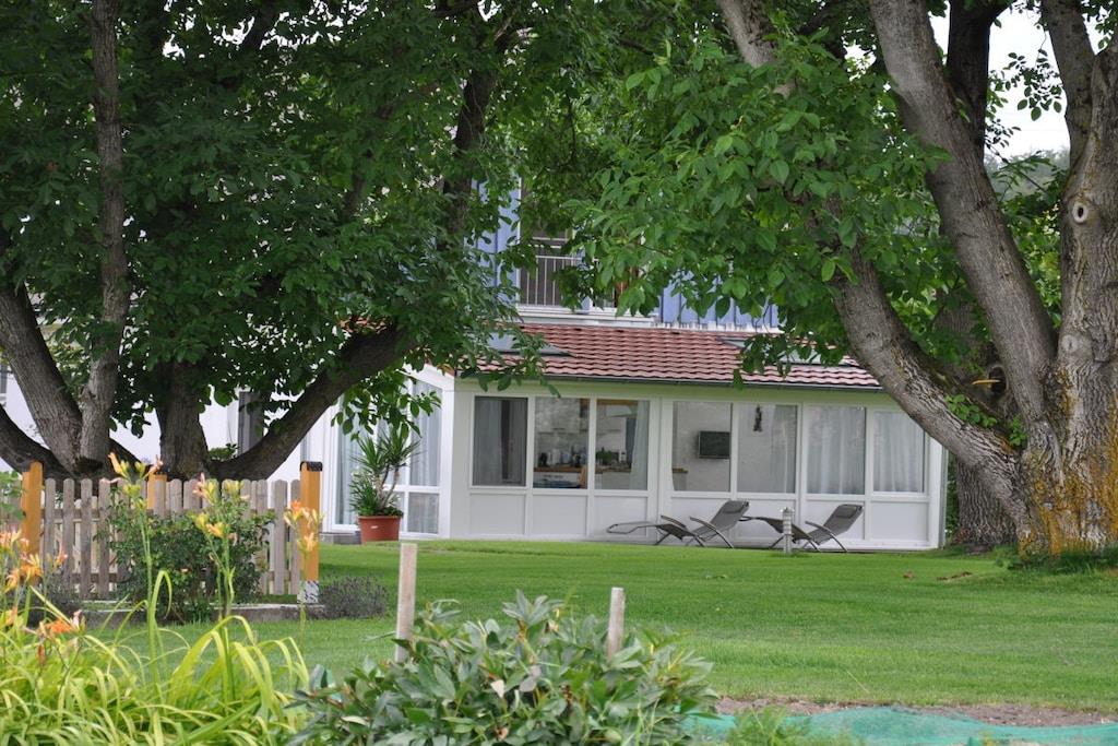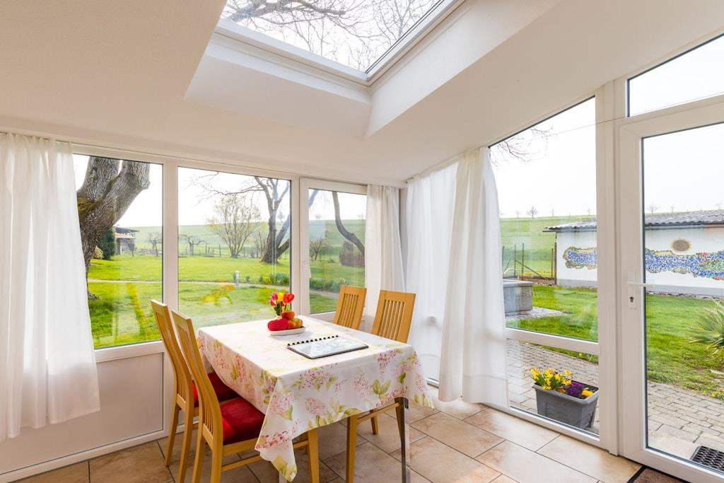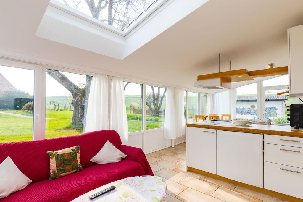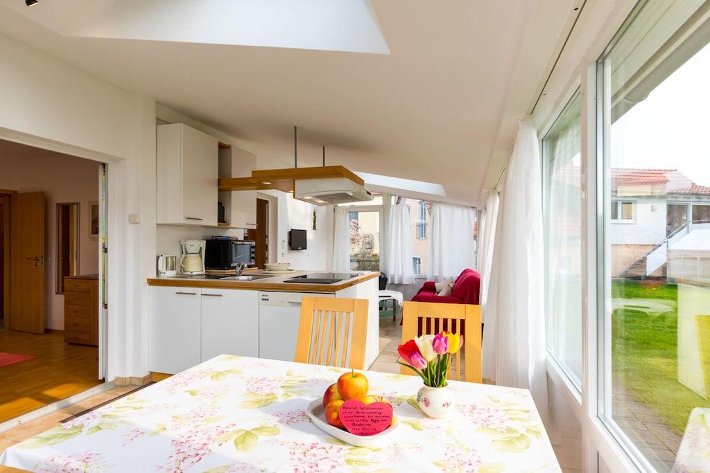 „Ankommen und wohlfühlen!“ lautet hier das Motto. Helle Räume, hochwertige Materialien, sowie das Zusammenspiel von Komfort und sehr guter Funktionalität beeindrucken in dieser schönen Wohnung die eigentlich eher ein kleines freistehendes Ferienhäuschen ist. Beim Betreten schweift der Blick unwillkürlich durch den offenen Wohnraum mit dem schönen luftig-hellen Wintergarten, der diesem Raum einen besonderen Flair verleiht. Integriert ist eine große in ihrer Funktionalität sehr hochwertige Küche mit gemütlichem Essplatz. Zum Relaxen findet sich eine einladende Sitzecke. Mit zwei großzügig gestalteten und sehr gemütlichen Schlafzimmern ist die Ferienwohnung Nussbaum besonders für Familien geeignet. Zur Wohnung gehört ein sehr schöner Fre