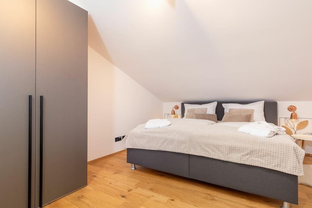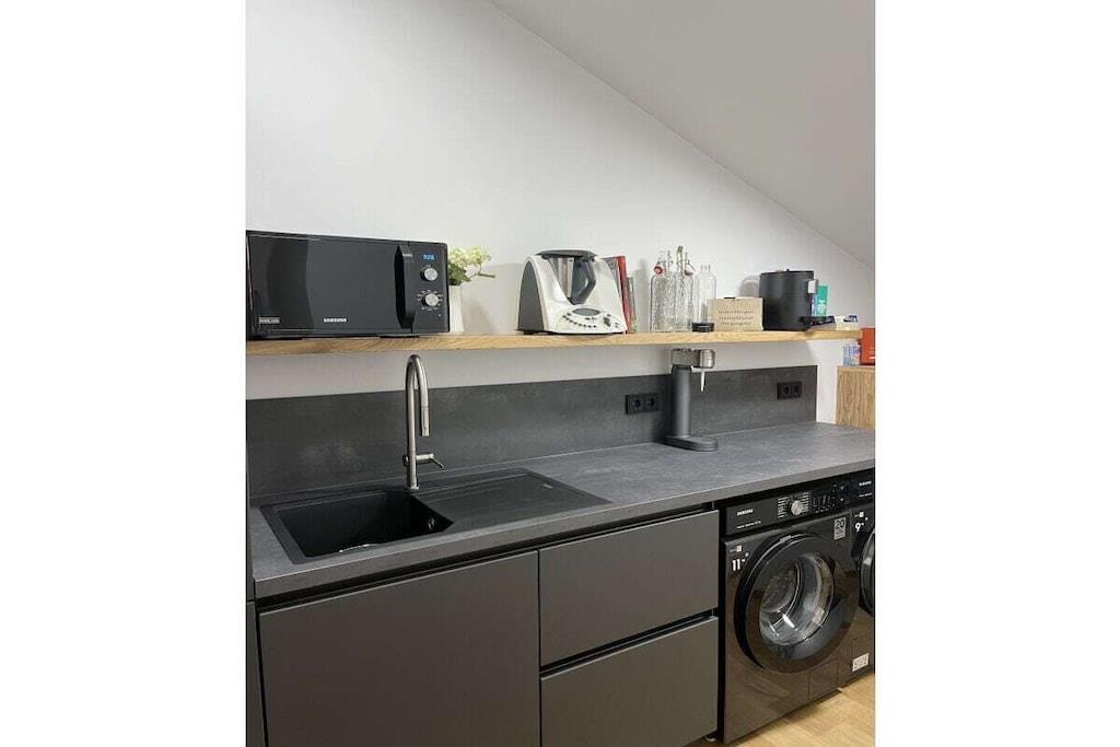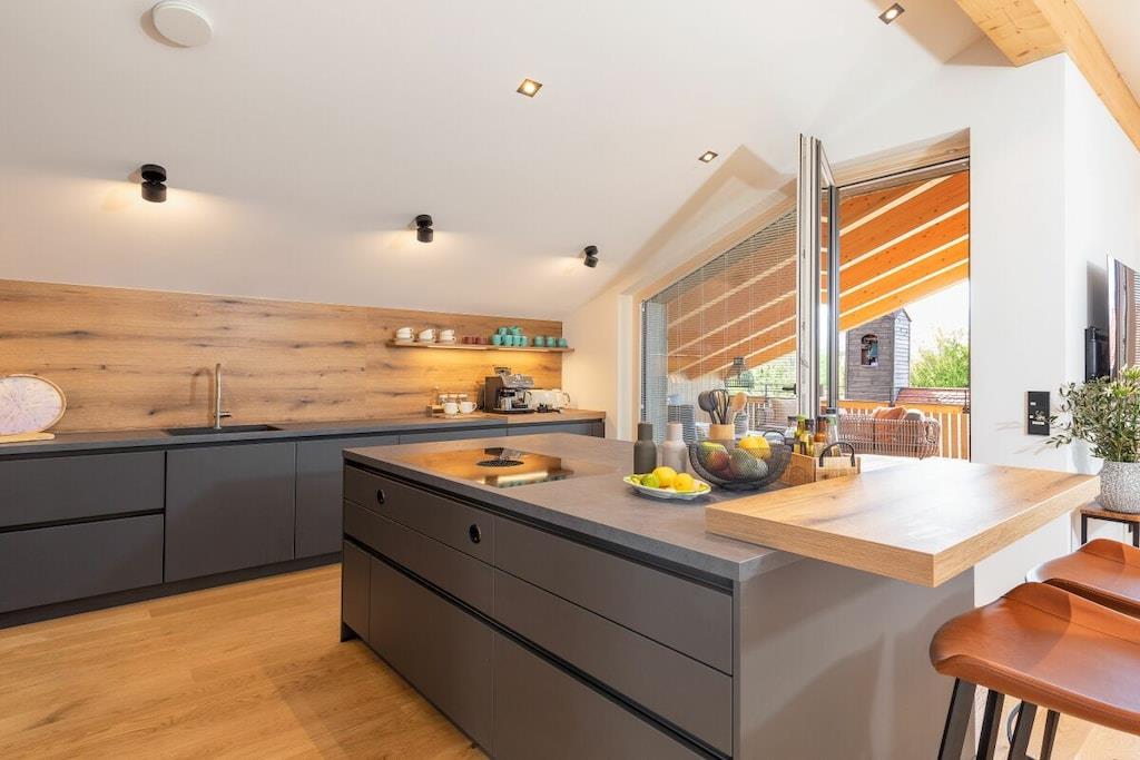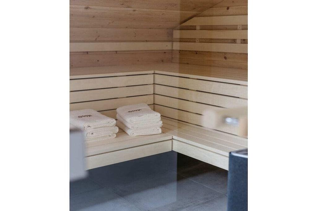 Refrigerator, dishwasher, freezer compartments, coffee machines, toaster, kettle, microwave, Thermomix T31 (incl. cookbooks), stove with Bora extractor, egg cooker, soda maker, dishes enough for 12 people. In addition, 65 inch OLED TV (electrically swiveling), washing machine and dryer are available free of charge. Enjoy the loggia with a corner couch, two comfortable armchairs, two sun loungers and plenty of space, atmosphere and mountain views to enjoy the day and end the evening. Exclusive TYLA sauna made of pine wood. Sufficient towels, floor mats, toilet paper, hair dryer, two bedrooms, carport/parking space, fitness room.