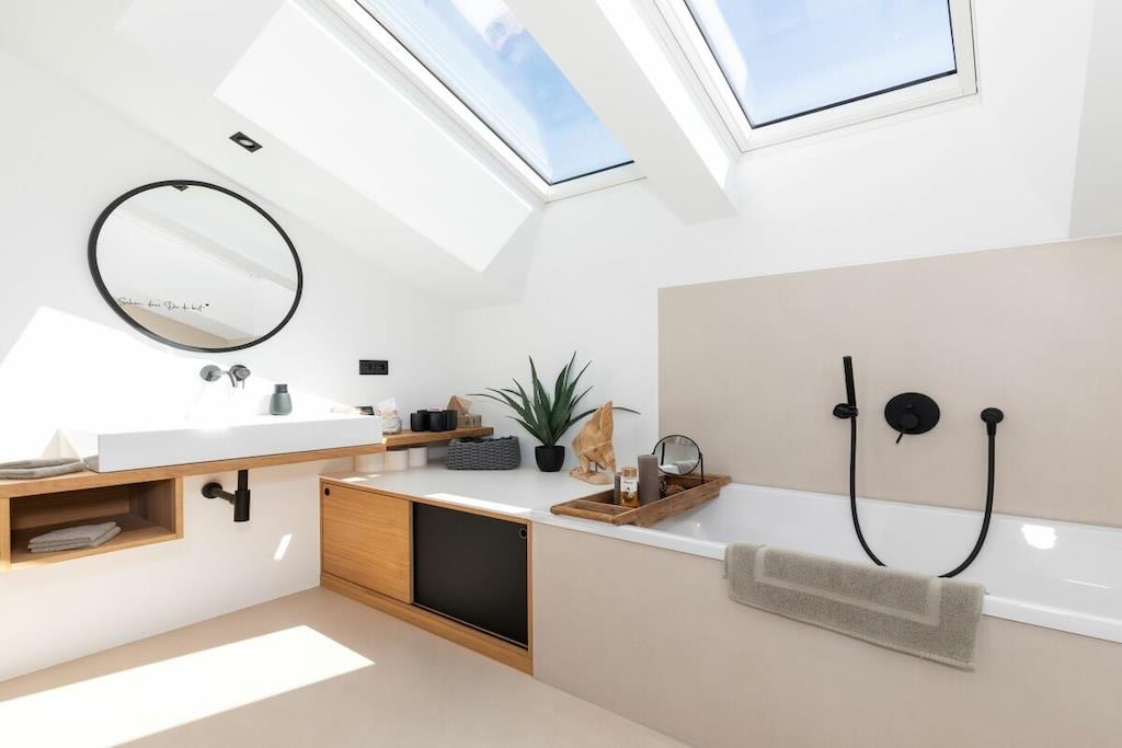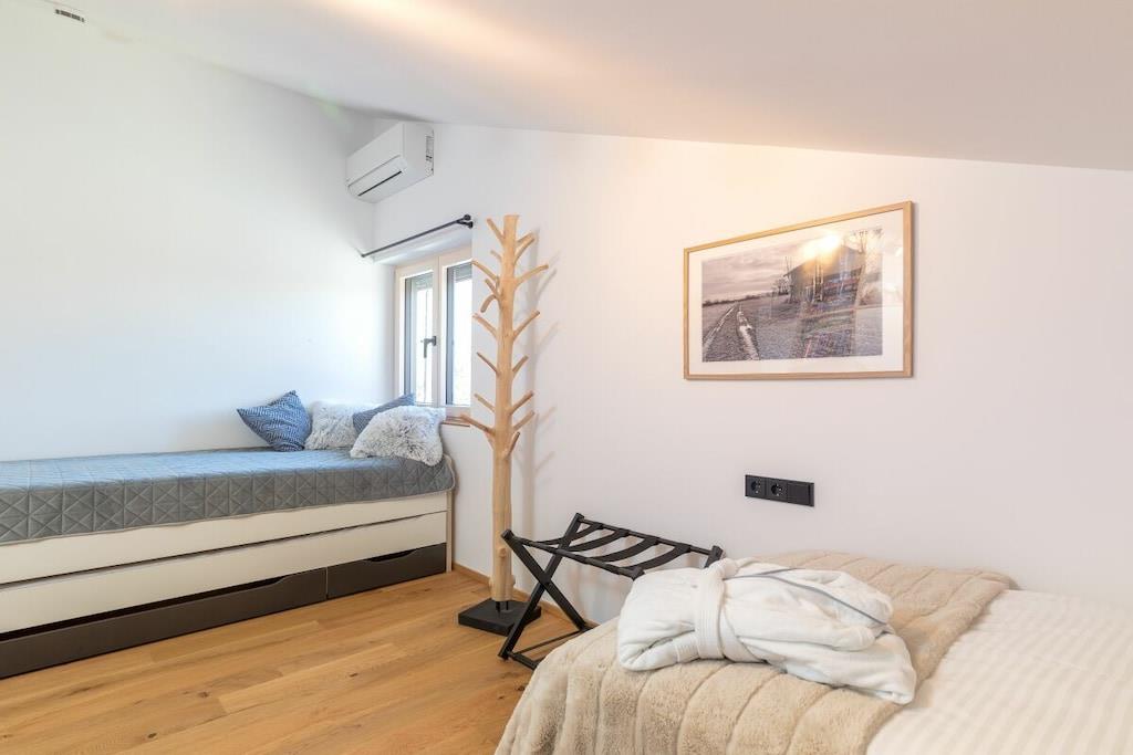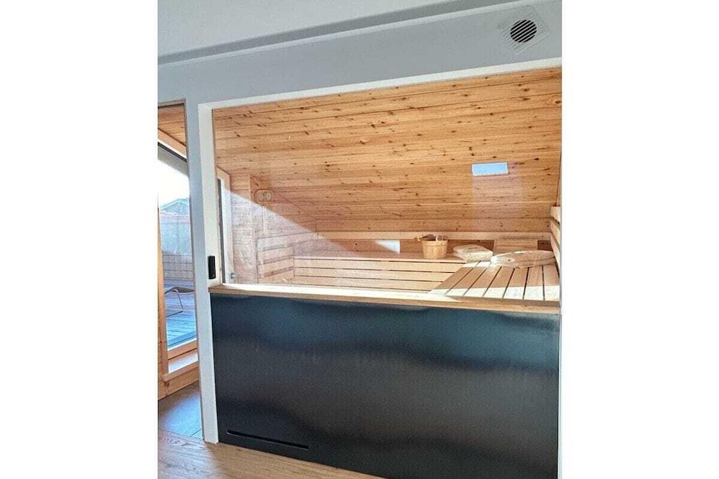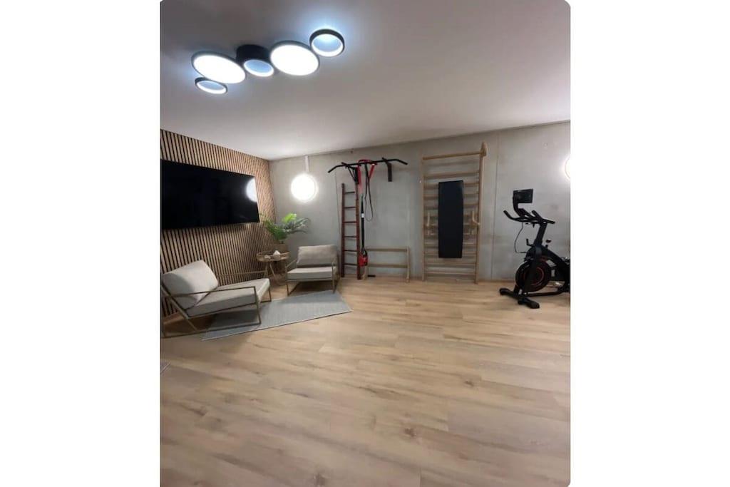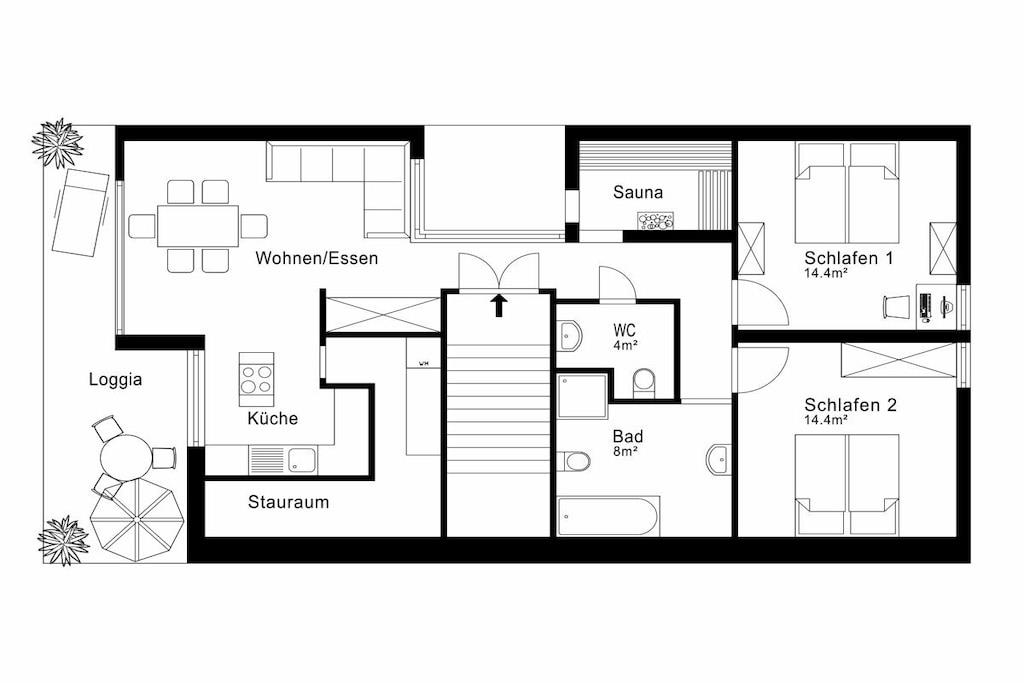 Refrigerator, dishwasher, freezer compartments, coffee machines, toaster, kettle, microwave, Thermomix T31 (incl. cookbooks), stove with Bora extractor, egg cooker, soda maker, dishes enough for 12 people. In addition, 65 inch OLED TV (electrically swiveling), washing machine and dryer are available free of charge. Enjoy the loggia with a corner couch, two comfortable armchairs, two sun loungers and plenty of space, atmosphere and mountain views to enjoy the day and end the evening. Exclusive TYLA sauna made of pine wood. Sufficient towels, floor mats, toilet paper, hair dryer, two bedrooms, carport/parking space, fitness room.