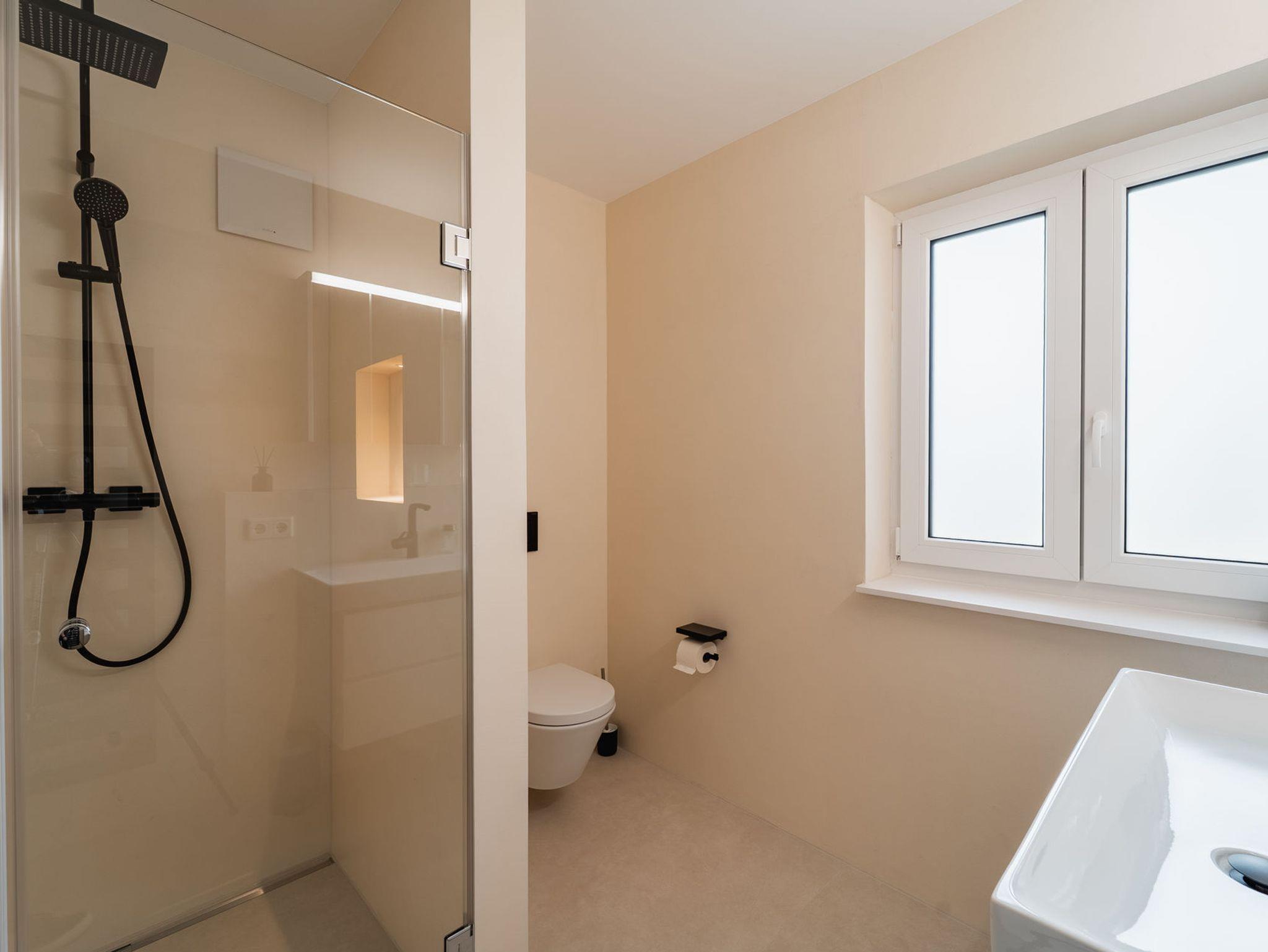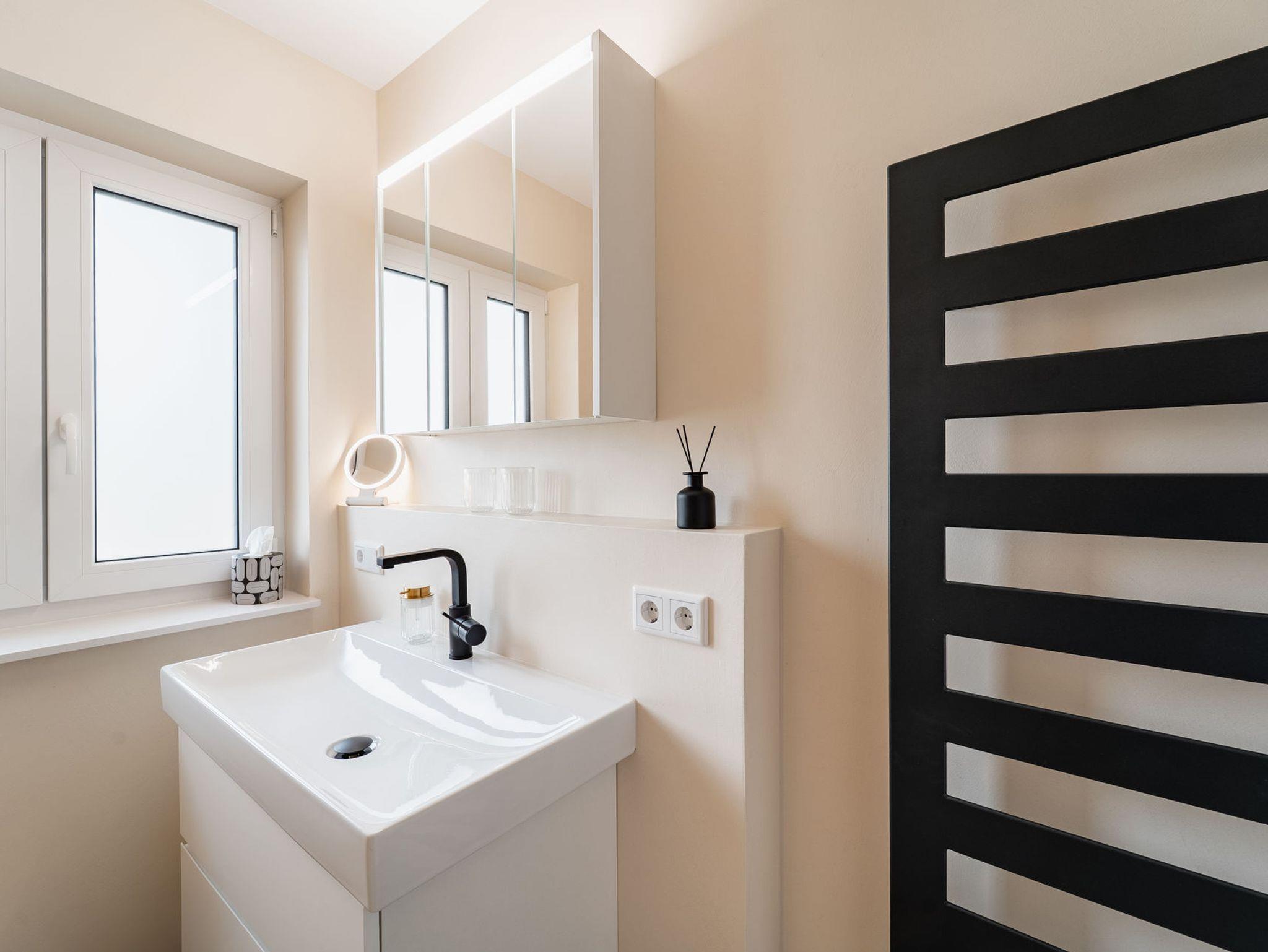 • Modernes Bad mit großzügiger Regendusche, Handtuchwärmer und Föhn