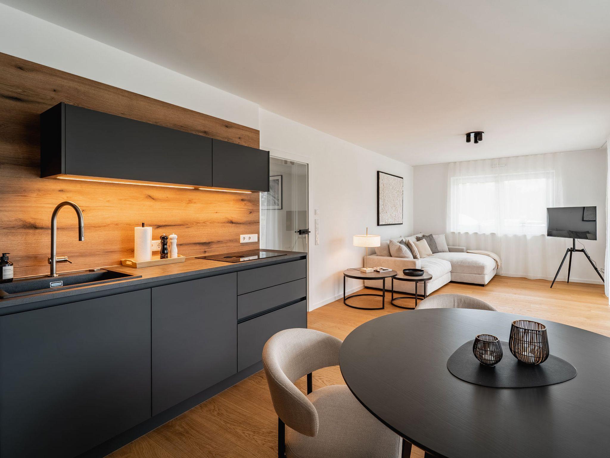 • Voll ausgestattete Design-Küche mit Backofen, Geschirrspüler und Kühlschrank