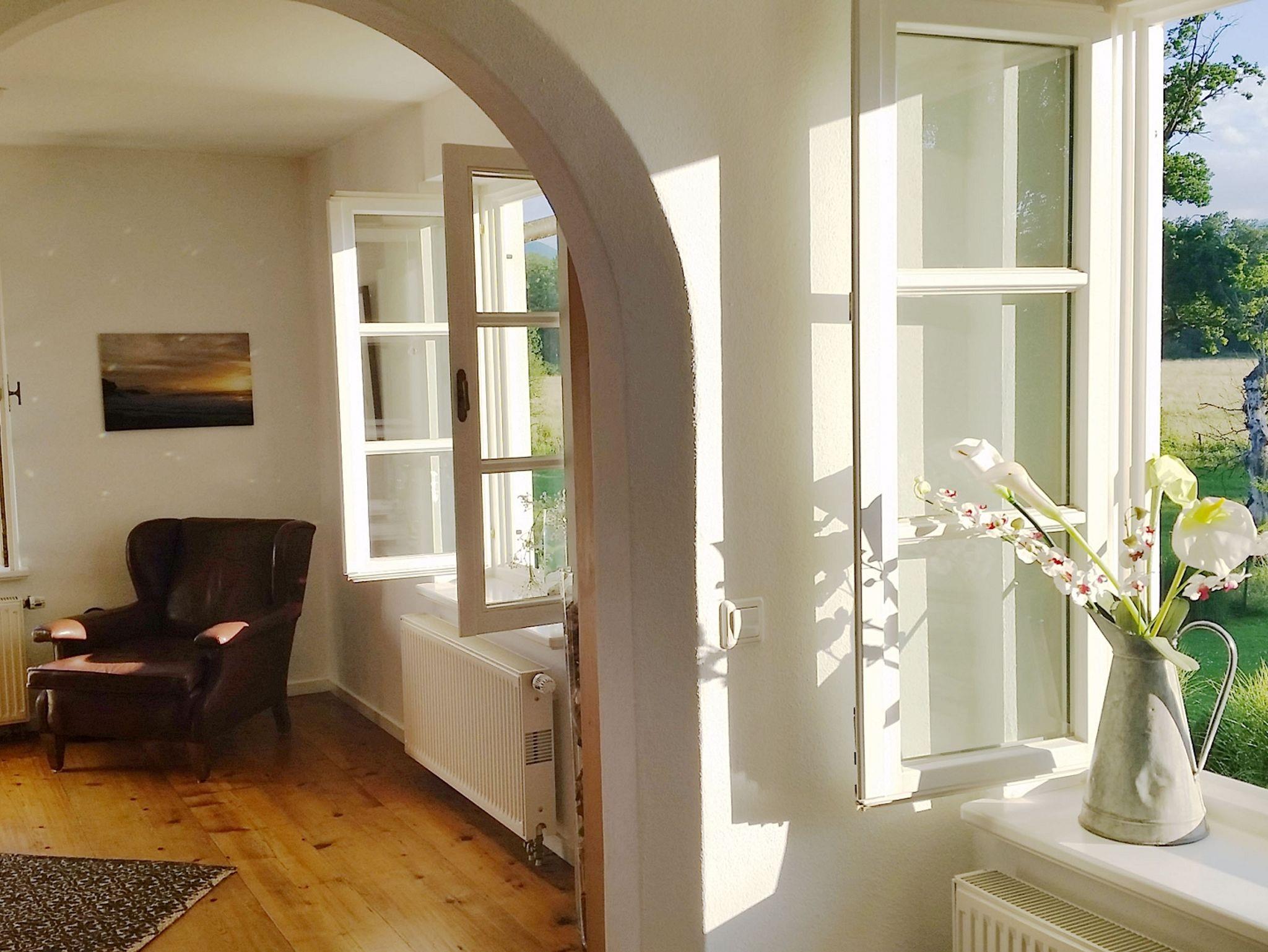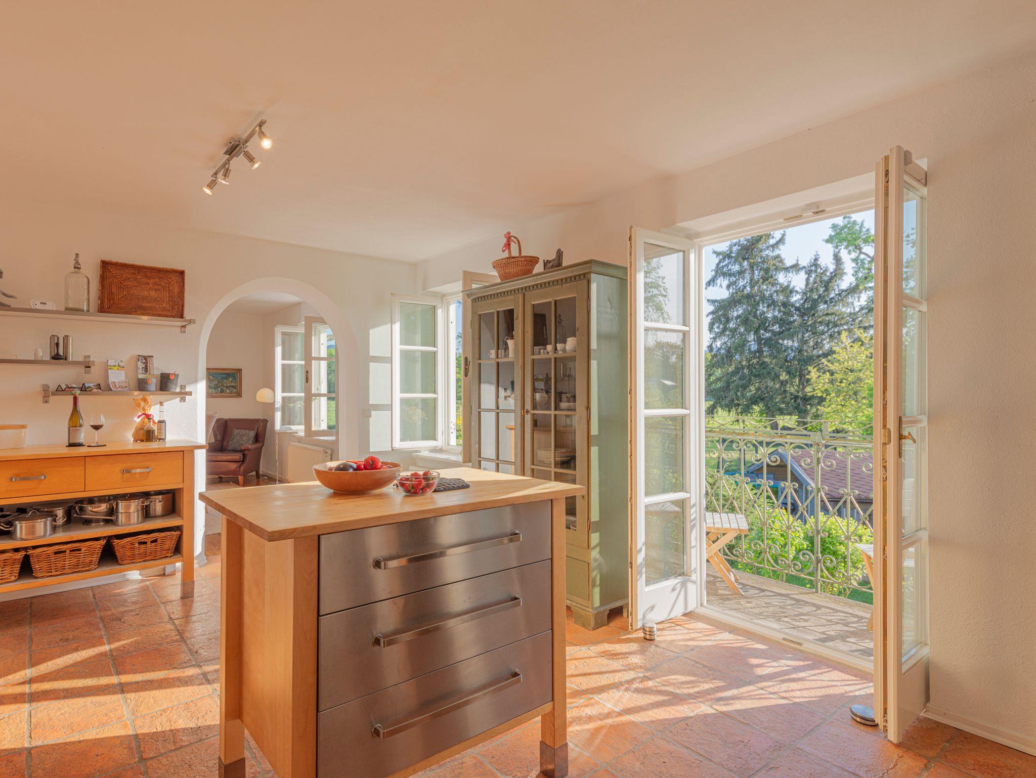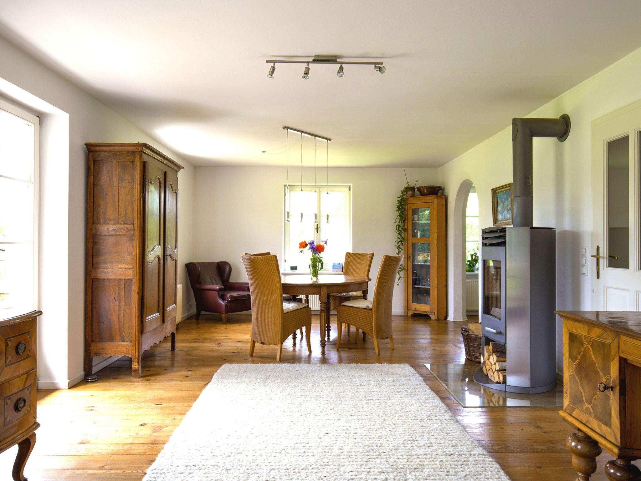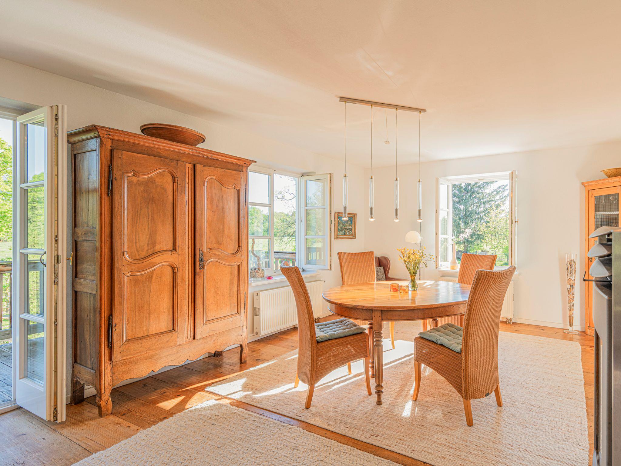 Der sonnige Wohn- Essbereich bietet eine gelungene Mischung aus antiken und modernen Möbeln. Direkt vom Wohnzimmer aus gelangen Sie auf den 20 m2 großen Holzbalkon. Für die kühleren Jahreszeiten schafft ein Kaminofen Behaglichkeit.