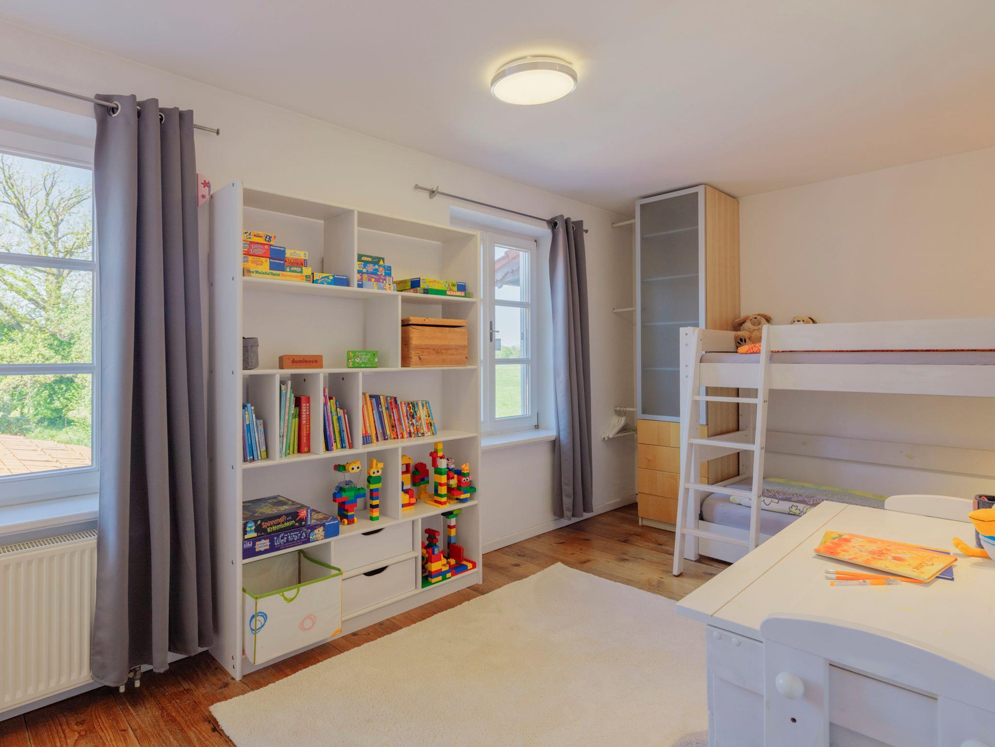 Erholen Sie sich in unserer 5-Sterne Ferienwohnung Chiemsee Sonne. Der sonnige Wohn- Essbereich besticht durch sein besonderes Ambiente, eine gelungene Mischung aus antiken und modernen Möbeln kombiniert mit einem alten Holzboden. Direkt vom Wohnzimmer aus gelangen Sie auf den 20 m2 großen Holzbalkon. Für die kühleren Jahreszeiten schafft ein Kaminofen Behaglichkeit. In der sehr umfangreich ausgestatteten Küche macht das Kochen Spaß! Das moderne Bad mit seiner Regendusche und Doppelbadewanne für 2 Personen lädt zum Entspannen ein. Auch ein separates WC mit Waschbecken fehlt nicht. Im Hauptschlafzimmer finden Sie ein großes, gemütliches 180-Doppelbett und viel Stauraum in den Schränken. Direkt nebenan befindet sich das Kinderzimmer mit Stockbett (90x200) und Kinderspielsachen.